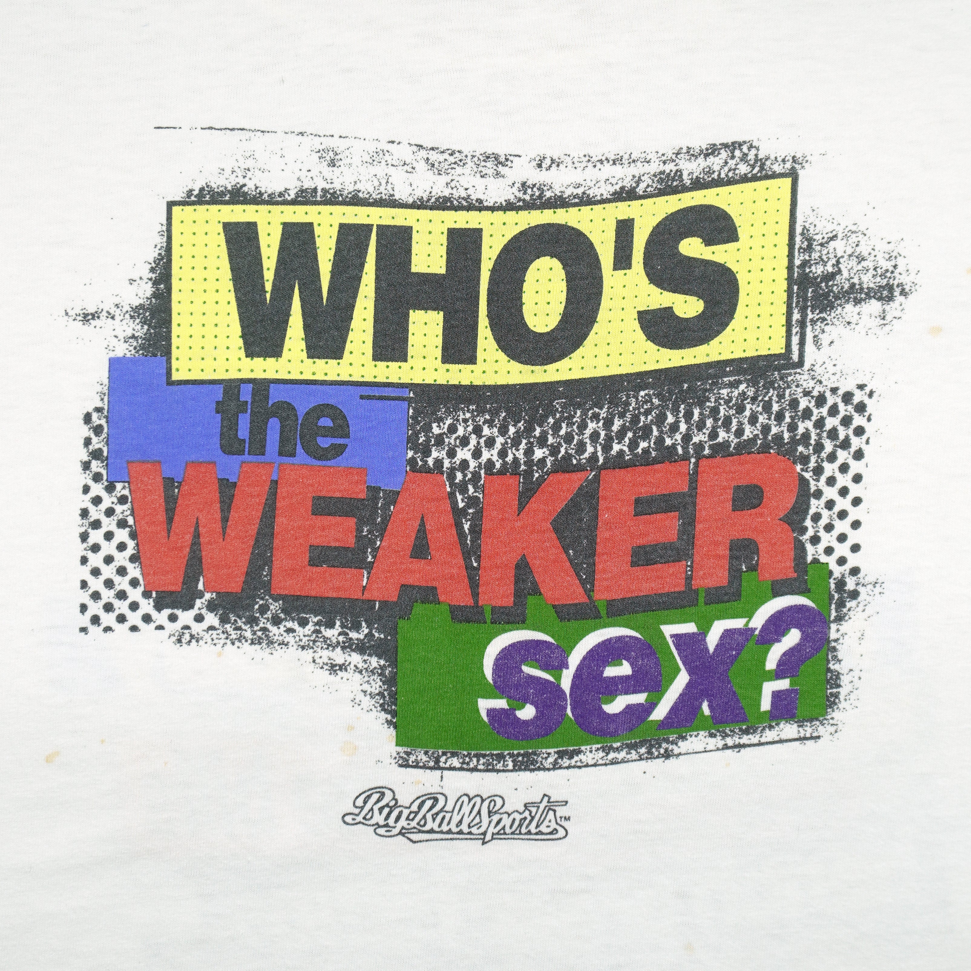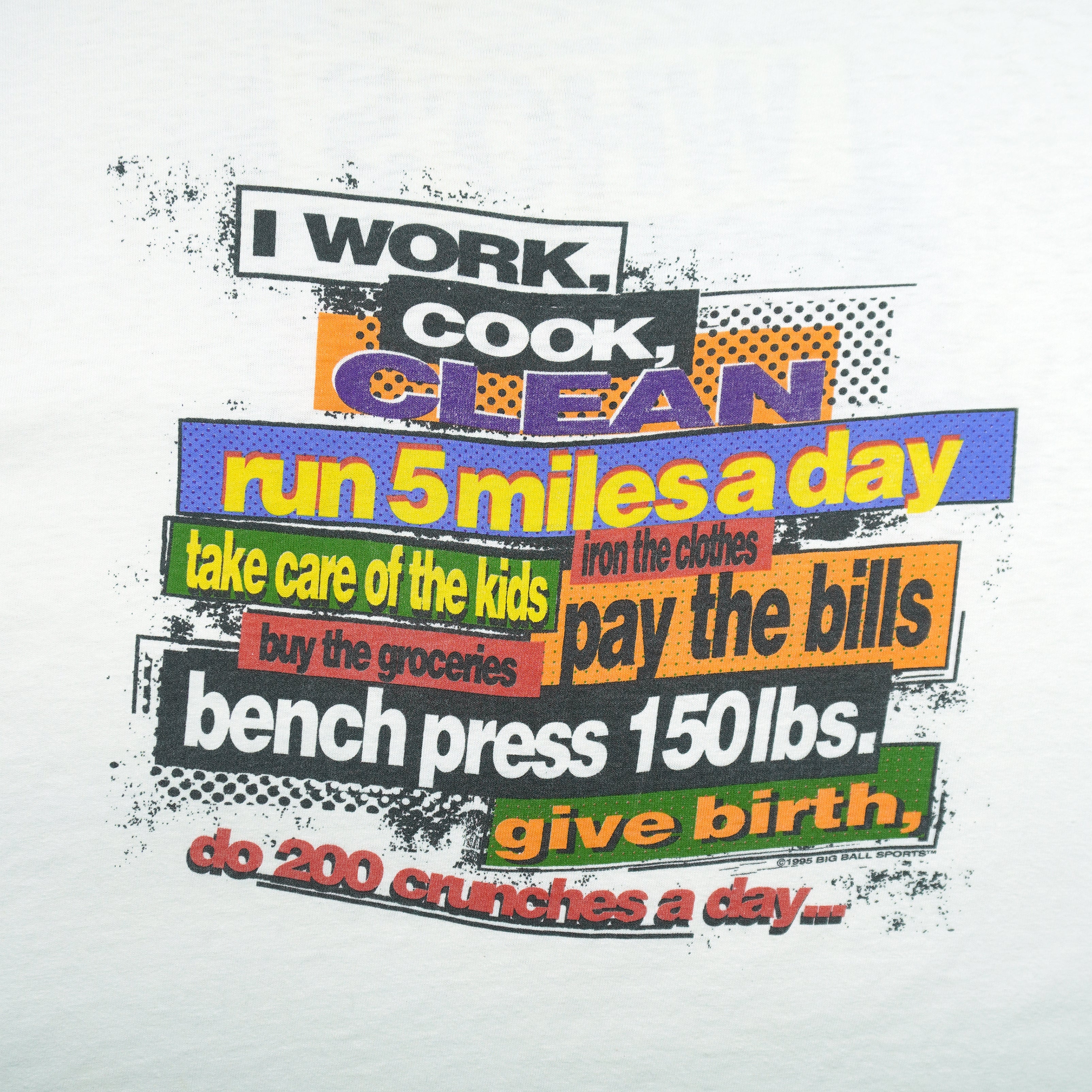 1990s Vintage Who’s The Weaker Sex? I Work, Cook, Clean Run 5 Miles A Day Single Stitch T-shirt. White in color, big spell-out on front, fits an X-large size with signs of wear minor, mark and is otherwise in very good  condition.