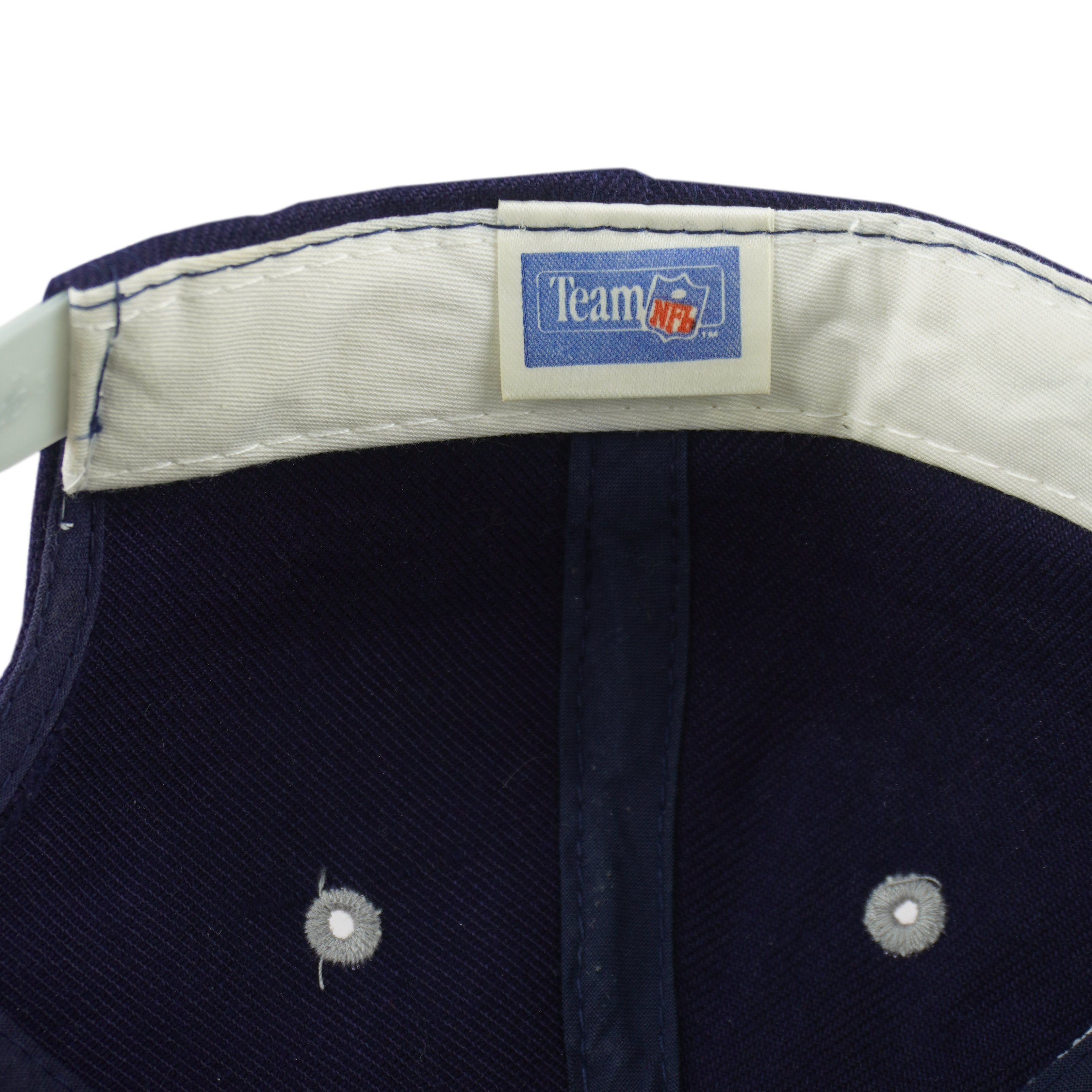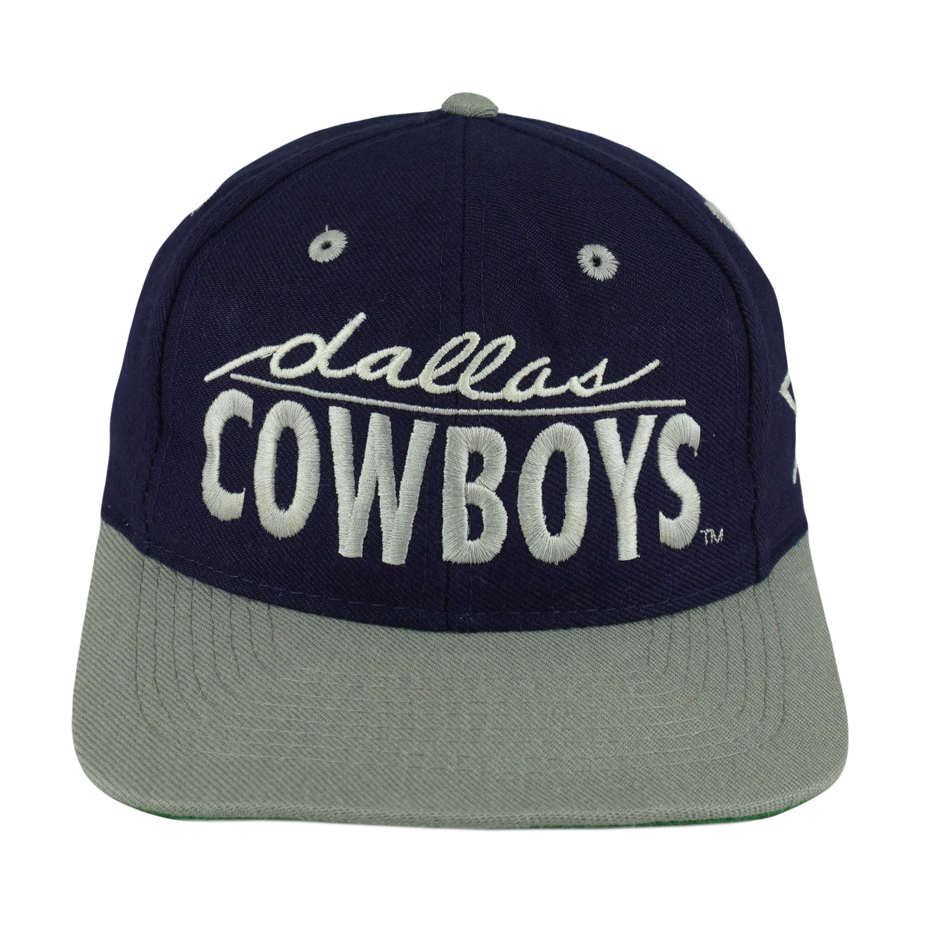 1990s Vintage NFL Dallas Cowboys Spell-Out Snapback Hat. Dark blue and grey in color, adjustable size with signs of wear, minor marks on the back also inside and is otherwise in very good condition.