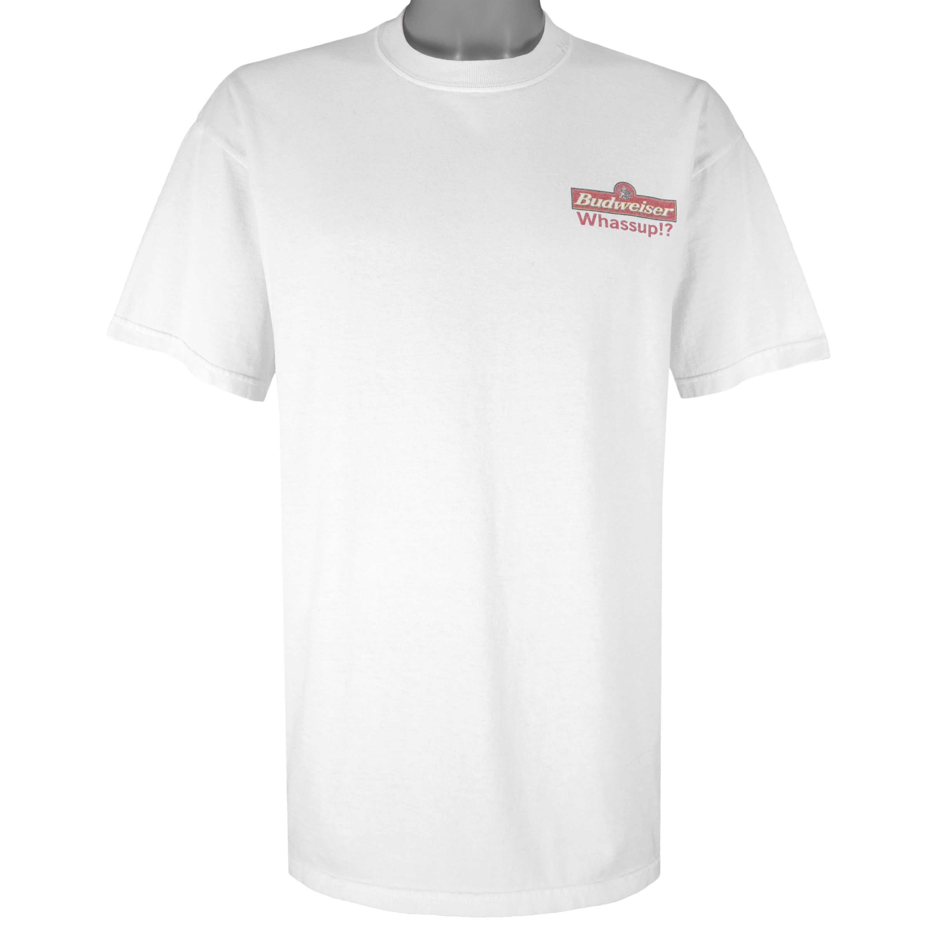 1990s Vintage Budweiser Whassup? Just Chilling Having A Bud T-Shirt by Anvil. White in color, fits X-large size and is in excellent condition.