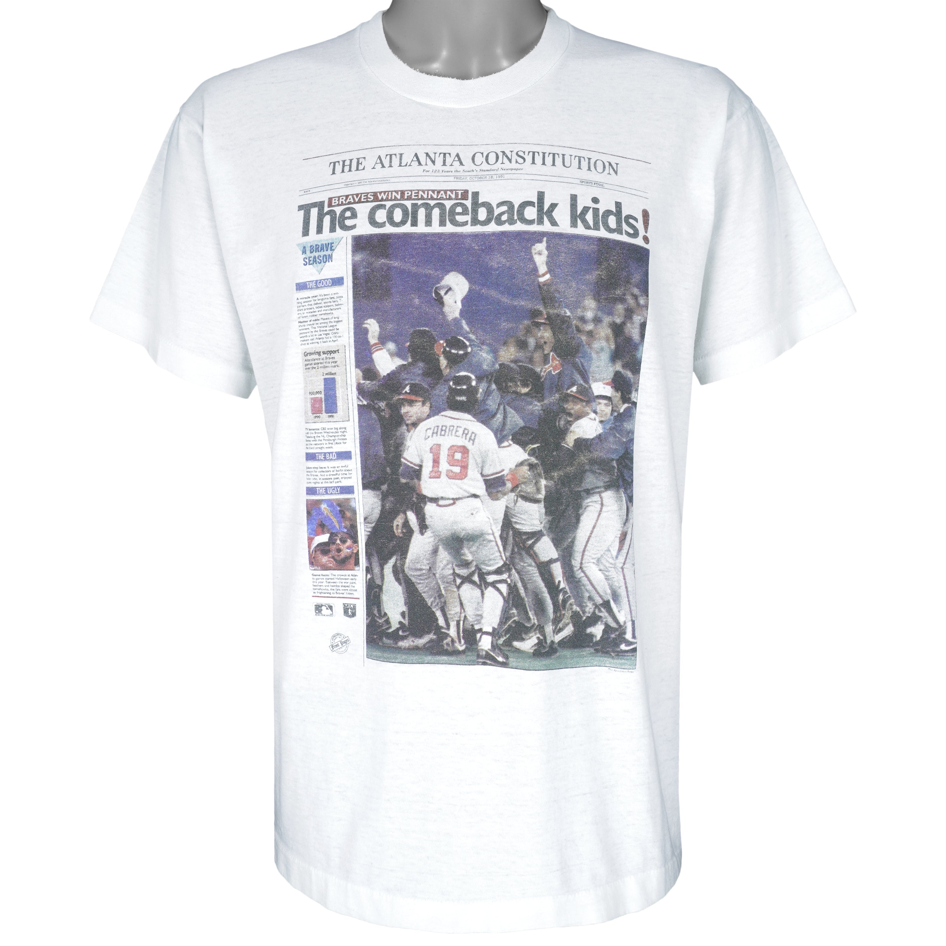 The Atlanta Constitutions front page from October 18, 1991, celebrating the Atlanta Braves becoming Western Division champs. This T-Shirt fits X-Large in size and is in excellent condition.
