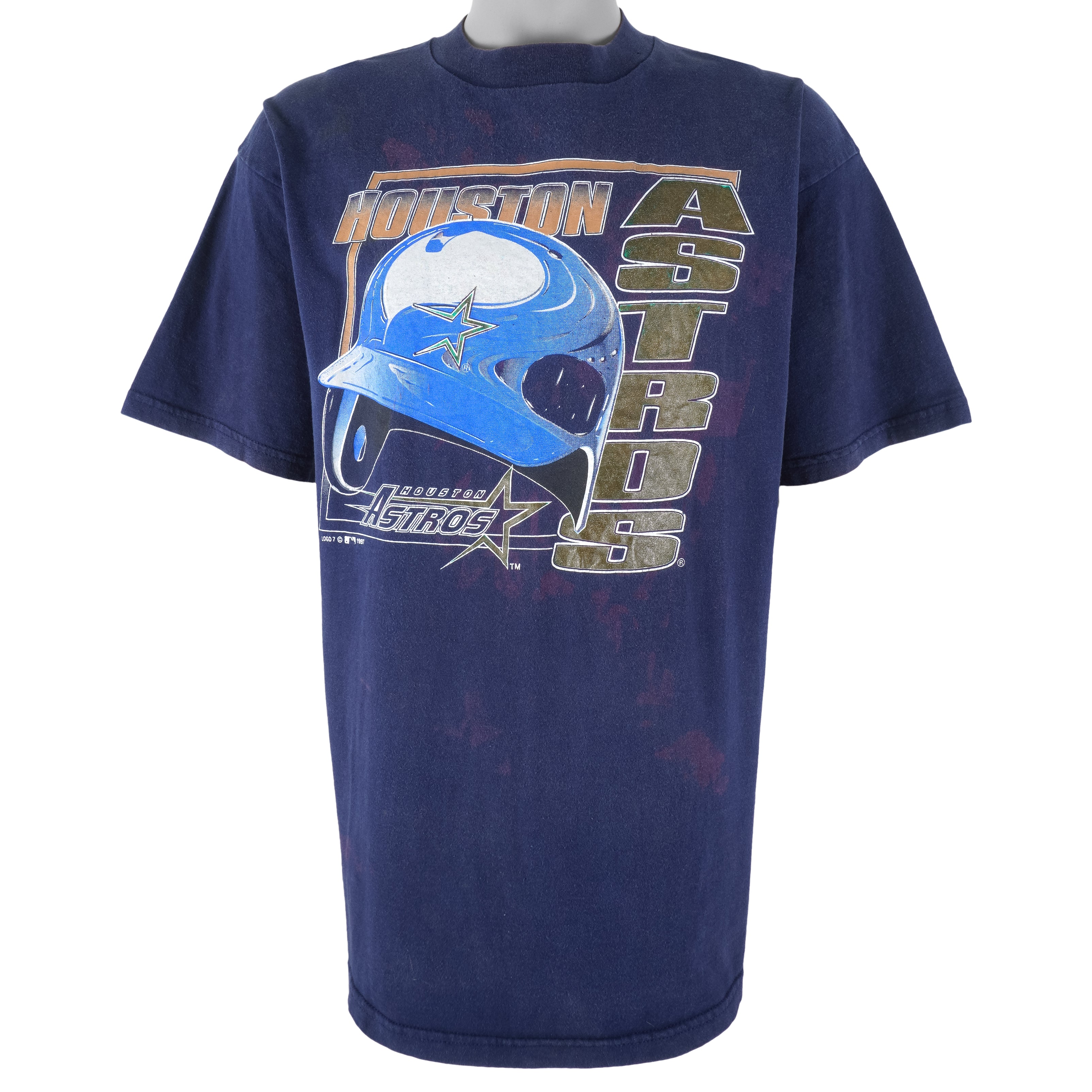 1997 Vintage MLB Houston Astros Helmet Spell-Out T-Shirt by Logo 7. Blue in color, fits X-large size and is in very good condition.