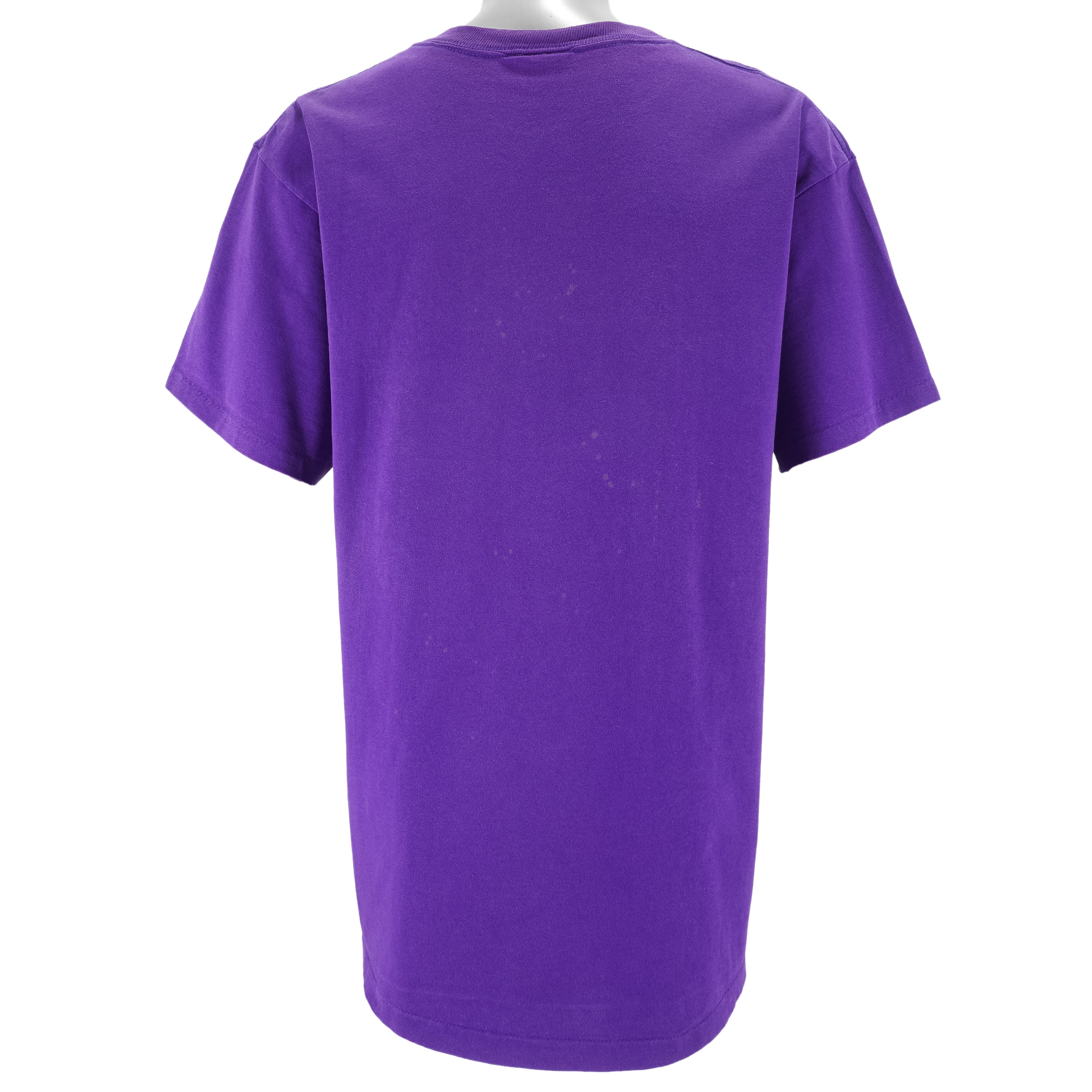1990s Vintage NBA Toronto Raptors Big Spell-Out Single Stitch T-Shirt by Ravens Athletic. Purple in color, fits X-large size and is in very good condition.