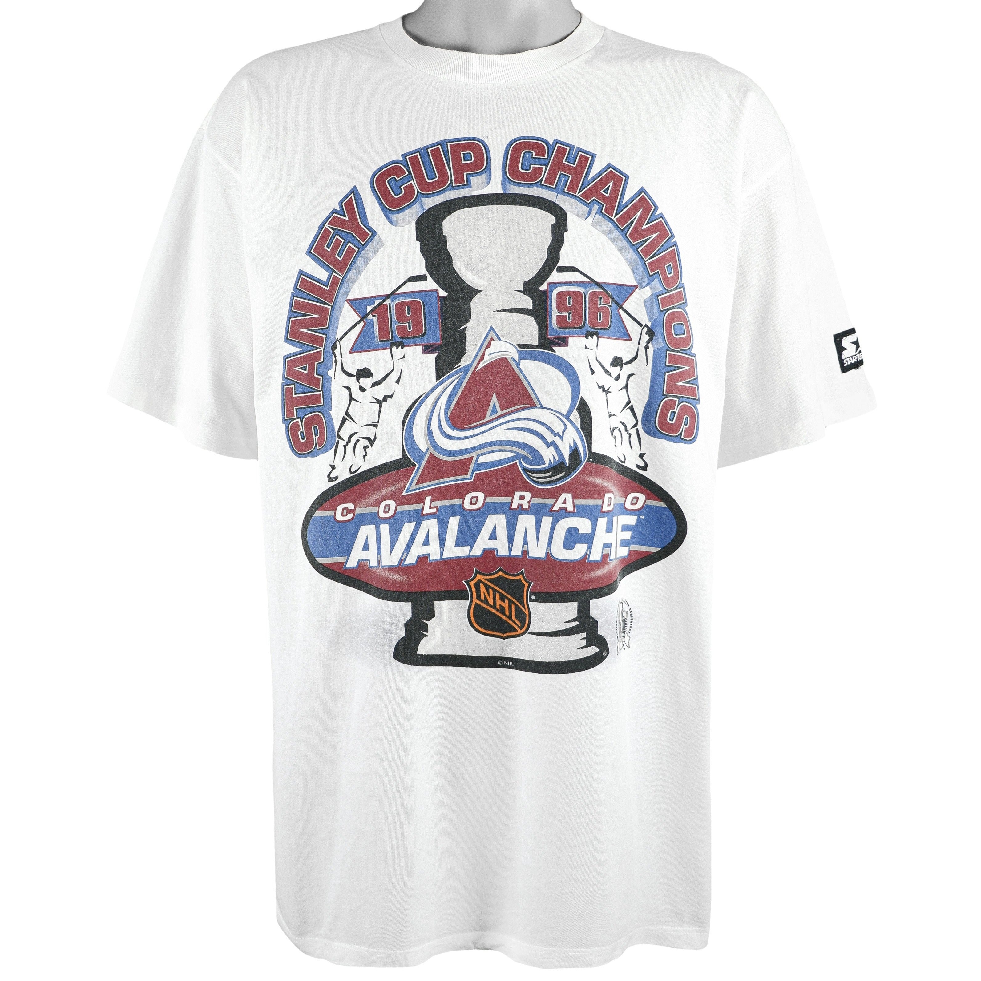 1996 Vintage Starter NHL Colorado Avalanche Stanley Cup Champions Deadstock T-Shirt. White​ in color with big logo on the front, fits large size and is in in excellent condition.