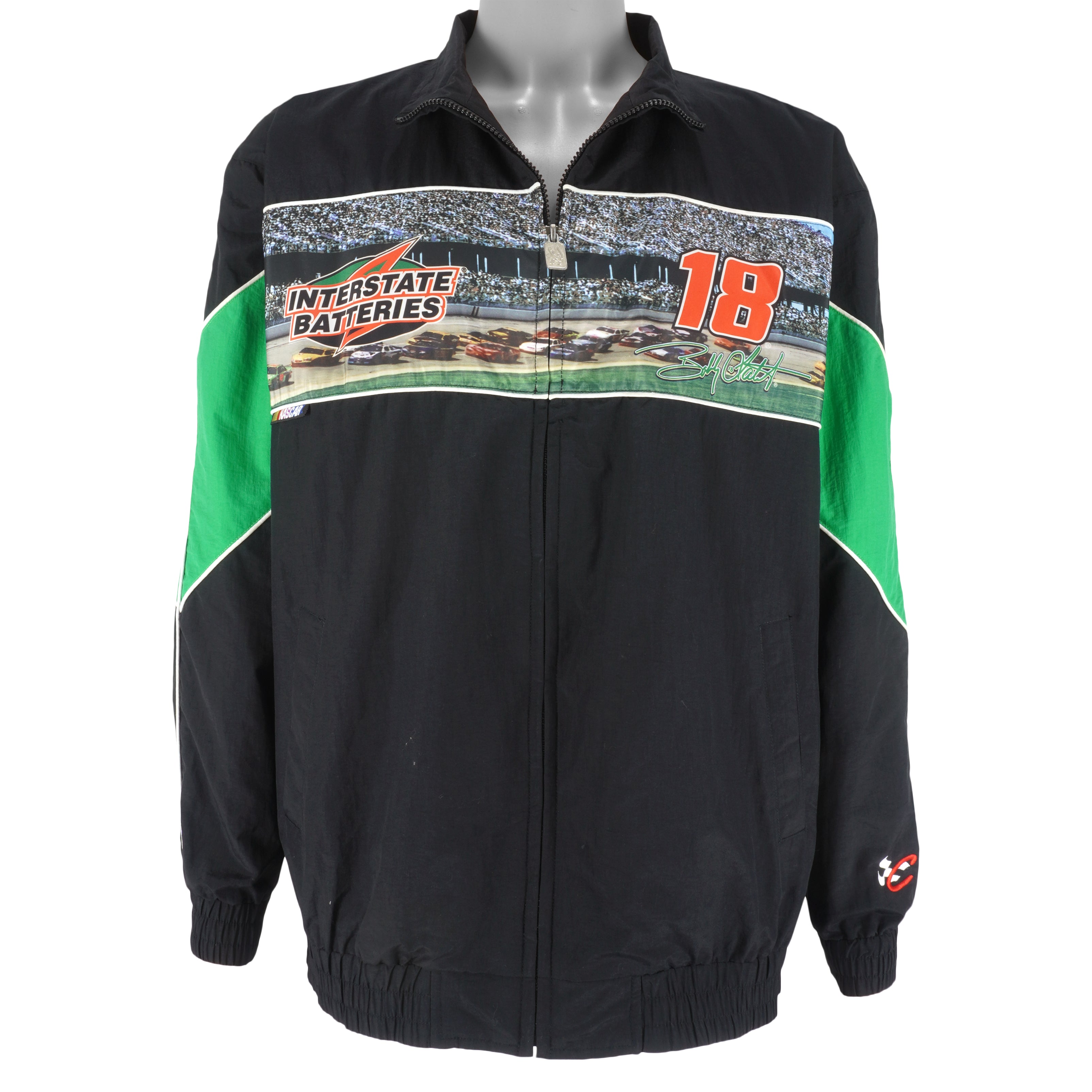 2000s Vintage NASCAR Interstate Batteries Bobby Labonte No.18 Big Spell-Out Windbreaker by Chase. Black in color, tag shows large but fitting like an X-large size with signs of wear, minor marks and is otherwise in very good condition.