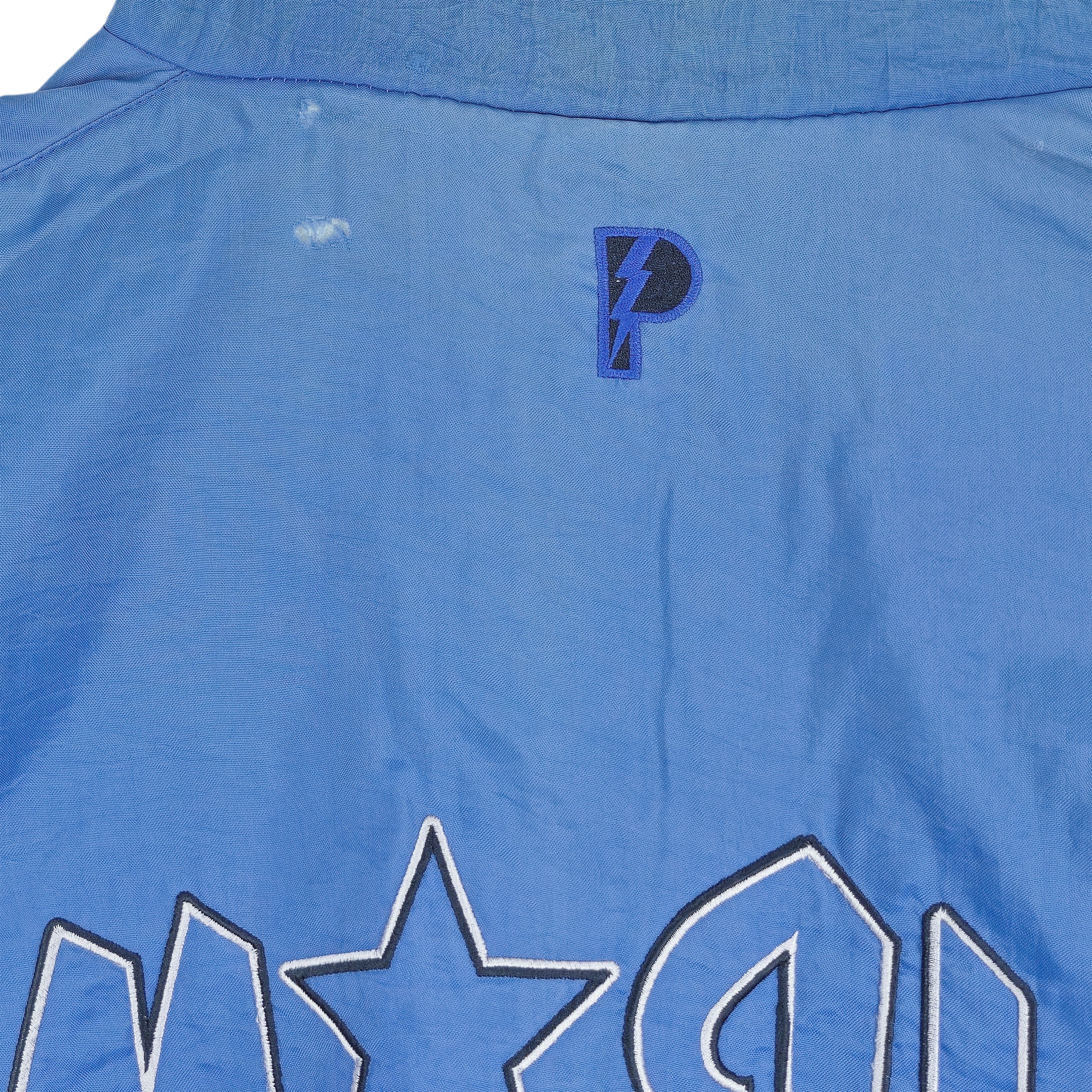 1990s Vintage NBA Orlando Magic Big Logo and Spell-Out Reversible Warm Jacket by Pro Player. Blue and black in color, fits an XX-large size with signs of wear, small tears on the blue side and is otherwise in very good vintage condition.