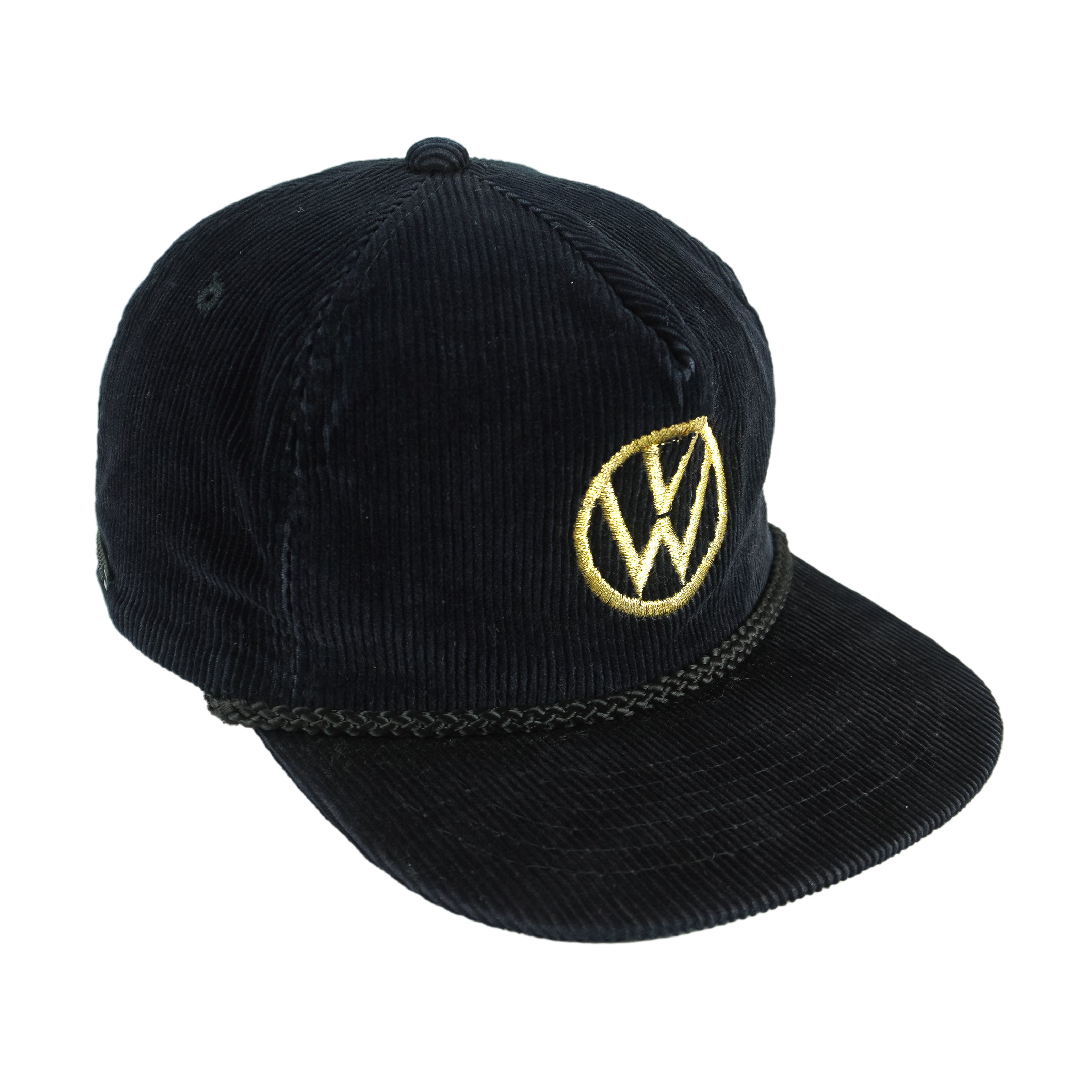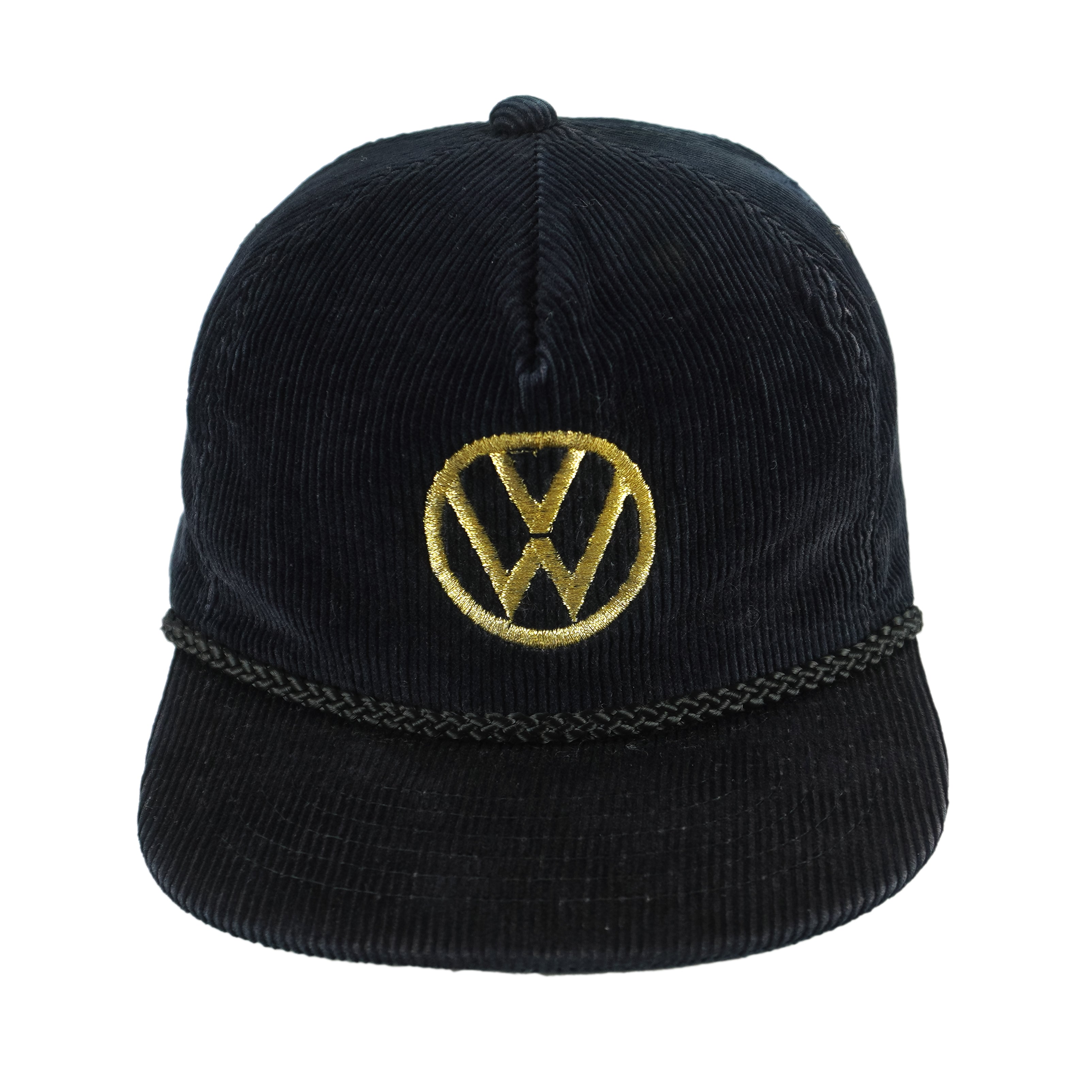 1990s Vintage Volkswagens Corduroy Embroidered Snapback Hat by Ama Pro. Black in color, adjustable size and is in excellent condition.
