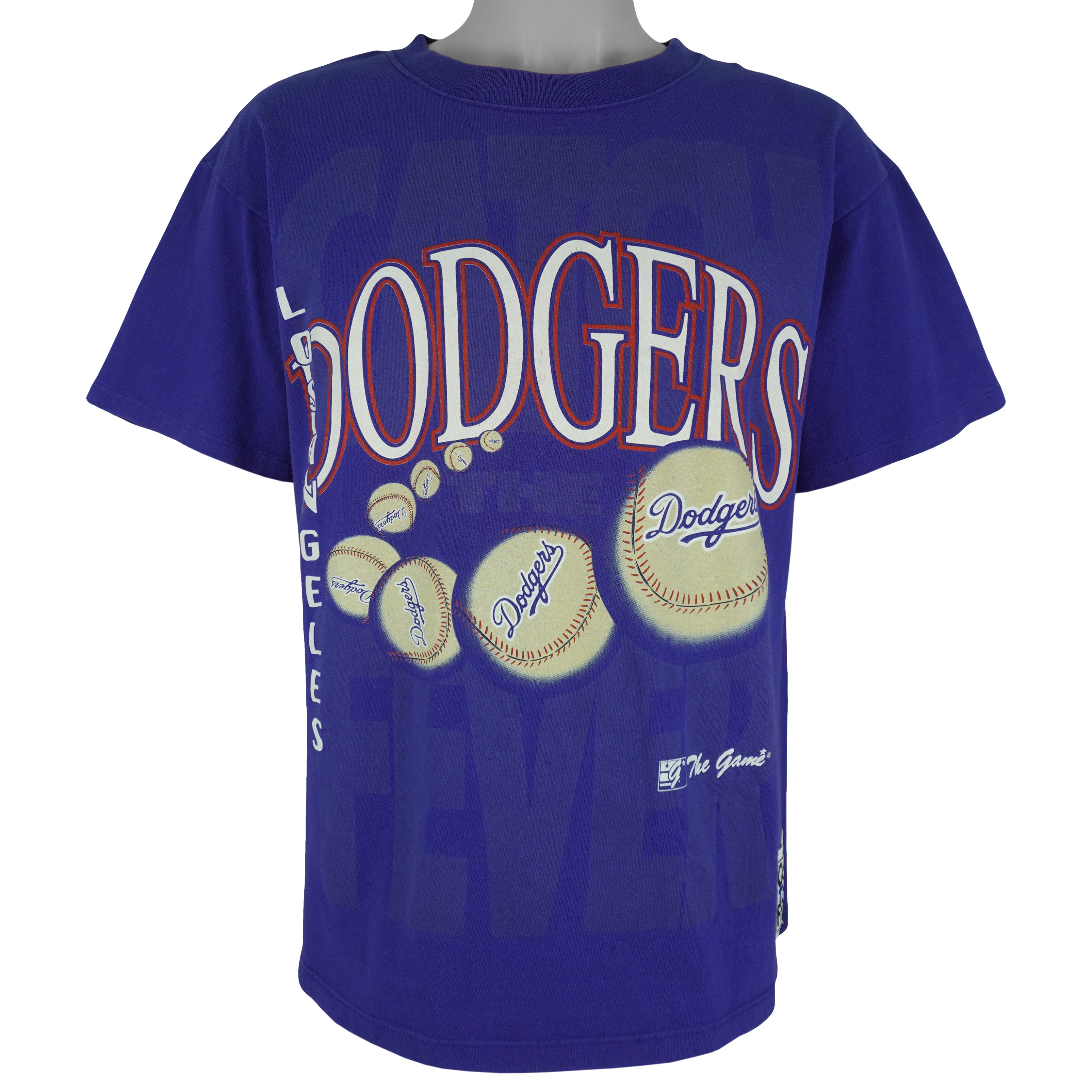 1990s Vintage MLB Los Angeles Dodgers Baseball Catch The Fever Single Stitch T-Shirt by The Game. Blue in color, fits a medium size with signs of wear with minor marks, aging on screen logo and is otherwise in very good condition.
