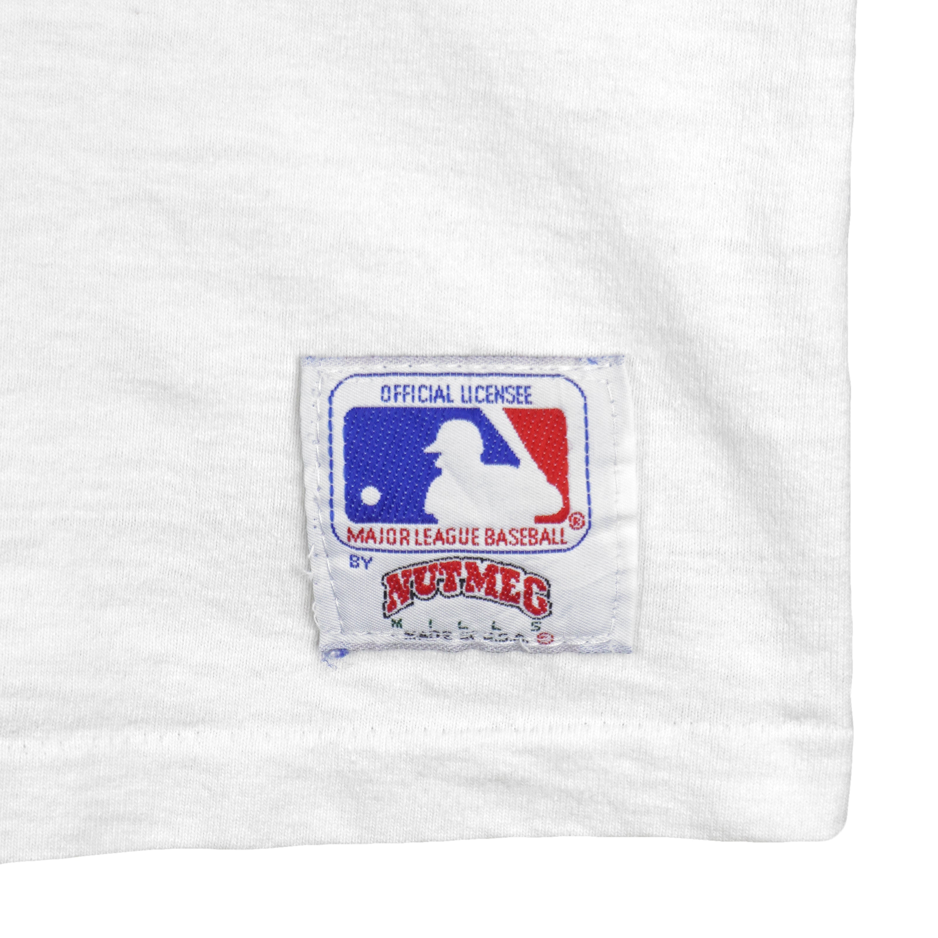 1992 Vintage MLB Pittsburgh Pirates National League East Embroidered T-Shirt by Nutmeg Mills. Off White in color, tag shows an X-large but fits like a large, tall size with signs of wear, repaired near armpit and is otherwise in very good condition.