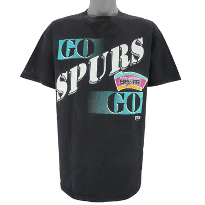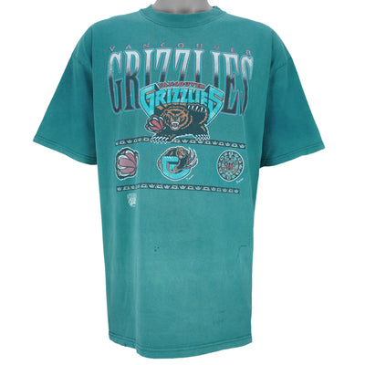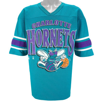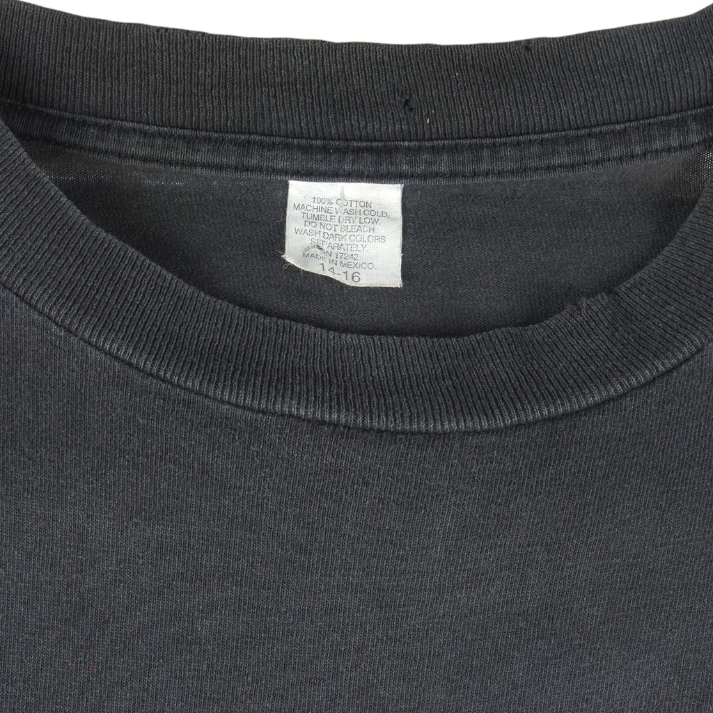 1995 Vintage NBA Portland Blazers X Looney Daffy Duck T-Shirt. Faded black in color, team spell-out and logo, tag shows 14-16 Youth but fits like a medium size with signs of wear, minor tear on collar, some fading areas and is otherwise in very good condition.