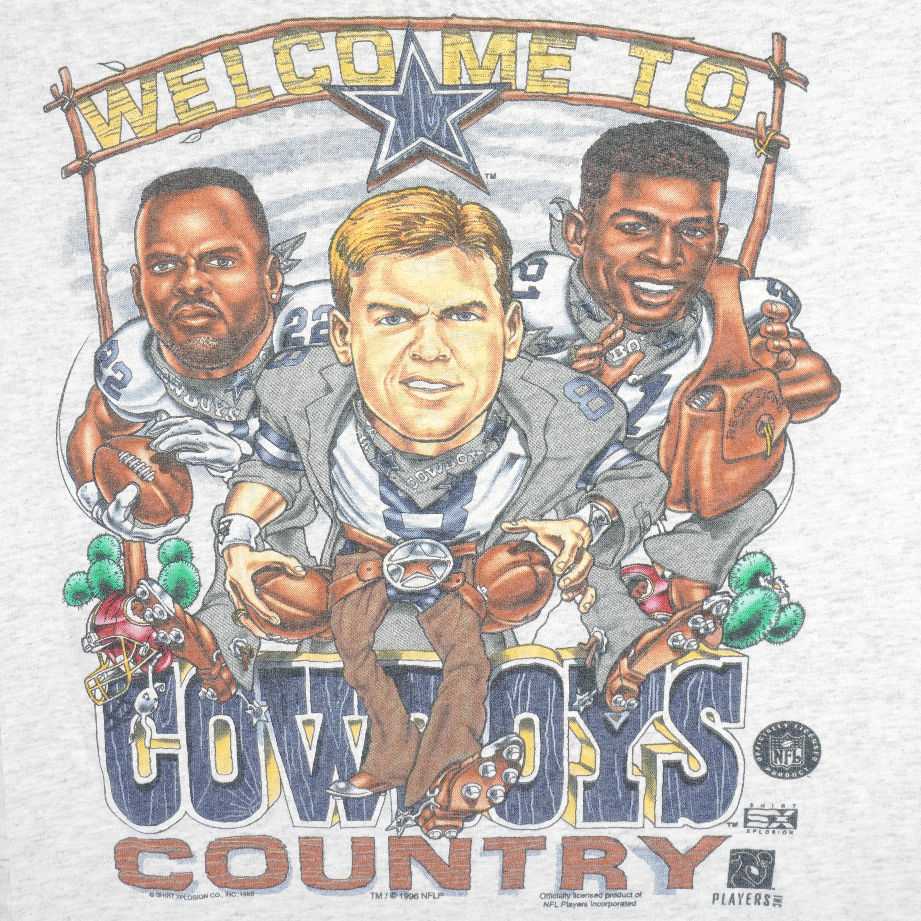 1996 Vintage NFL Dallas Cowboys Welcome to Cowboys Country Caricature Single Stitch T-Shirt by Delta. Grey in color, big spell-out and logo. Fits large size and is in excellent condition.