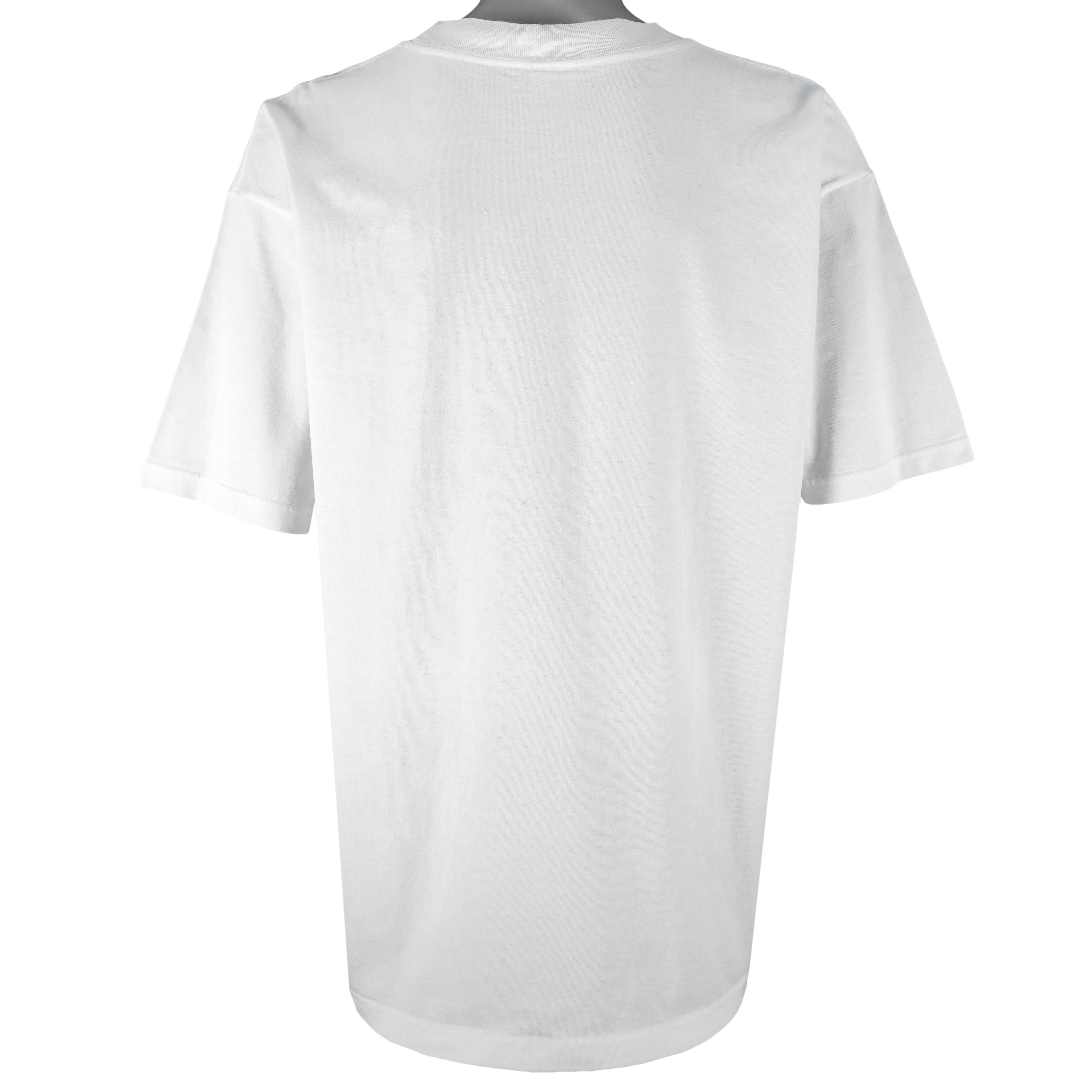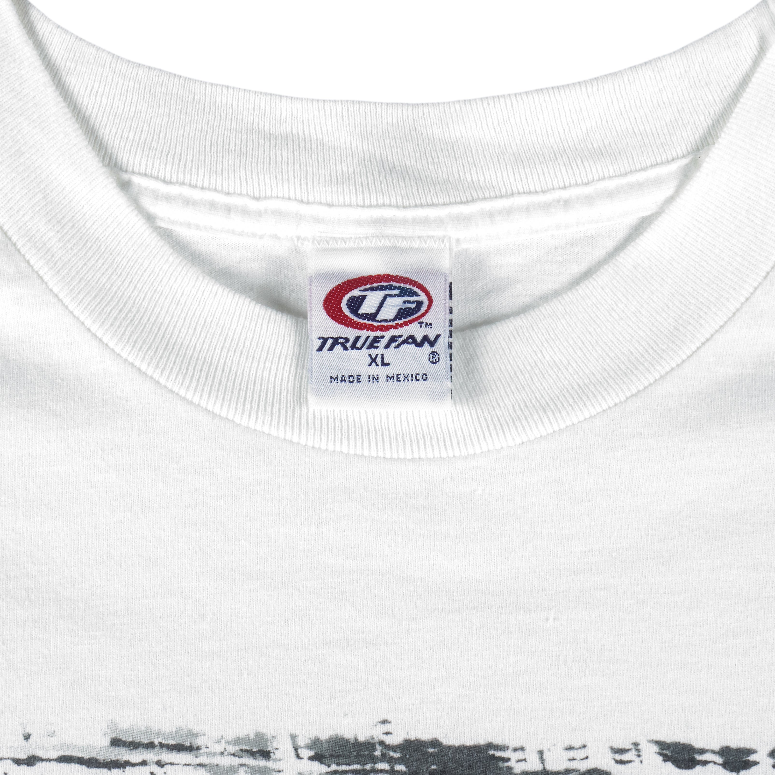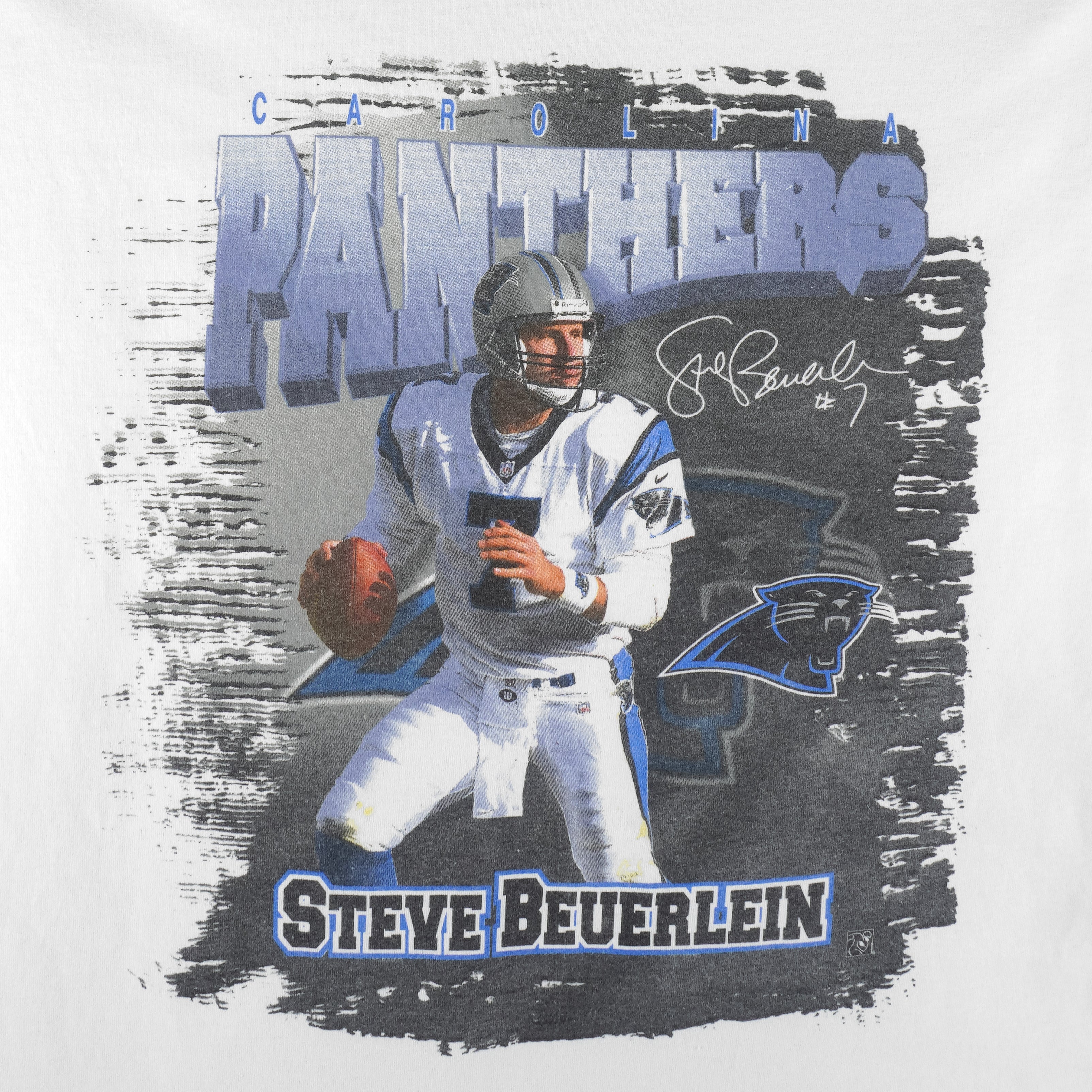 1996 - 2000 Vintage NFL Carolina Panthers Steve Beuerlein No. 7 MVP Big Spell-Out & Logo T-Shirt by True Fan. White in color, fits X-large size and is in excellent condition.