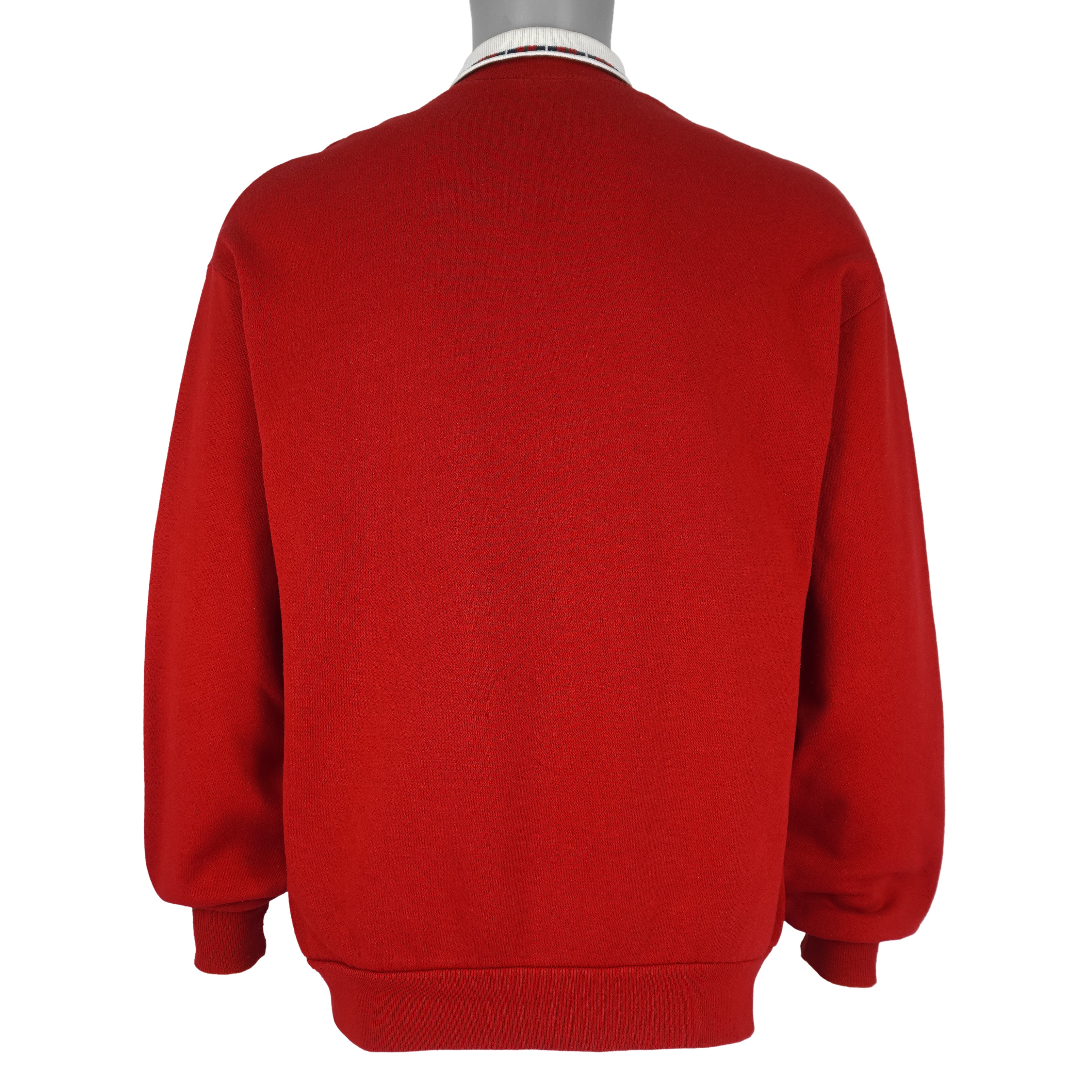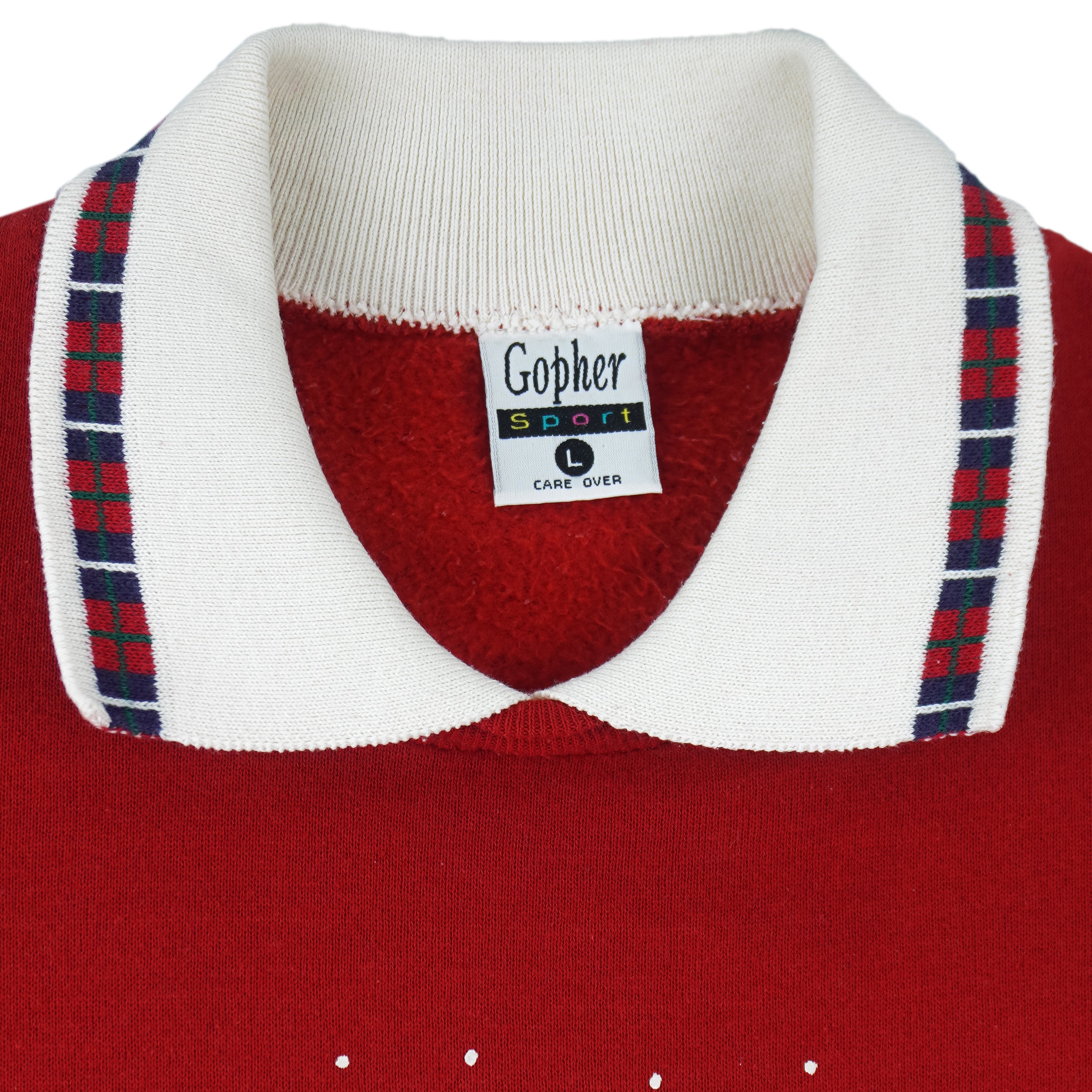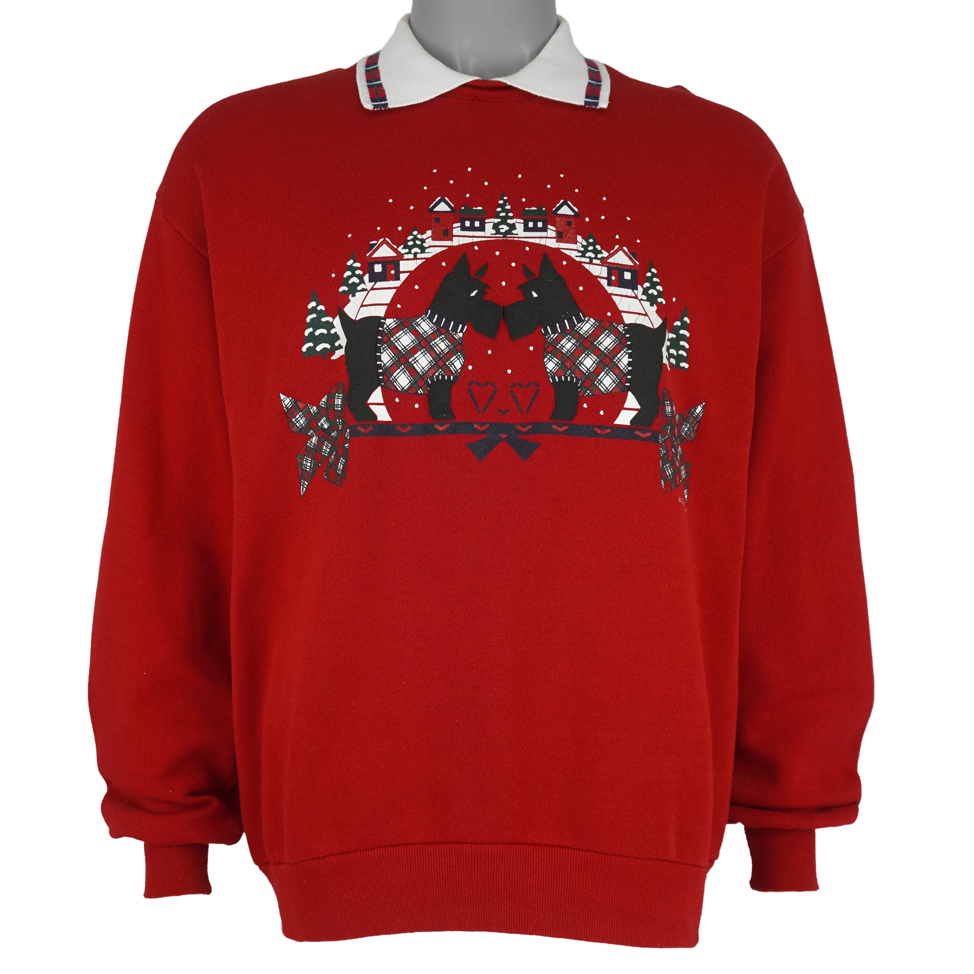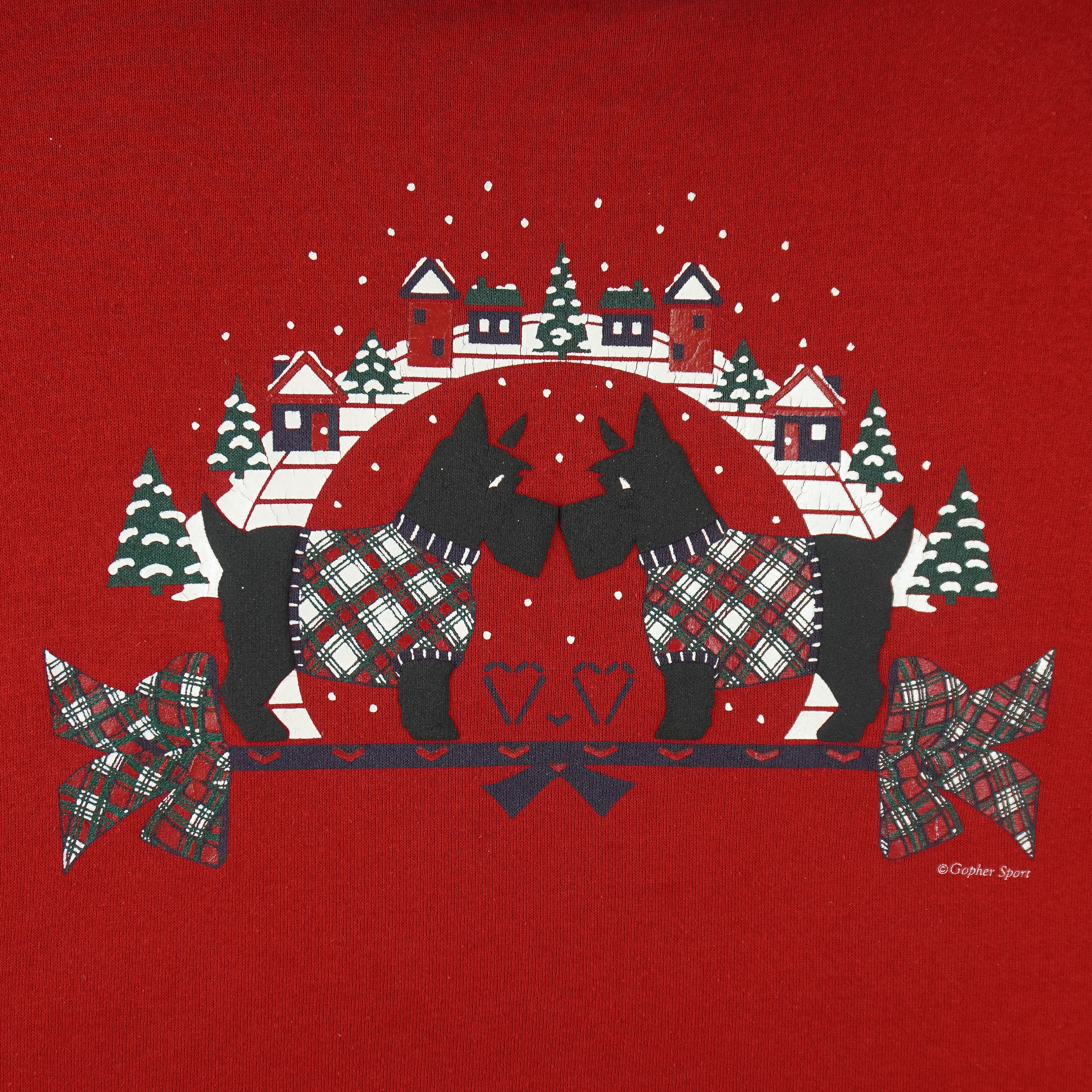1990s Vintage Puppy Dogs Crew Neck Sweatshirt by Gopher Sport. This bright red sweatshirt features an adorable winter-inspired design of puppies surrounded by festive holiday details, including a plaid bow and holly accents. The crisp white collar with plaid trim adds a classic, layered look, perfect for holiday celebrations or cozy winter outfits. Fits a Large size and is in very good condition, with minimal signs of wear.