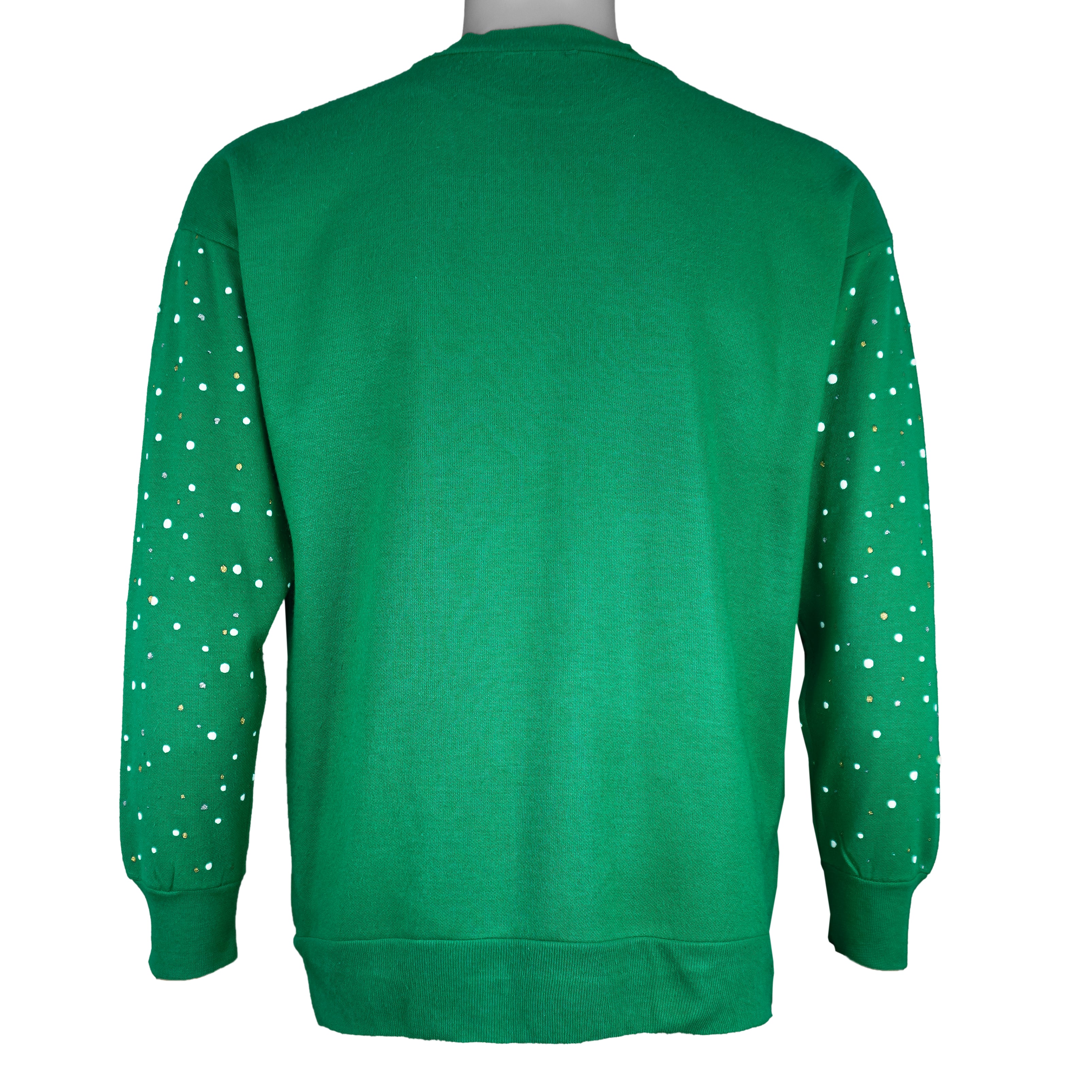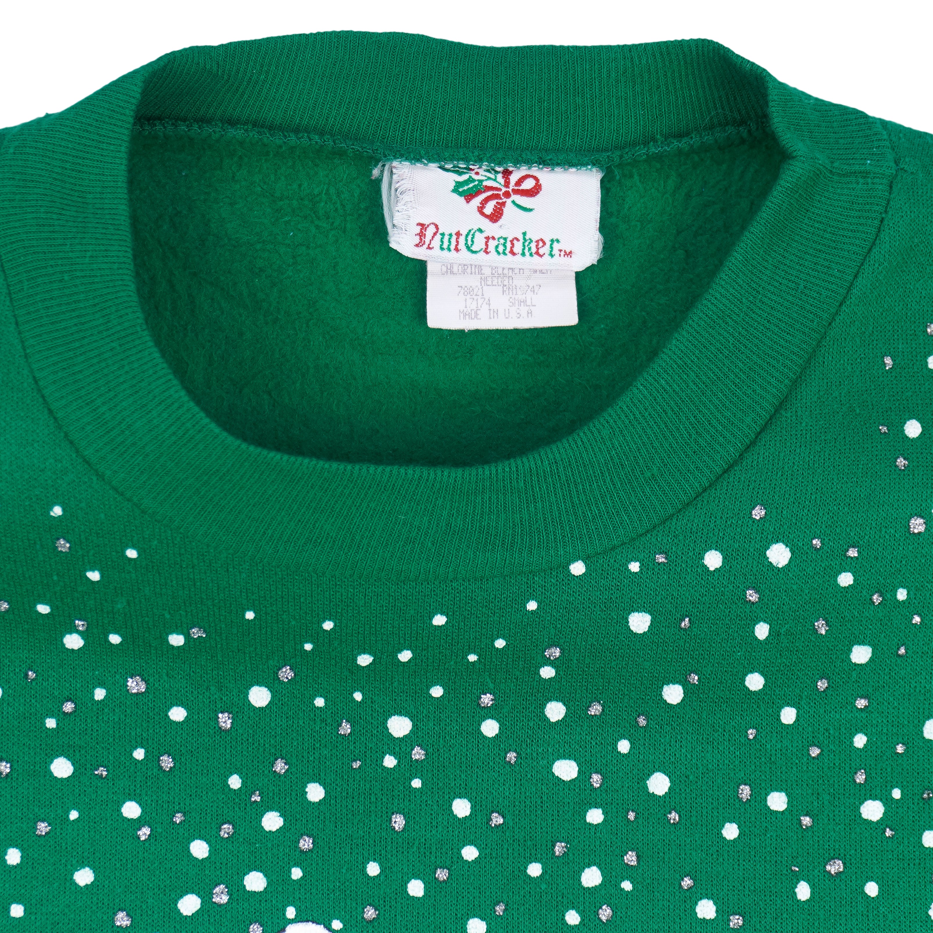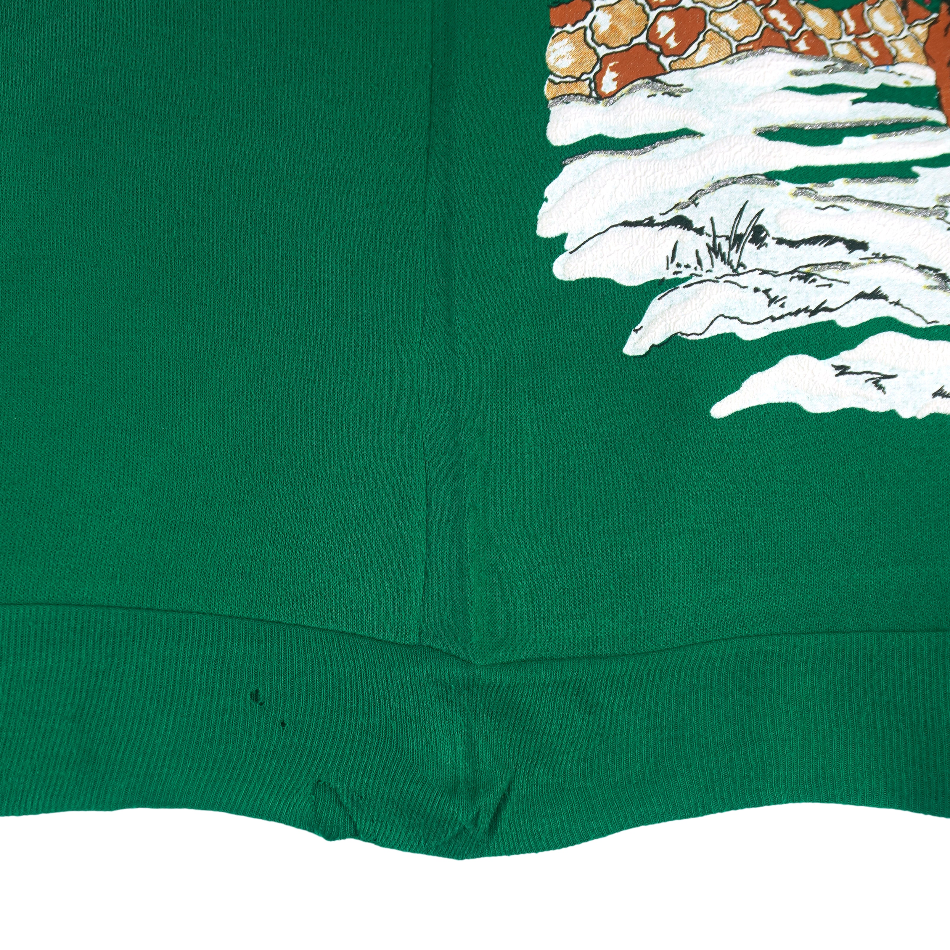 1990s Vintage Winter Scene Crew Neck Sweatshirt by Nutcracker. Bright green in color featuring a stunning winter landscape graphic with horses in a snow-covered pasture, a red barn, and a winding snowy path leading through the trees. The design is accented with falling snowflakes across the shoulders and sleeves, adding to the cozy seasonal charm. Fits a medium size with signs of wear, including a tear on the bottom back (see photos), and is otherwise in very good condition.