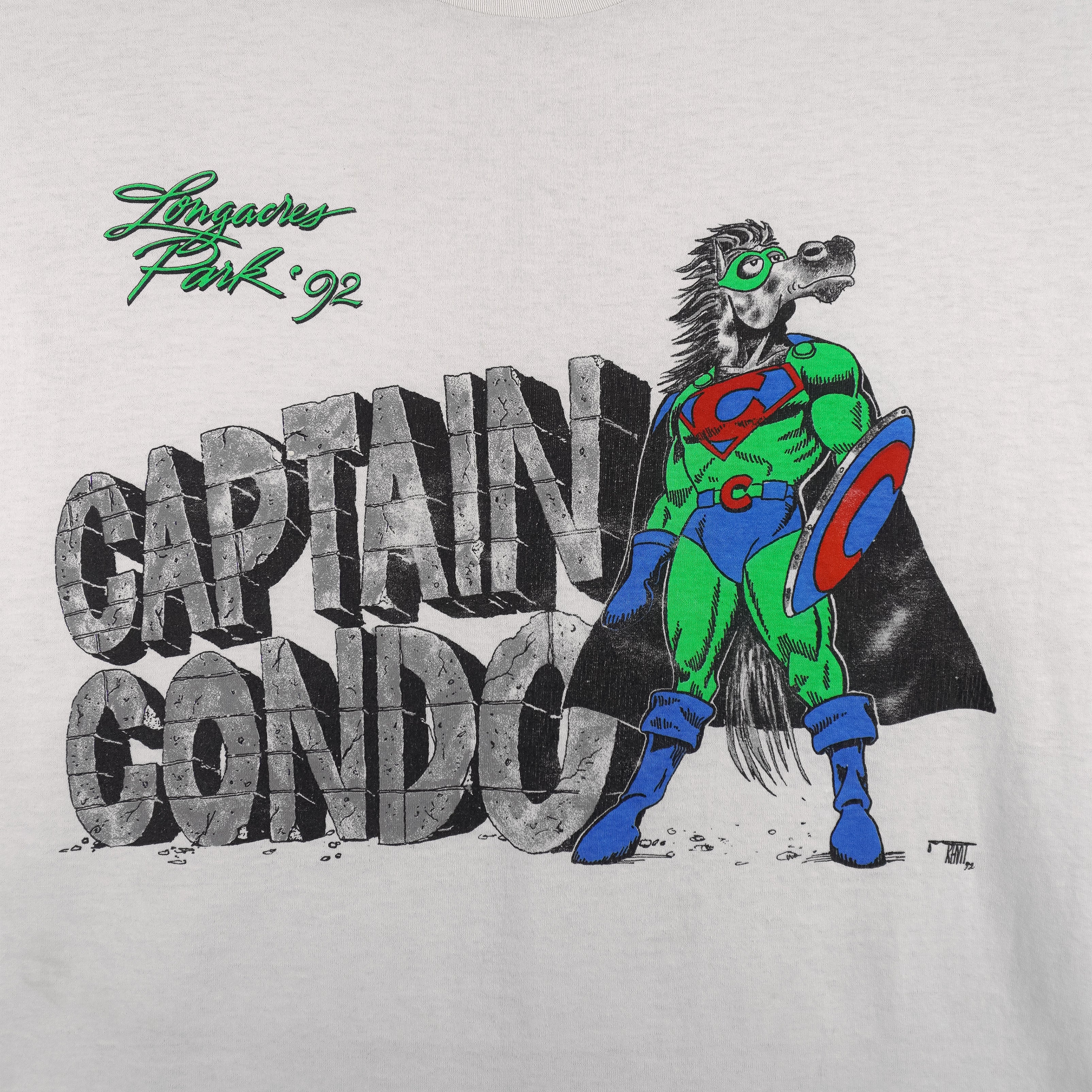 1992 Vintage Captain Condo Longacres Park Horse Racing T-Shirt by Hanes. White in color, fitting a large size with minor marks on front and back and is otherwise in very good condition.
