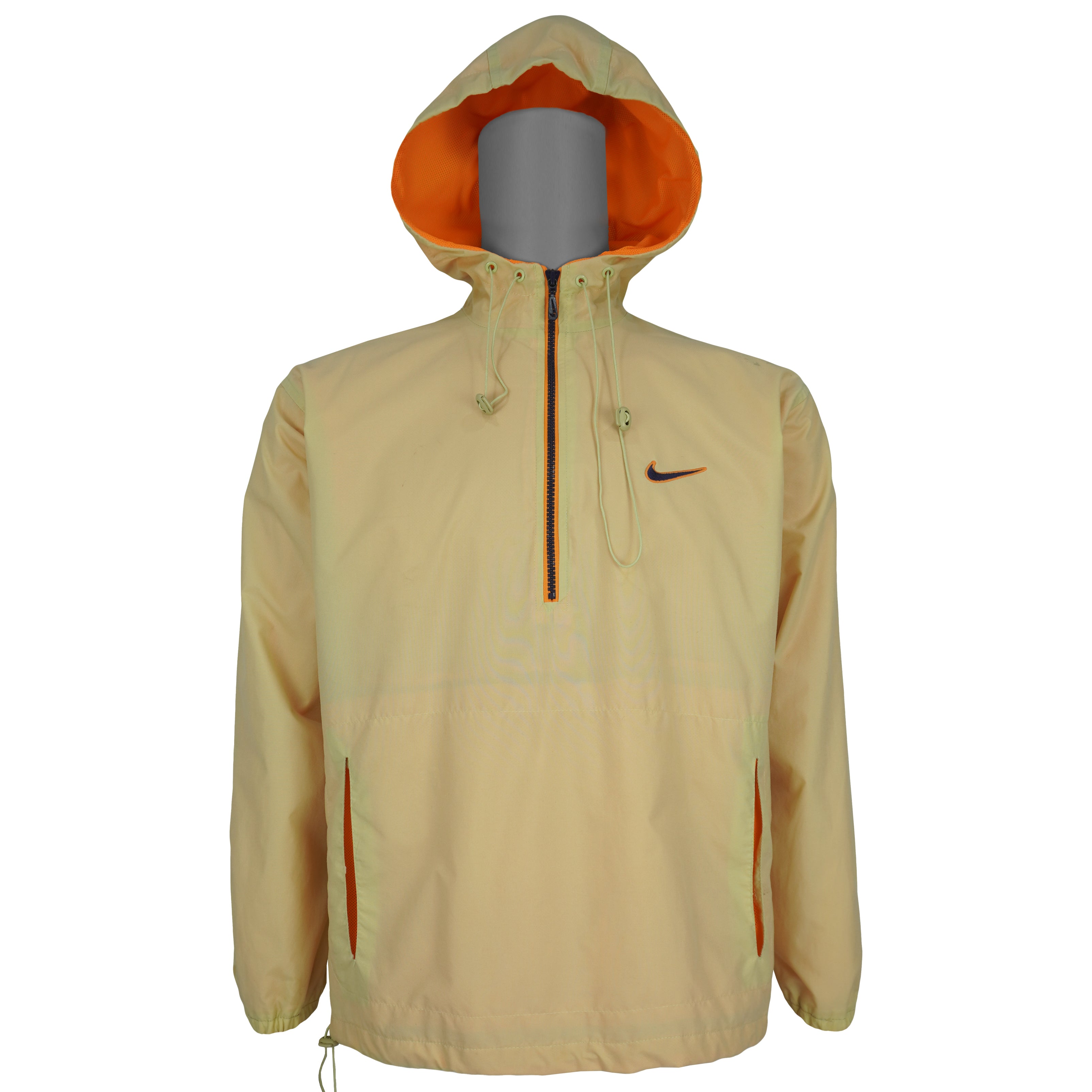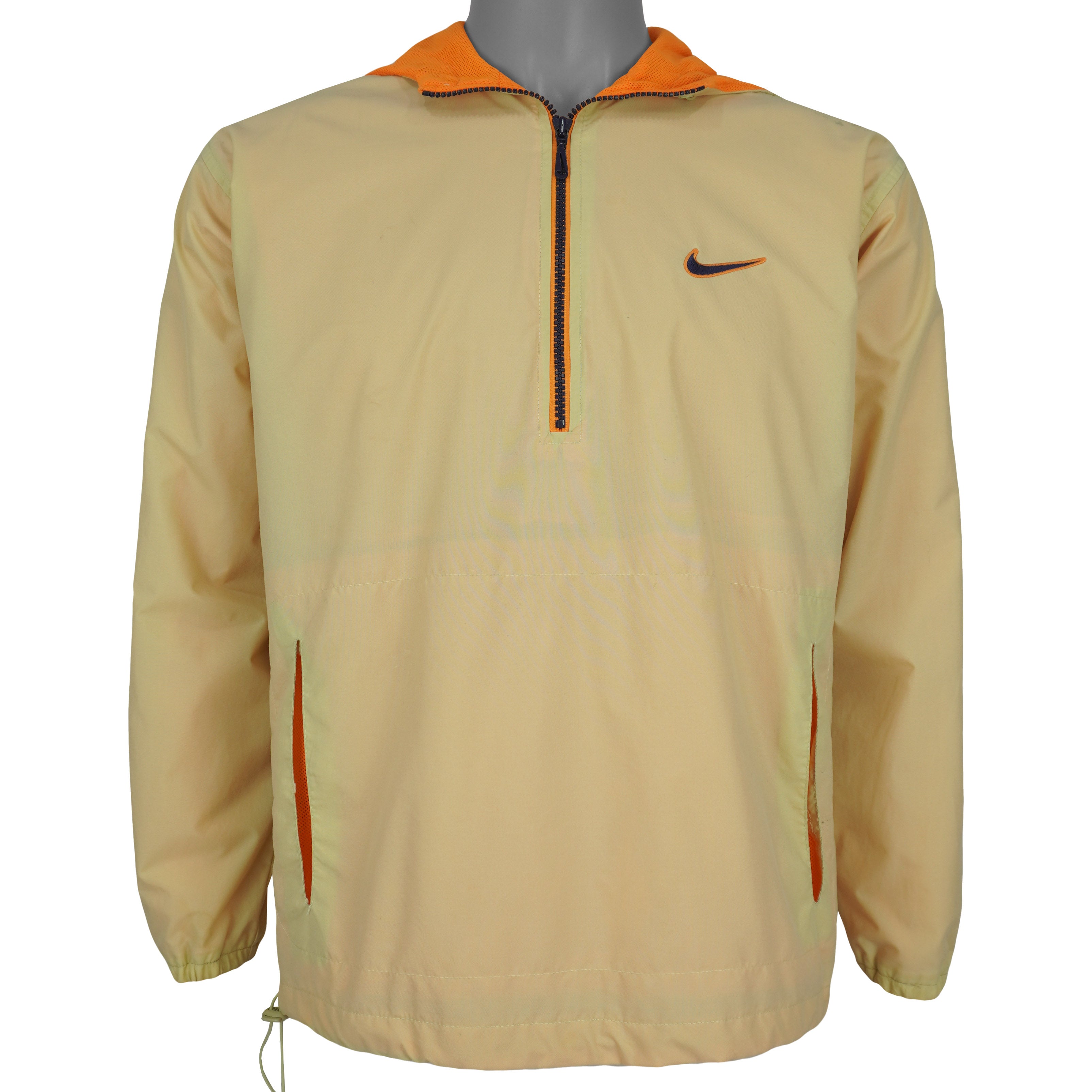 1990s Vintage Nike 1/4 Zip Hooded Pullover Windbreaker. Orange/beige in color, fitting a medium size with signs of wear - visible minor marks and is otherwise in very good condition.