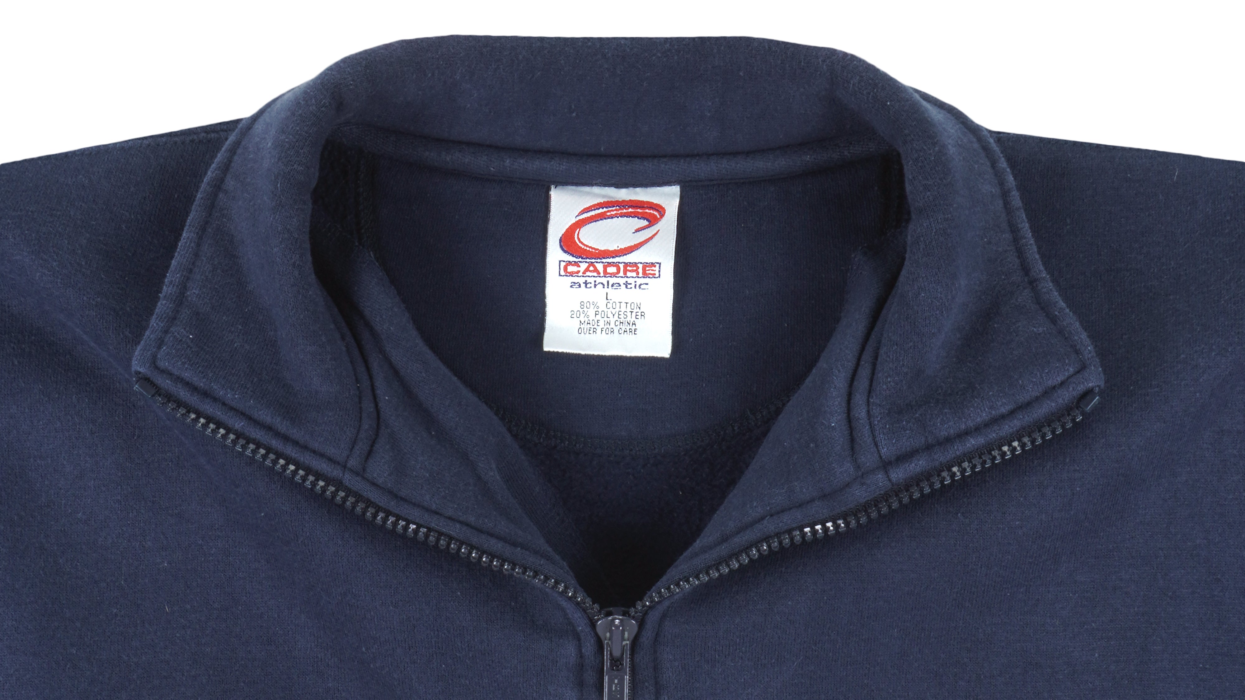 1990s Vintage NFL Chicago Bears 1/4 Zip Embroidered Sweatshirt by Cadre Athletic. Navy blue in color, big spell-out and logo. Fits large and is in excellent condition.