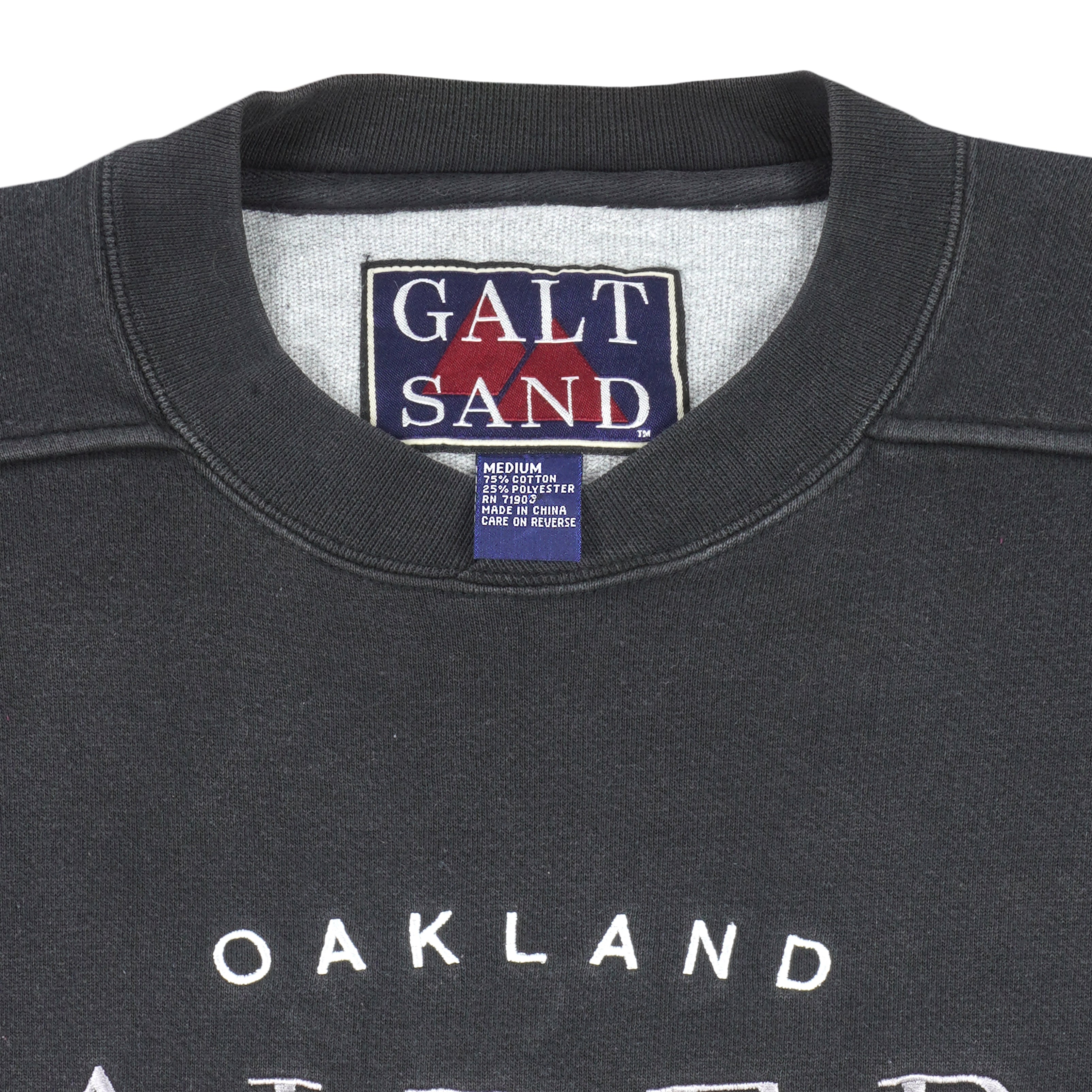 1990s Vintage NFL Oakland Raiders Embroidered Crew Neck Sweatshirt by Galt Sand. Black in color, spell-out, tag is medium but fits like large size and is in excellent condition.