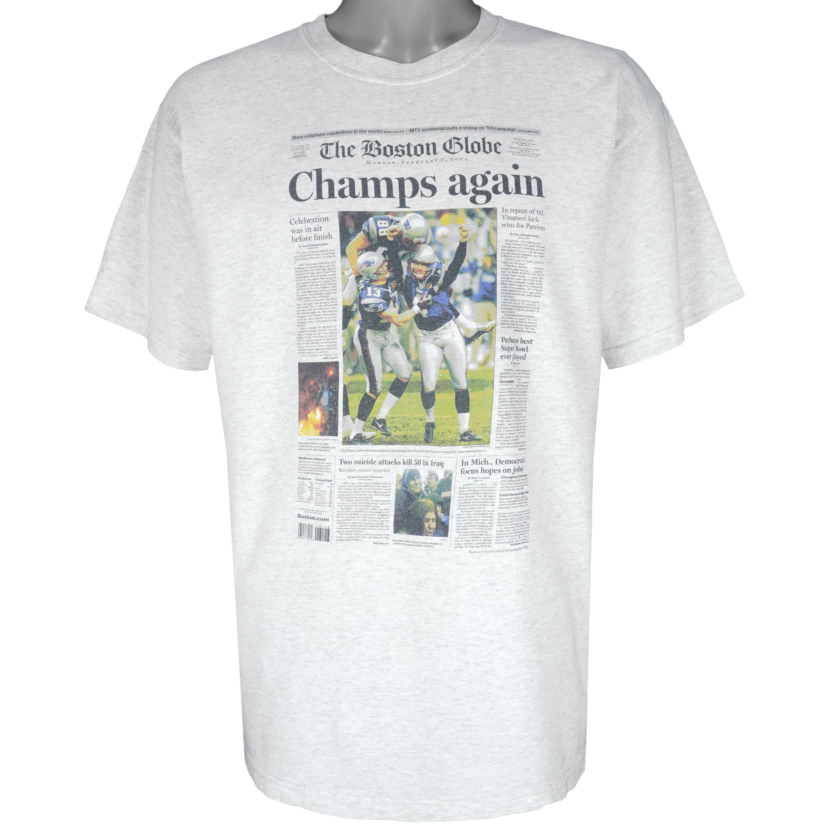 2004 Vintage NFL The Boston Globes Front Page from February 2, 2004, celebrating the New England Patriots win of Super Bowl. Grey in color and fits X-large in size and is in excellent condition.