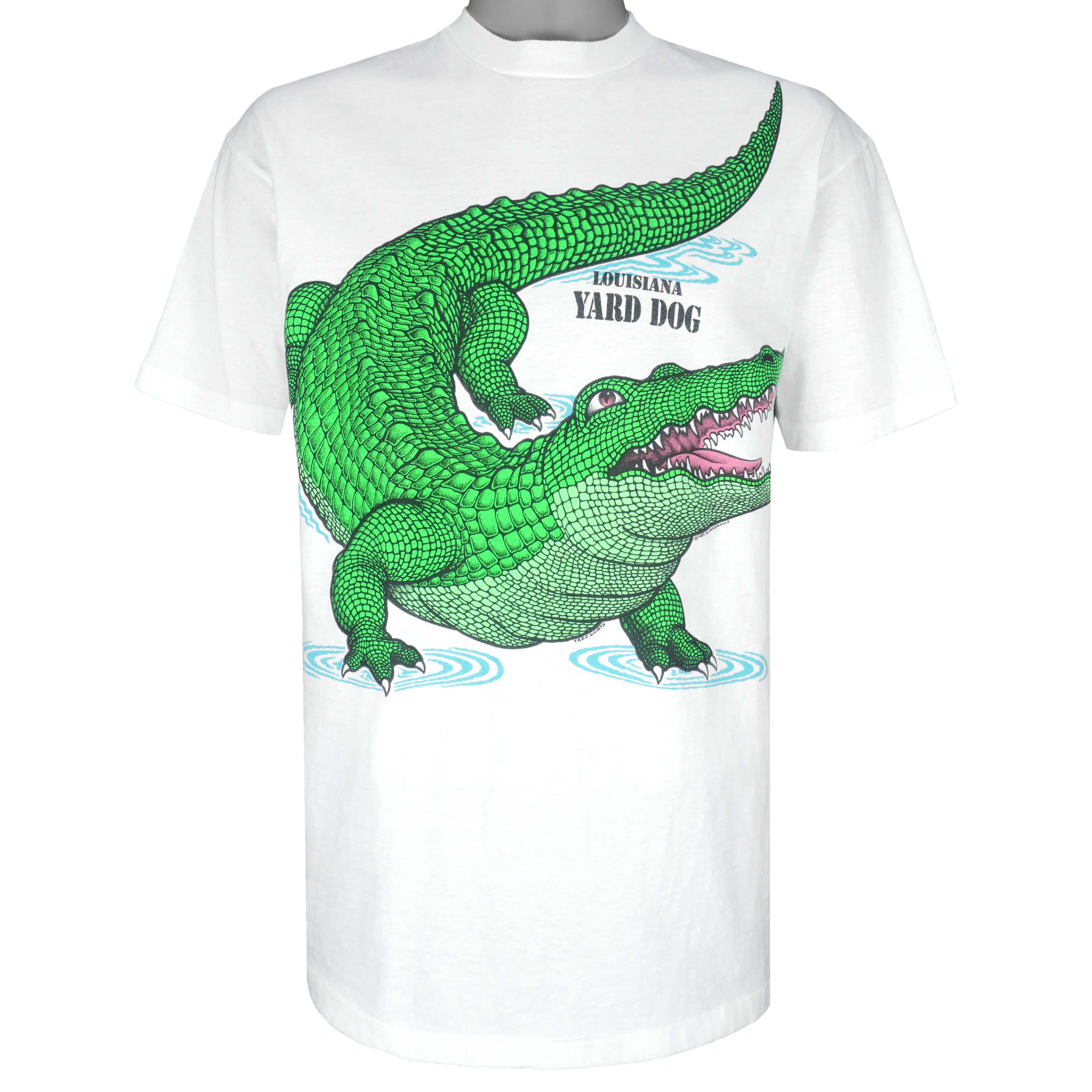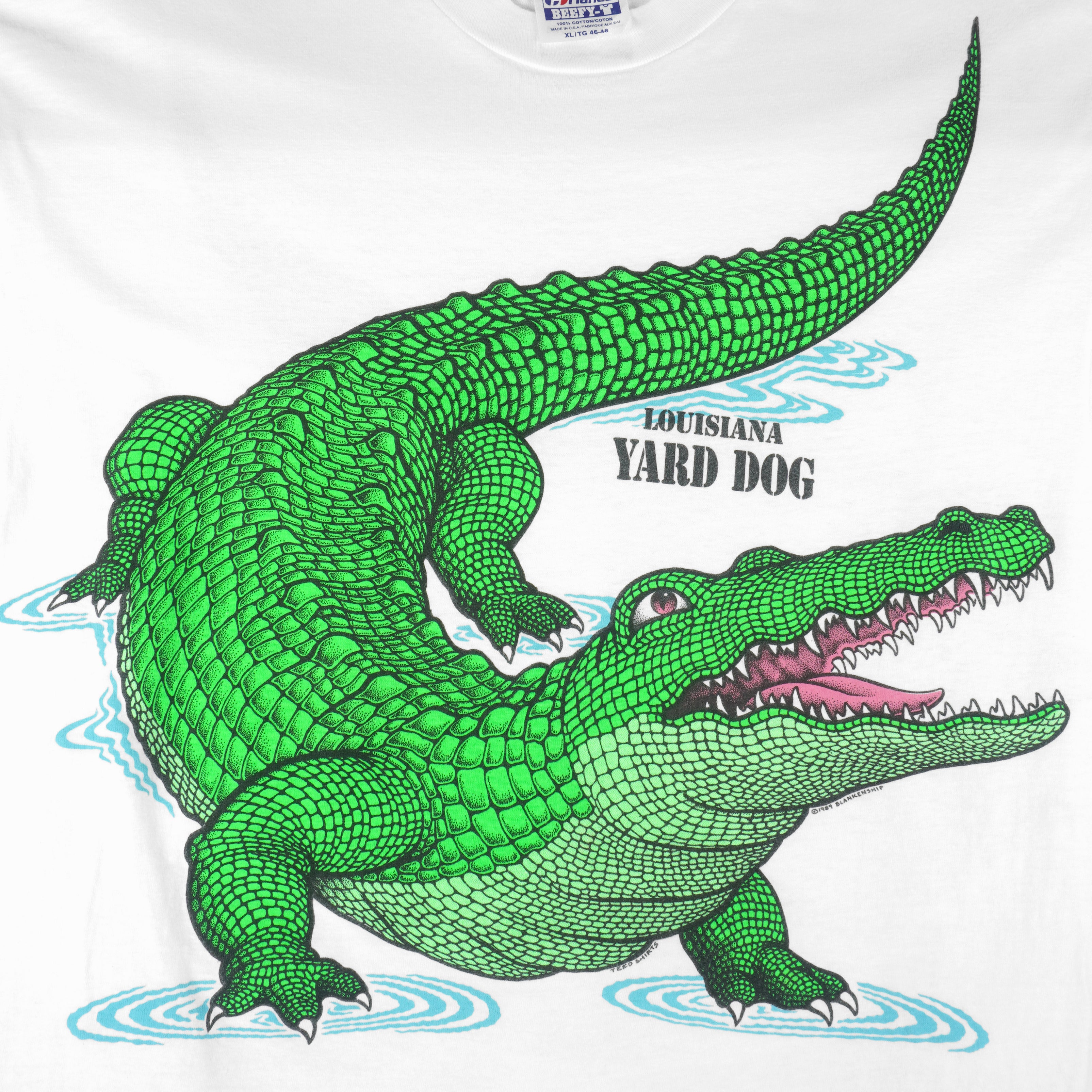 1989 Vintage Louisiana Yard Dog (Alligator) Crocodile Spell-Out Single Stitch T-Shirt by Hanes. White in color with double sided printing, fits large to X-large size and is in excellent condition.