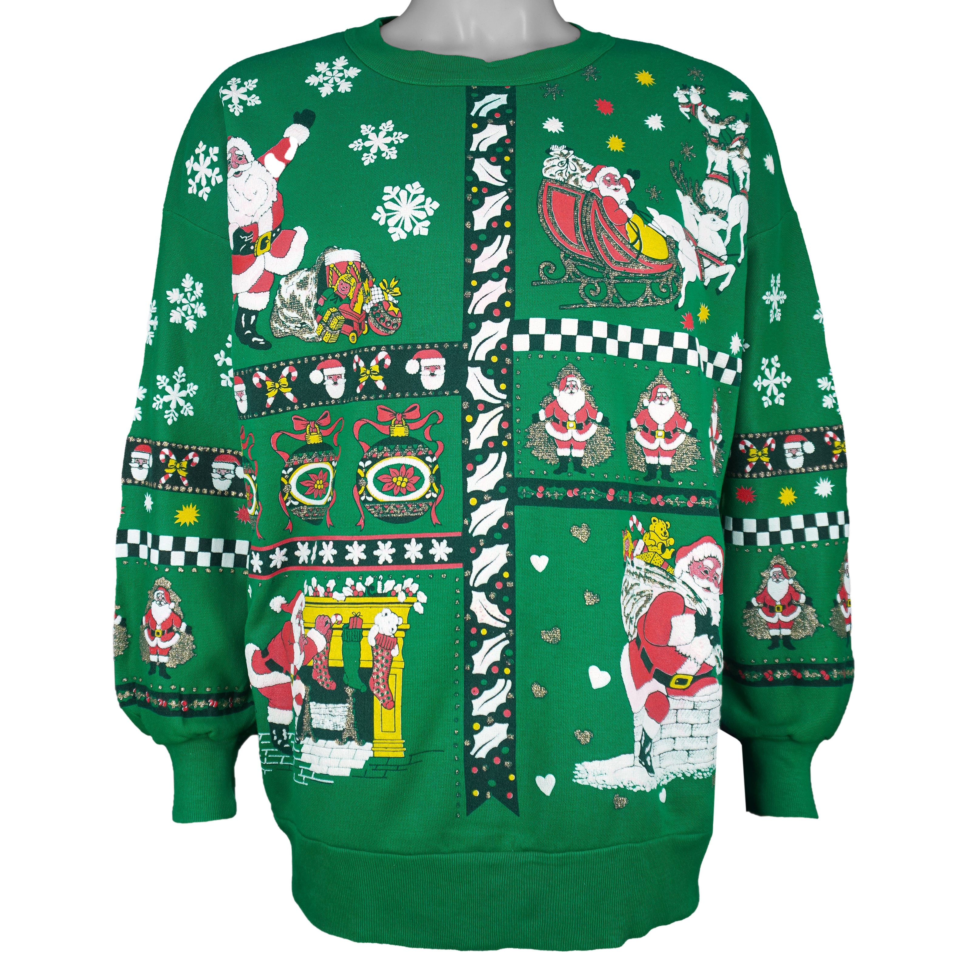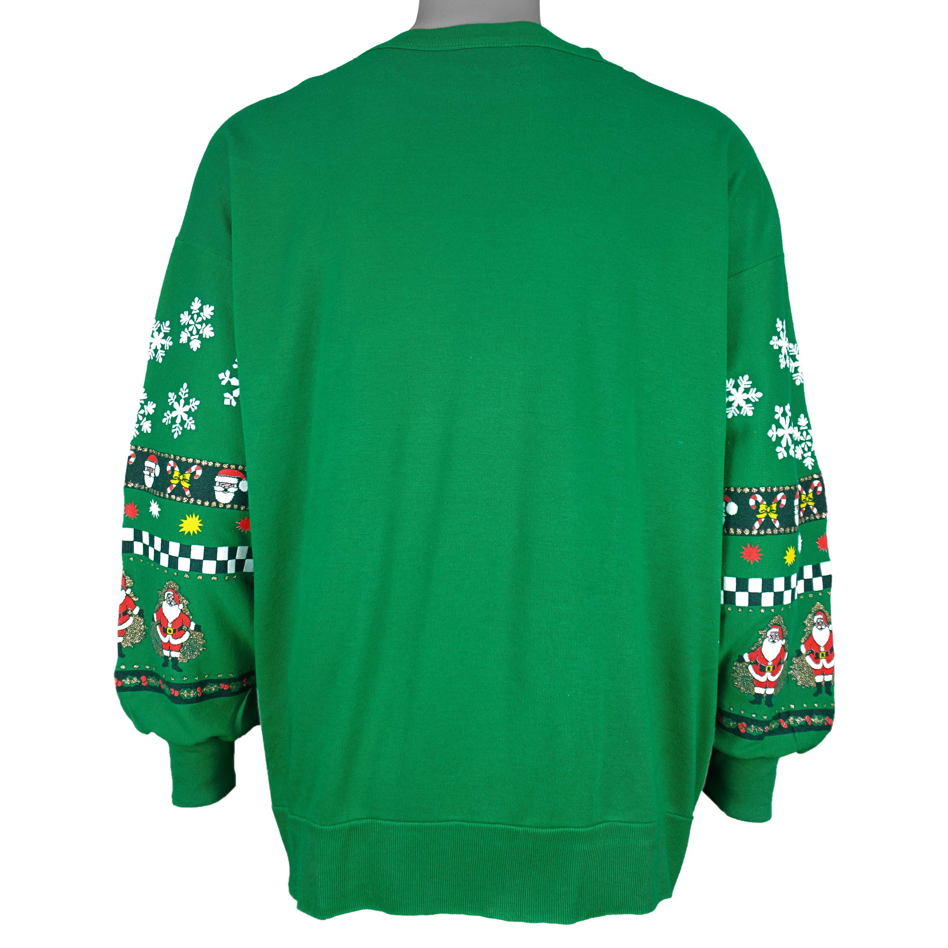 1990s Vintage Festive Patchwork Christmas Crew Neck Sweatshirt by Nutcracker. Features a vibrant green base with a playful patchwork-style graphic showcasing classic holiday motifs, including Santa Claus, snowmen, Christmas trees, wreaths, and candy canes. The design is framed with a bold snowflake pattern on the front and sleeves, embodying the nostalgic charm of 90s holiday apparel. Fits a Large size and is in very good condition, with minimal signs of wear (see photos).