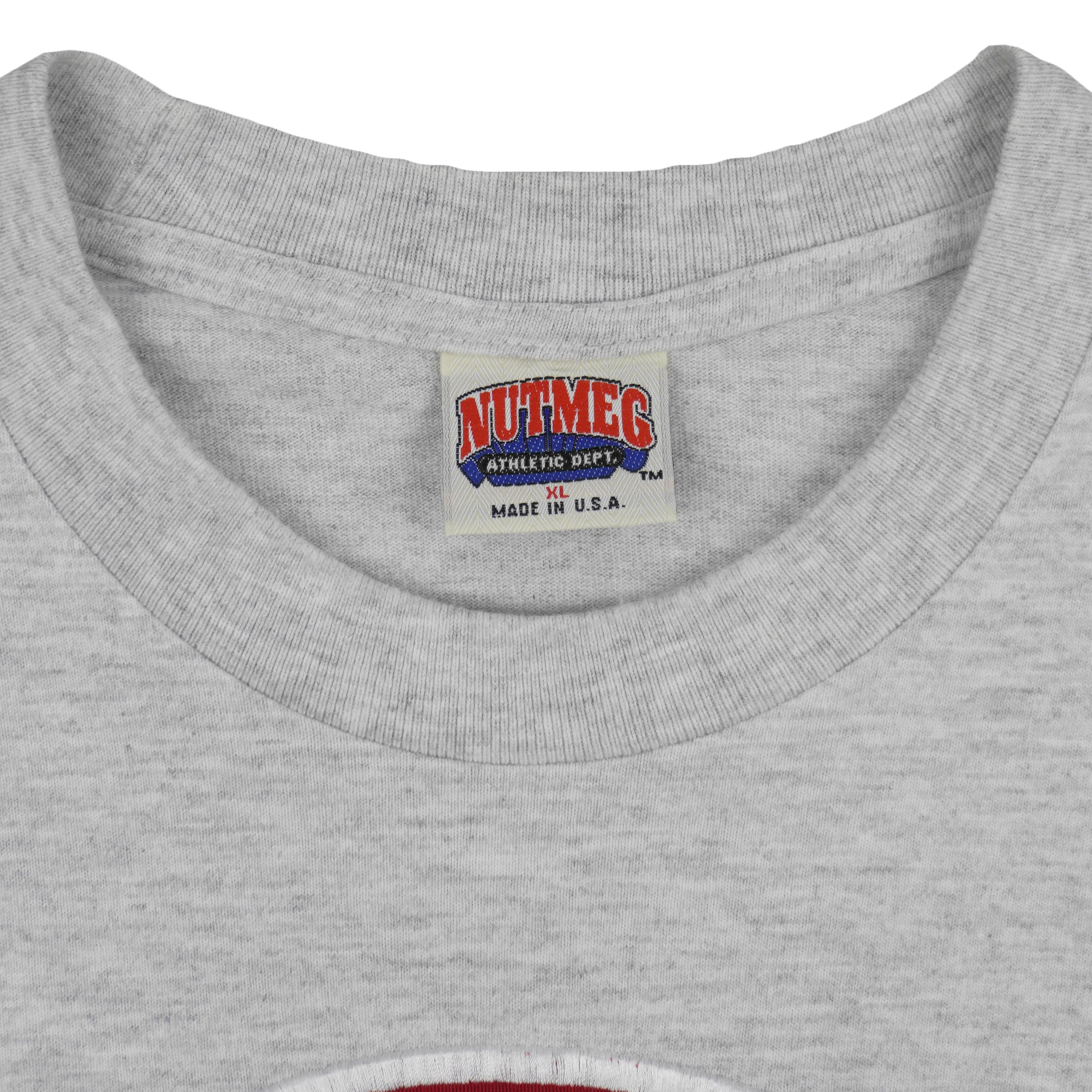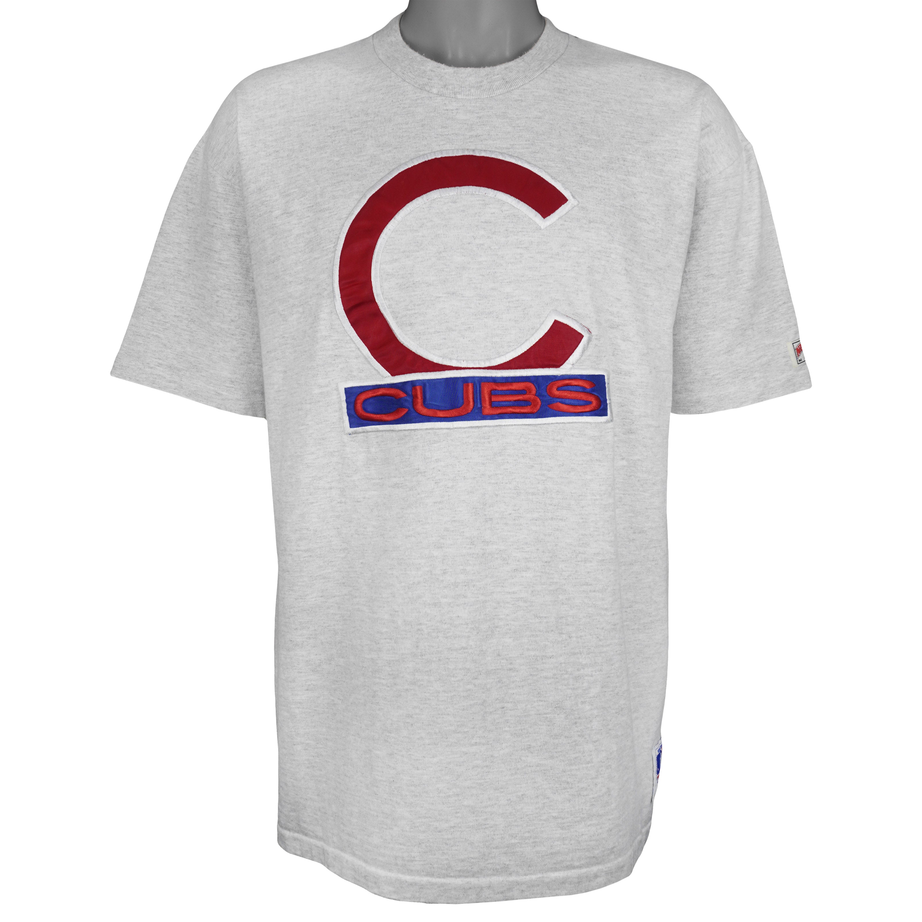 1990s Vintage MLB Chicago Cubs Embroidered 'C' Single Stitch T-Shirt by Nutmeg Mills. Grey in color, fits an X-large size with signs of wear and is otherwise in very good condition.