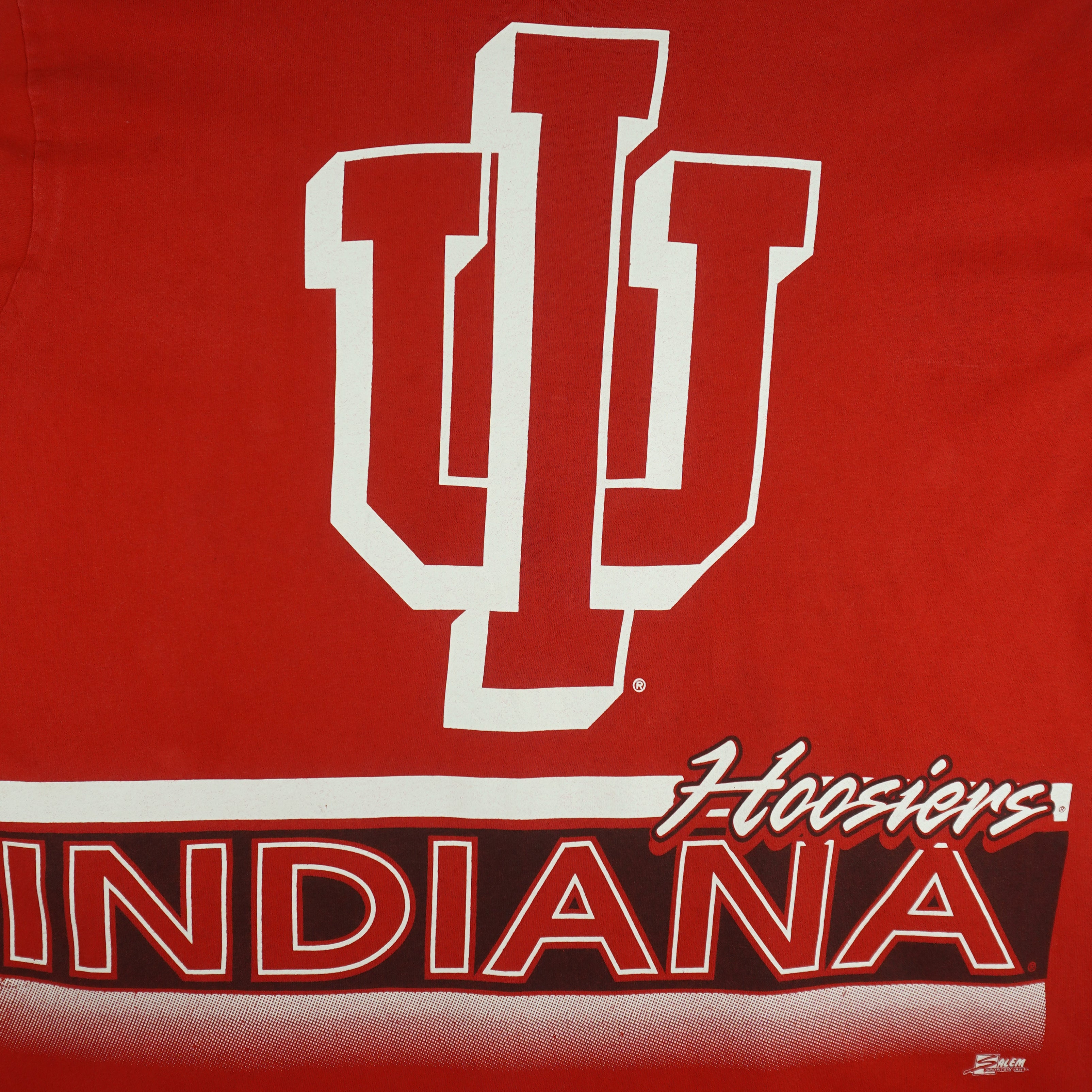 1990s Vintage NCAA Indiana Hoosiers T-Shirt by Salem. Red in color, big spell-out and logo, fits an X-large size with signs of wear -minor marks and is otherwise in very good condition.