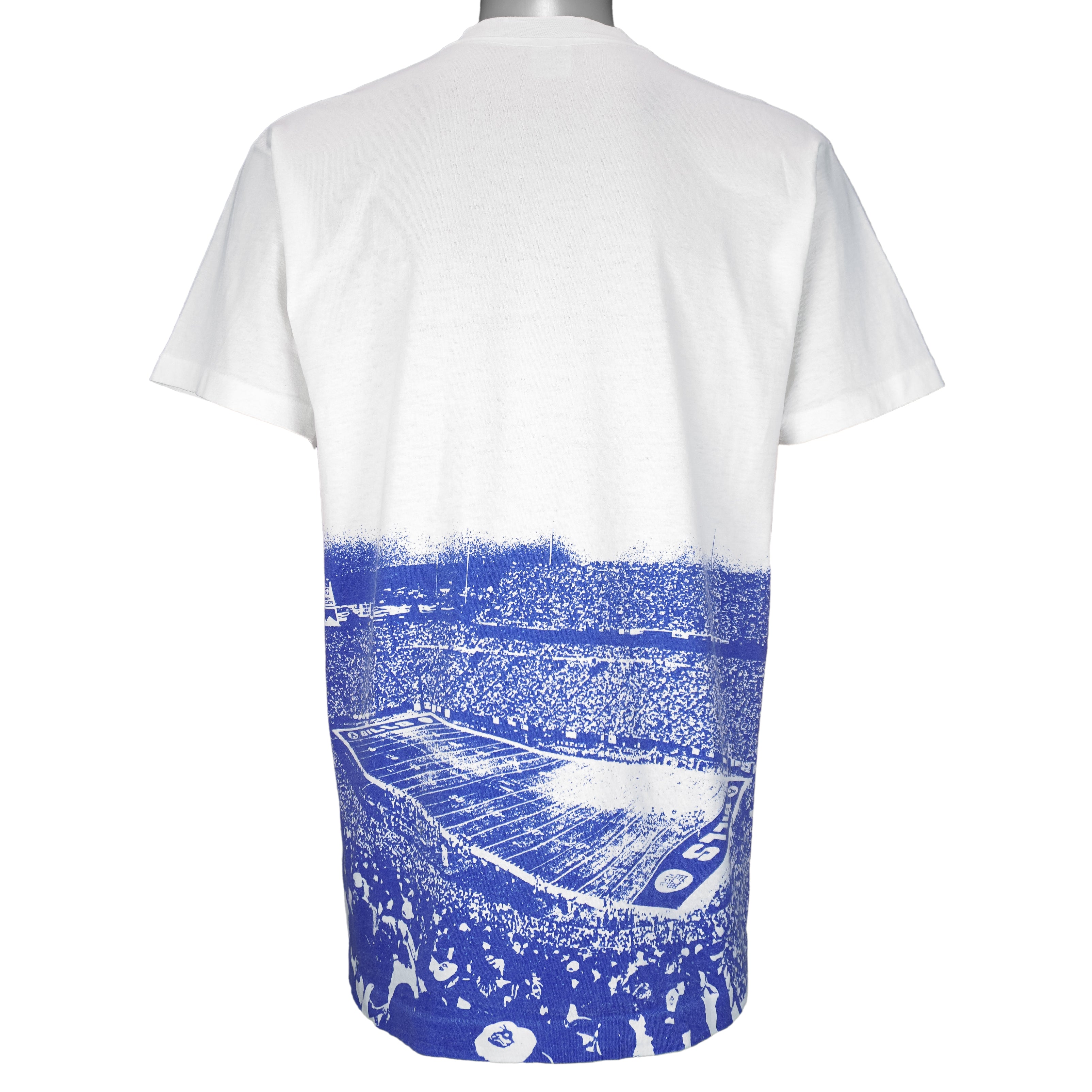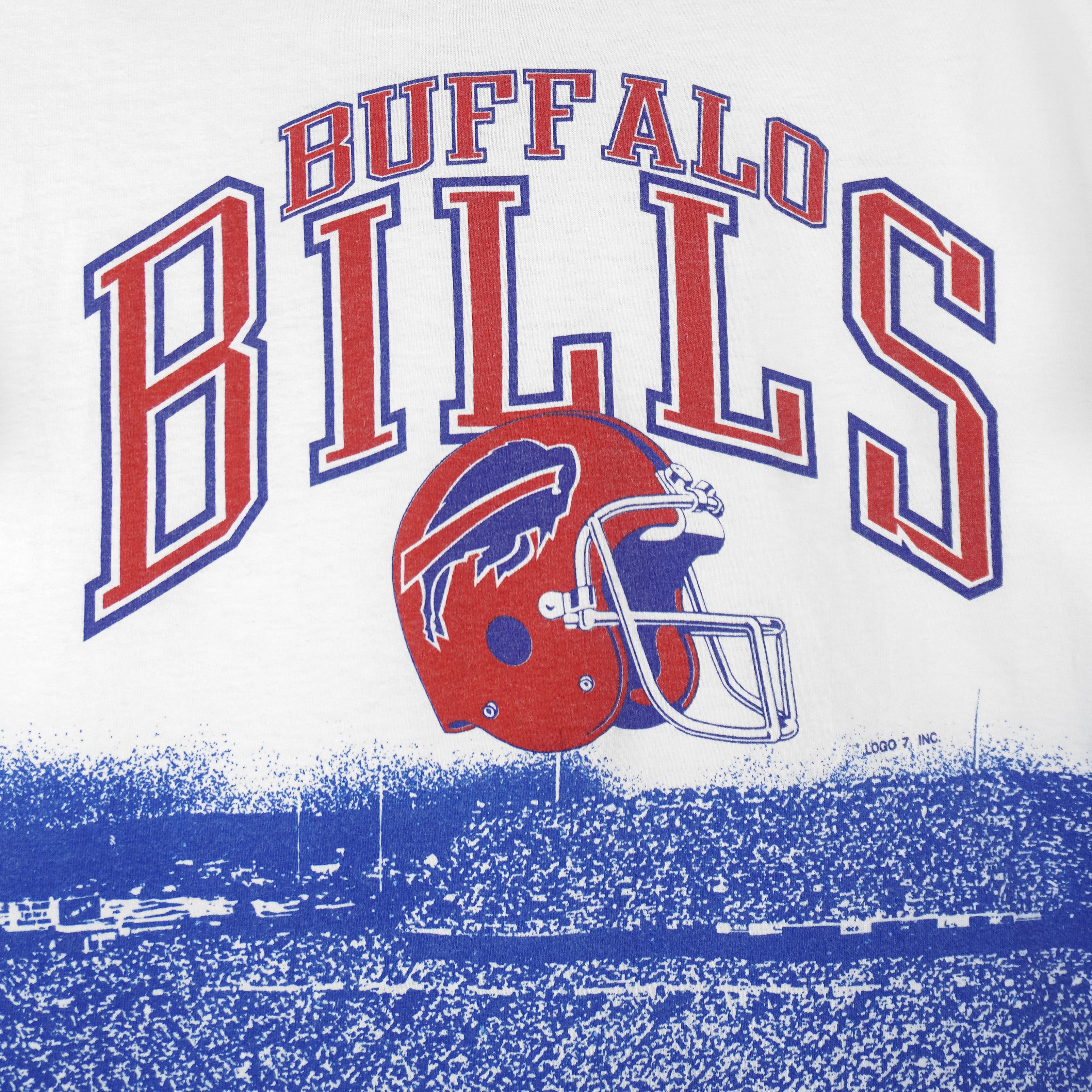 1990s Vintage NFL Buffalo Bills Helmet & Stadium Single Stitch T-Shirt by Logo 7/Fruit Of The Loom. White in color, fits large size and is in very good condition.