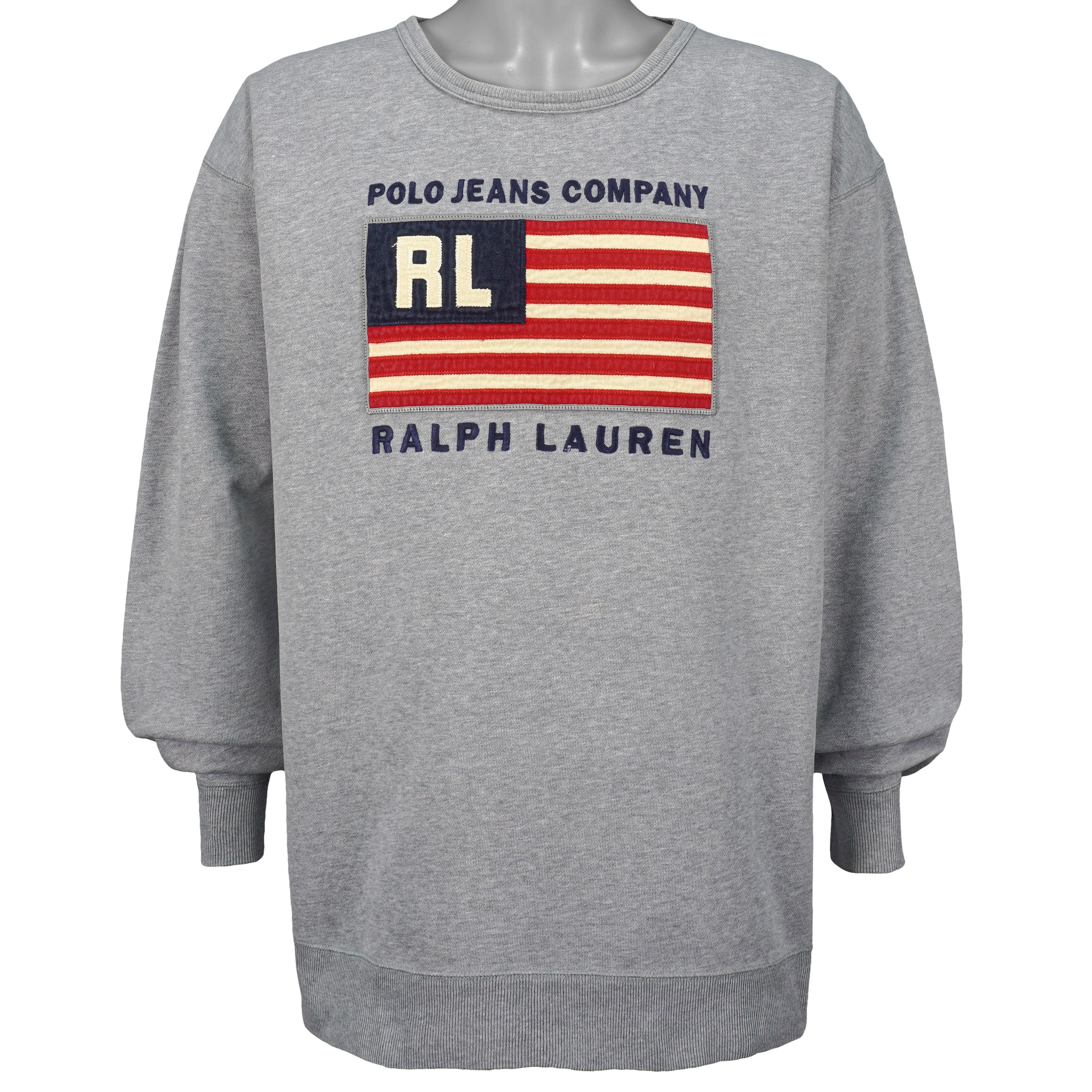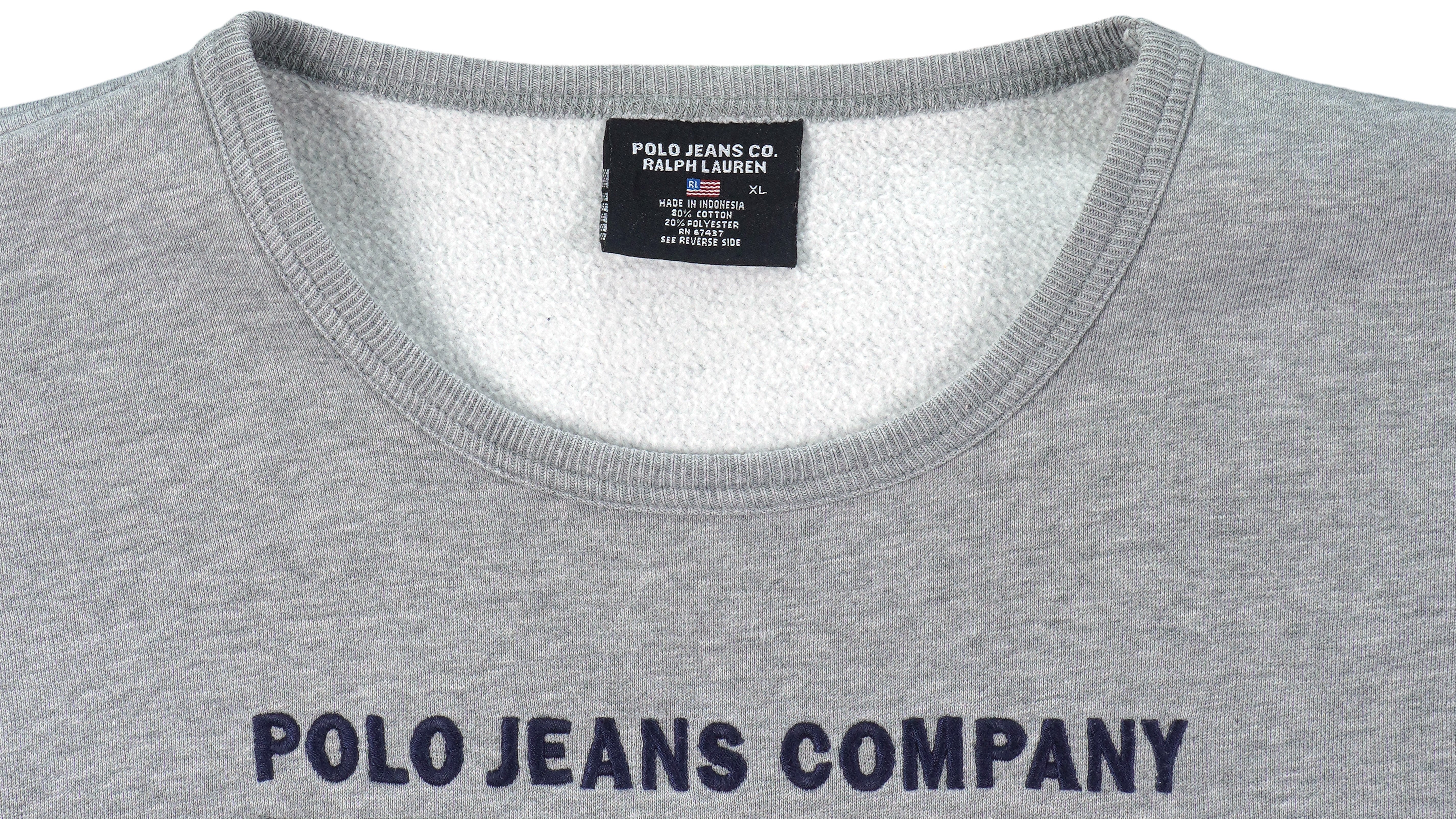1990s Vintage Ralph Lauren Polo Big Spell-Out Embroidered Crew Neck Sweatshirt. Grey in color, fitting X-large size and is in excellent condition.
