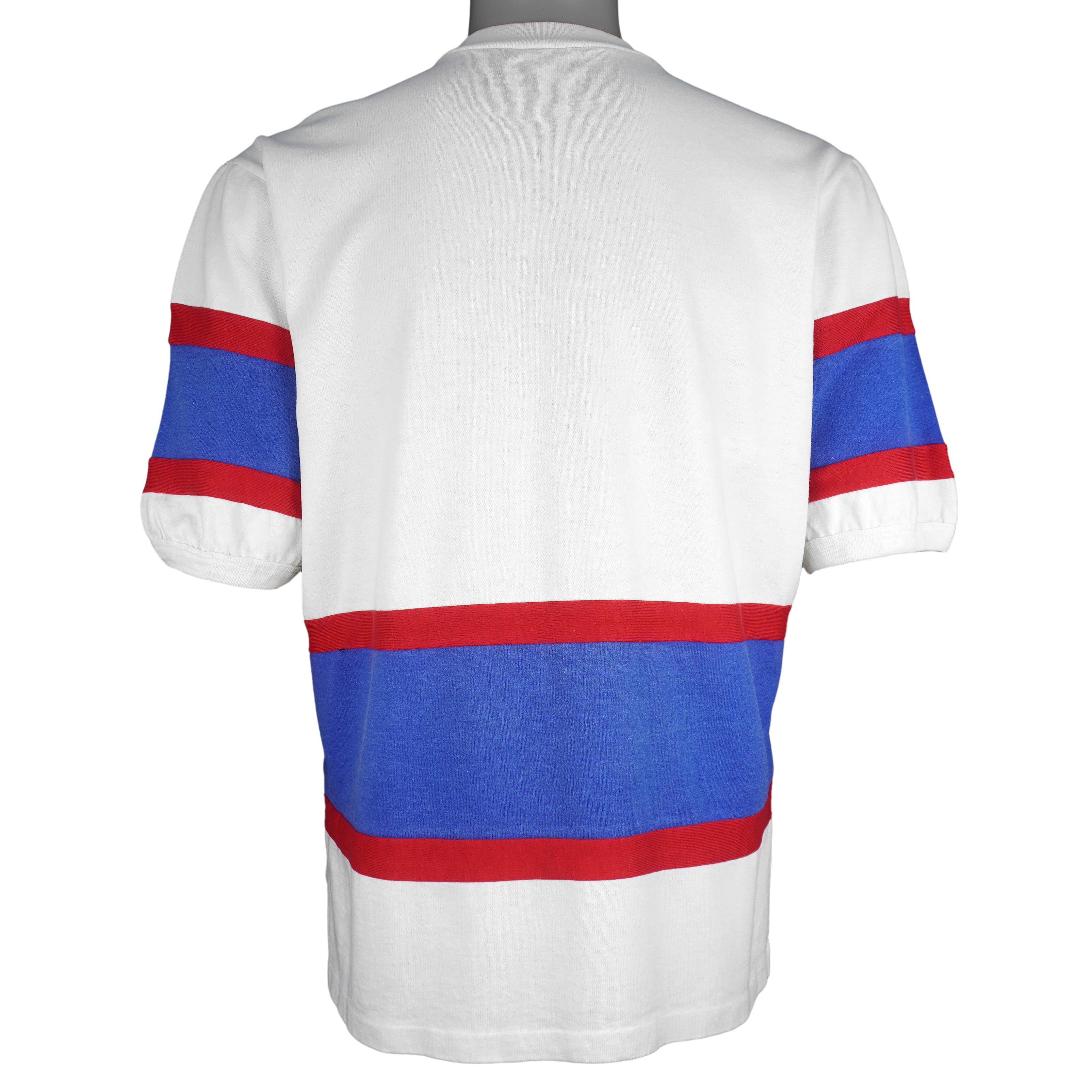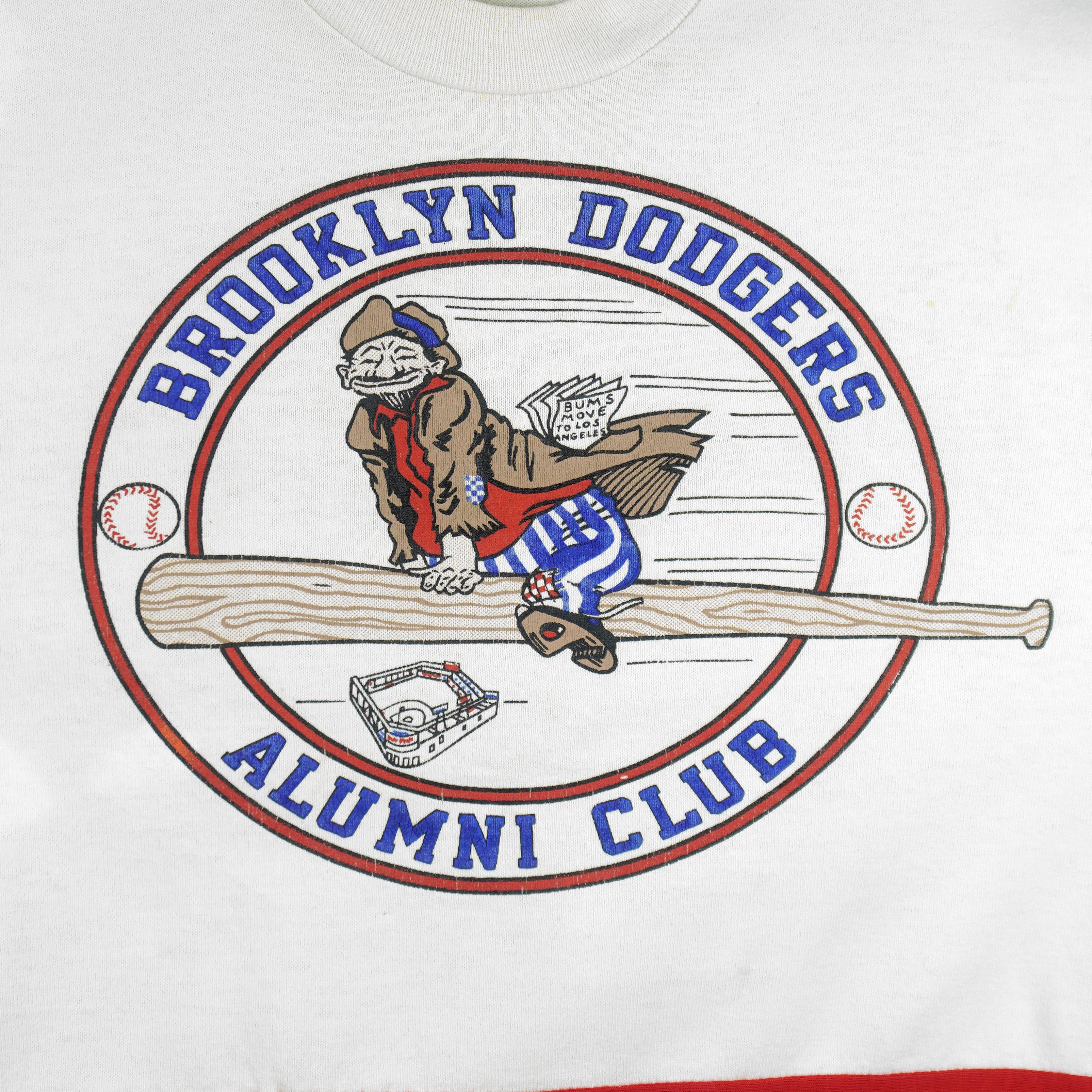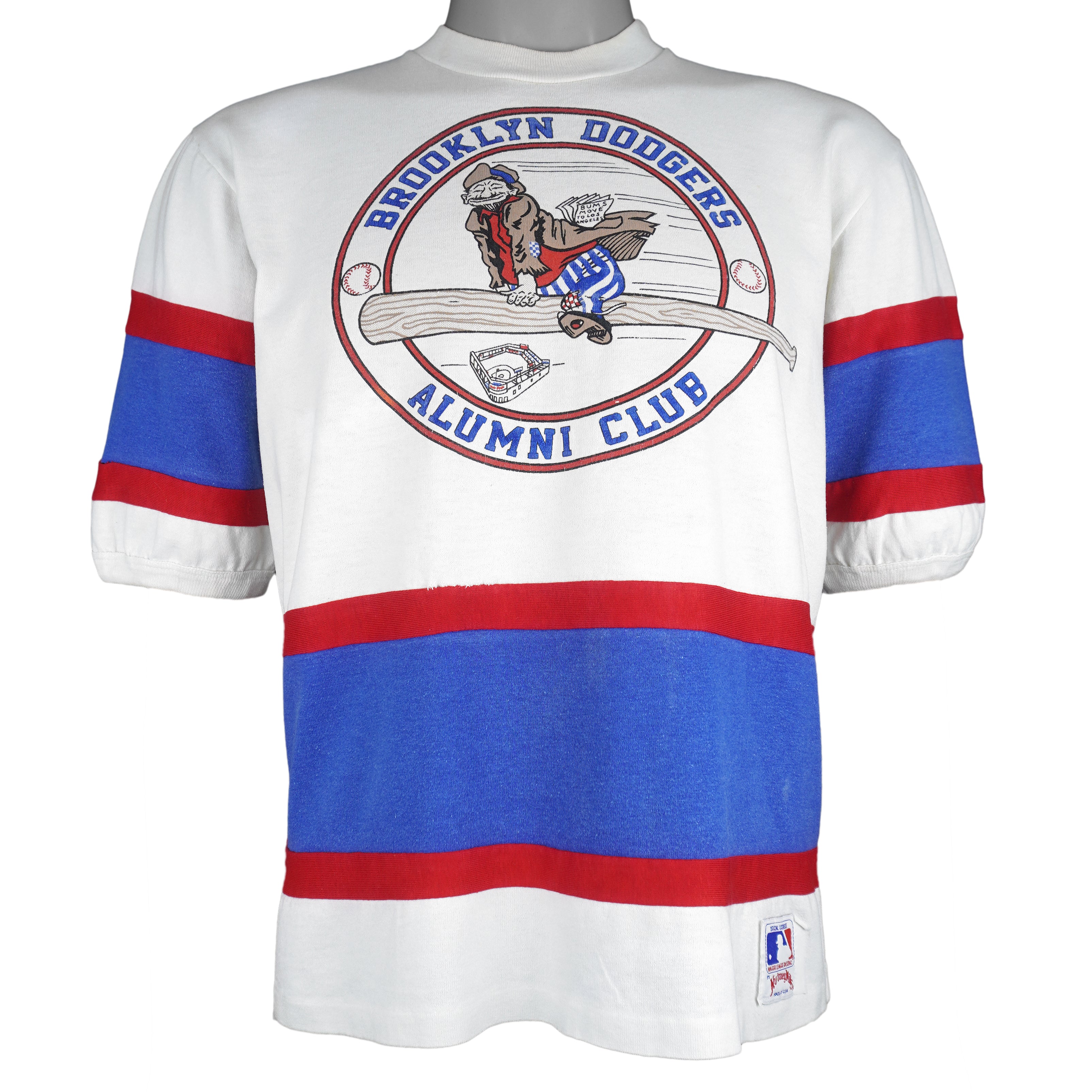 1990s Vintage MLB Brooklyn Dodgers Alumni Club Embroidered Jersey by Nutmeg Mills. White with blue and red striping, embroidered Dodgers crest on the chest and large alumni logo on the back. Classic 90s baseball jersey cut, tagged Medium and fits true to size. In very good condition with light signs of wear and minor marks consistent with vintage age.