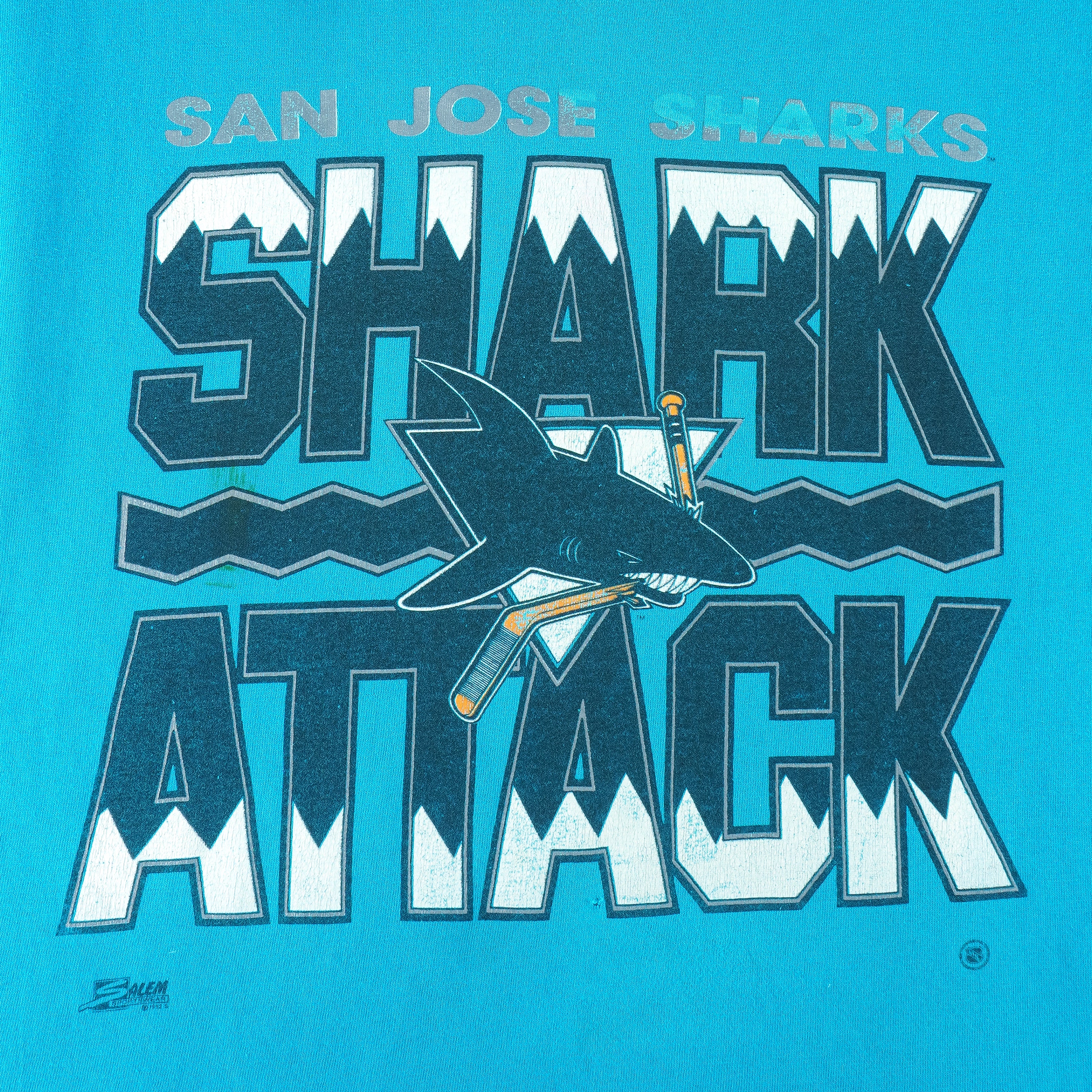 1992 Vintage NHL San Jose Sharks Attack Big Spell-Out & Logo T-Shirt by Salem. Blue in color, fits an X-large size with signs of wear and shows aging on screen-print and is otherwise in very good condition.