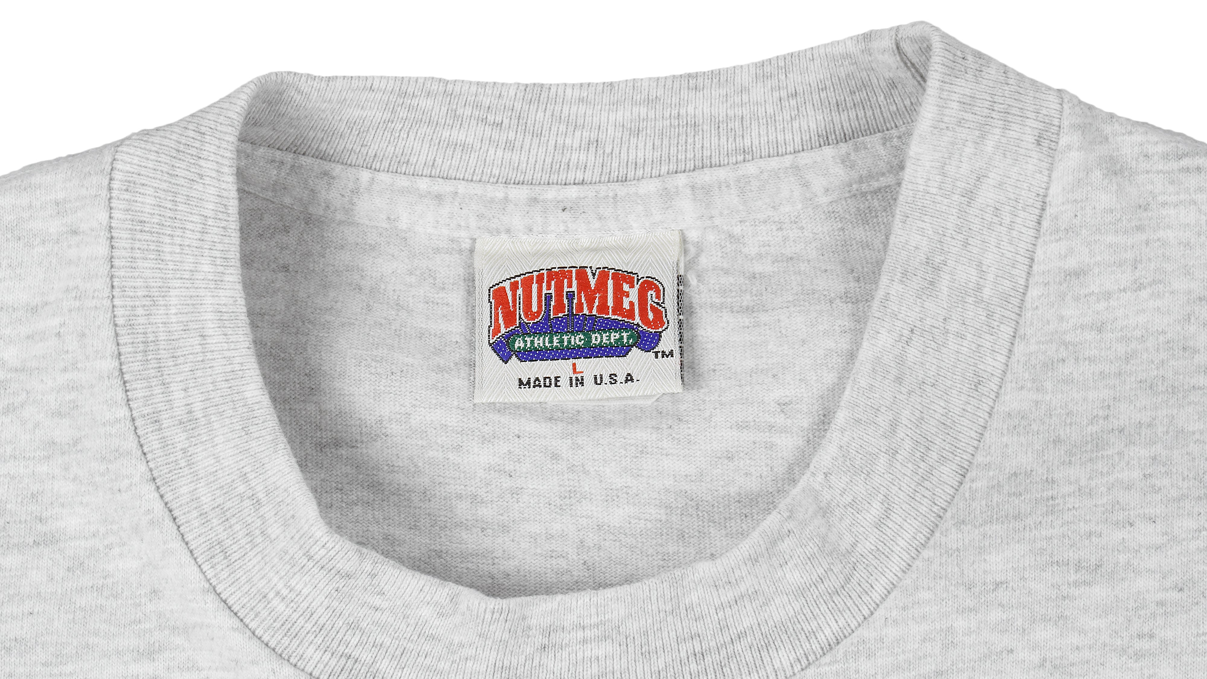 1990s Vintage NFL San Francisco 49ers, Western Conference Spell-Out T-Shirt by Nutmeg Mills. Grey in color with big logo on the front. Fits large size and is in excellent condition.