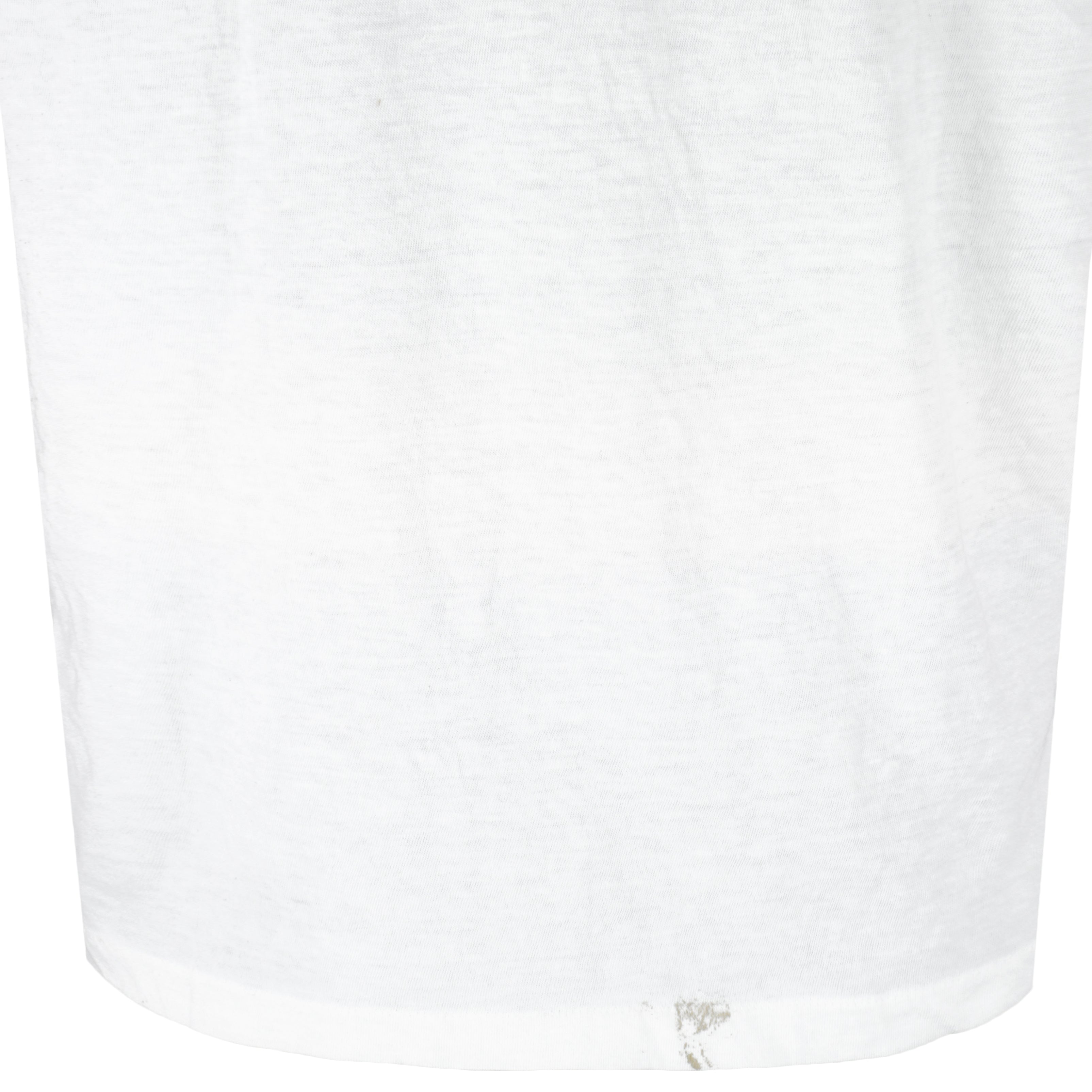 1990 vintage NHL Calgary Flames T-Shirt by CGW. White in color with big flaming 'C' and spell-out, fits large in size and is in excellent condition (with small mark on back hem).