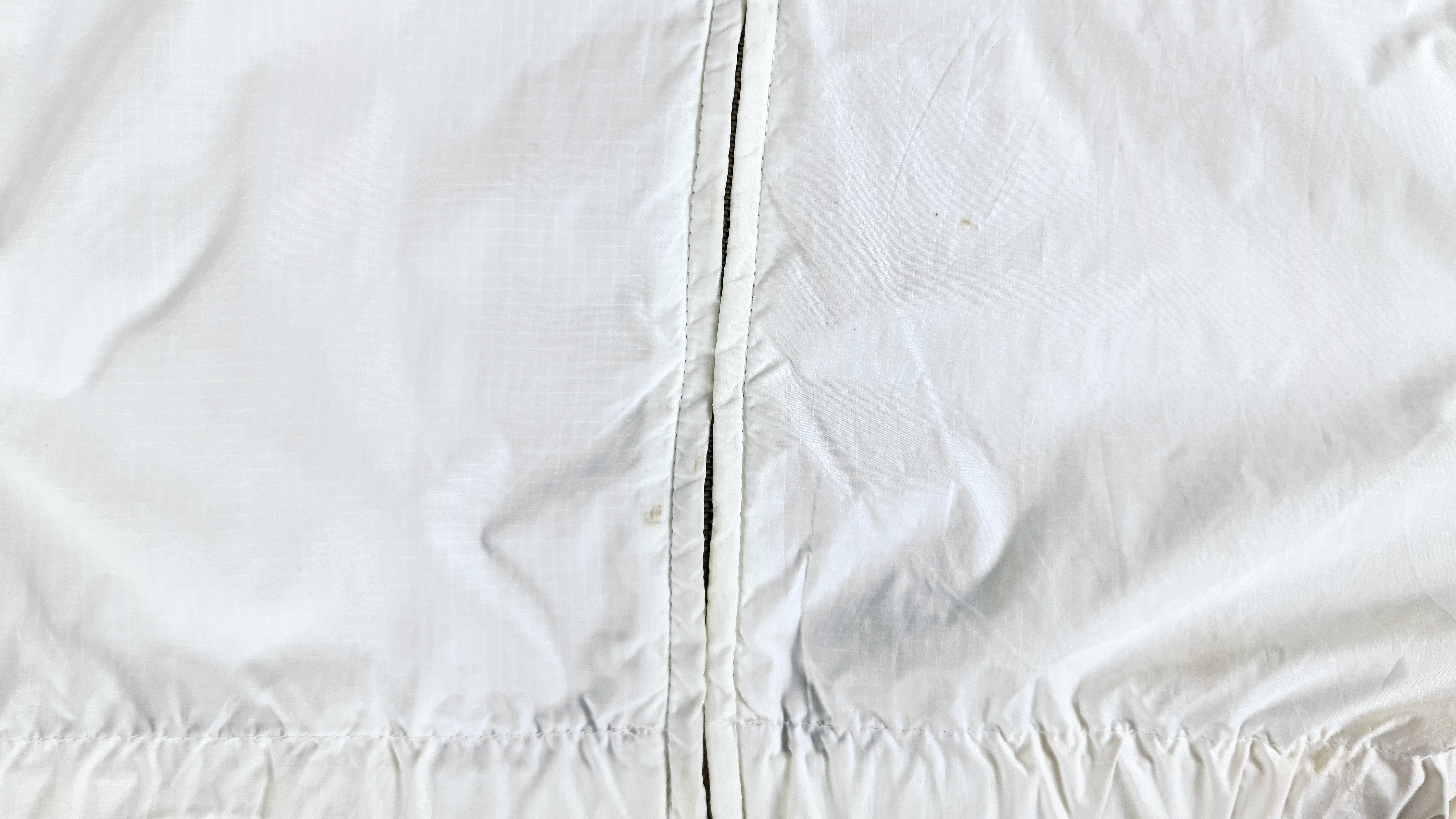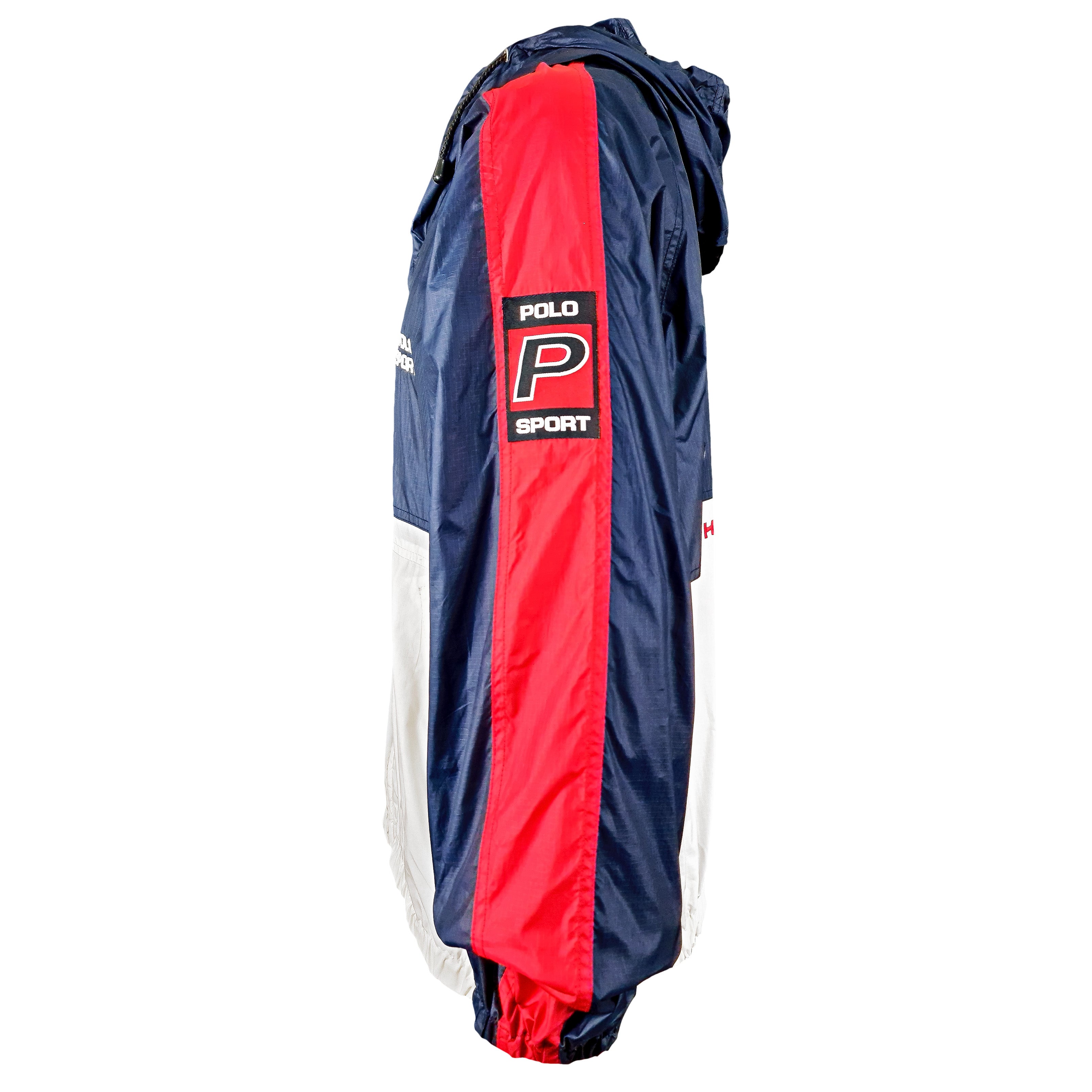 1990s Vintage Polo Sports Big Spell-Out Hooded Windbreaker. White and blue in color, fit like X-large, tag large size and is in excellent condition.