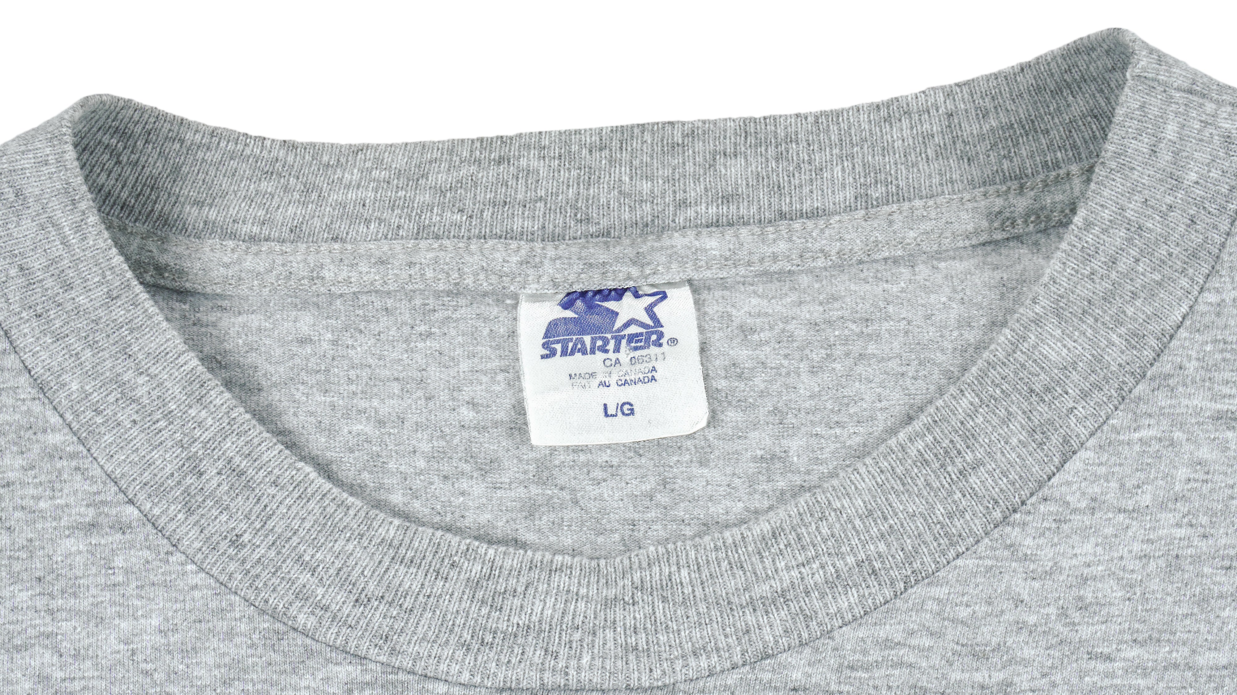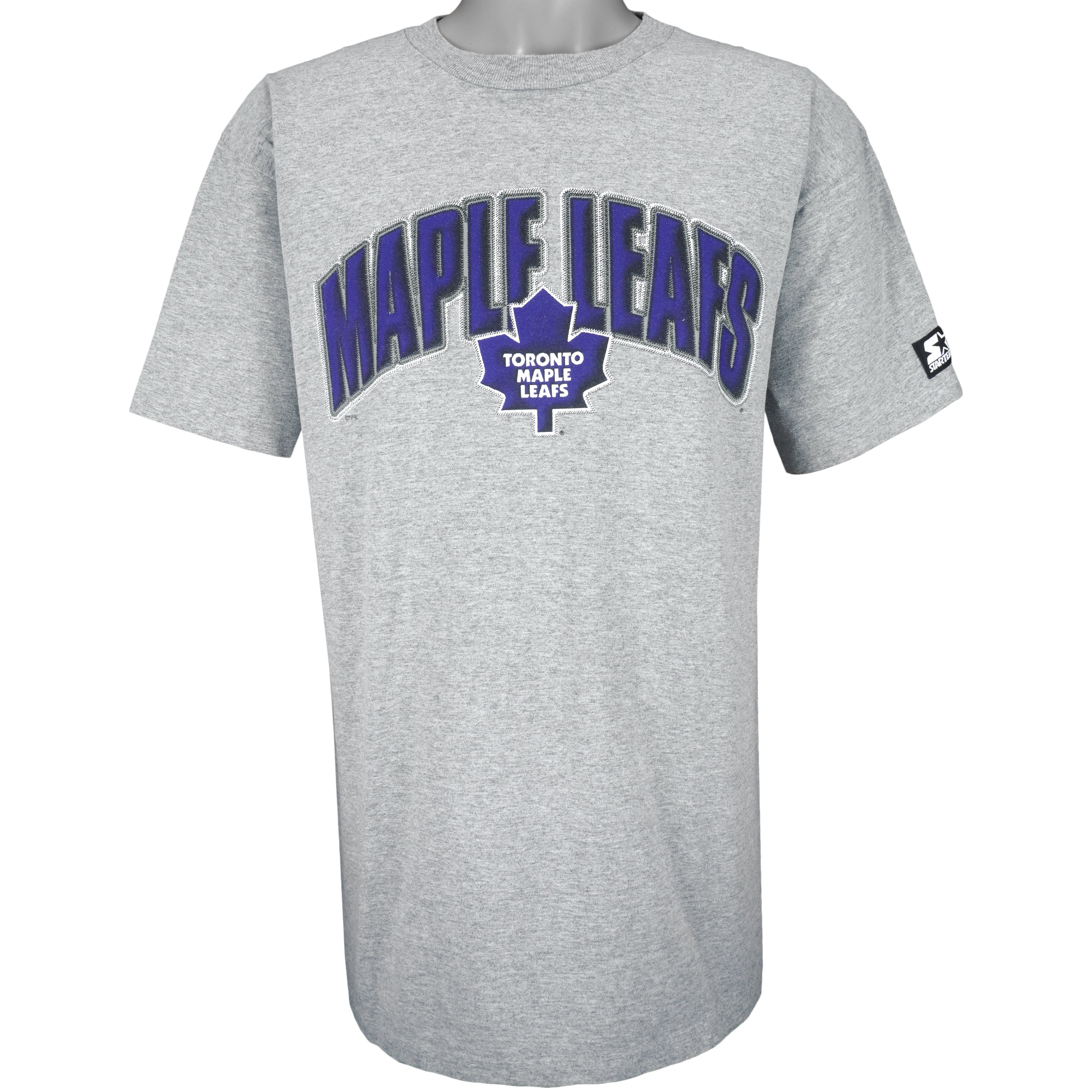 1990s Vintage Starter NHL Toronto Maple Leafs Big Spell-Out T-Shirt. Grey in color, fits large size and is in excellent condition.