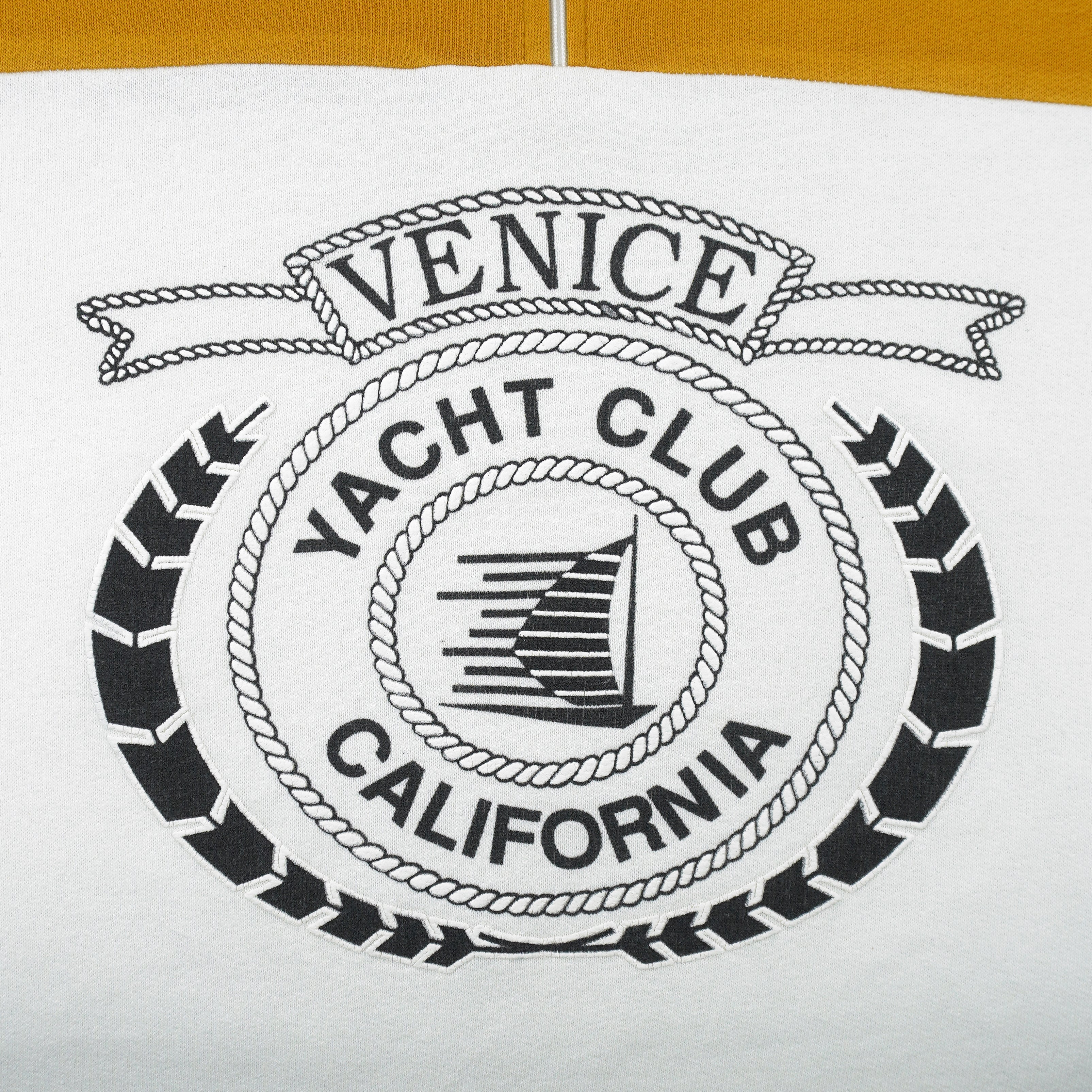 1990s Vintage Venice Yacht Club California Spell-Out 1/4 Zip Sweatshirt. White and yellow in color, fitting a medium size with sign of wear, minor marks and is otherwise in very good condition.