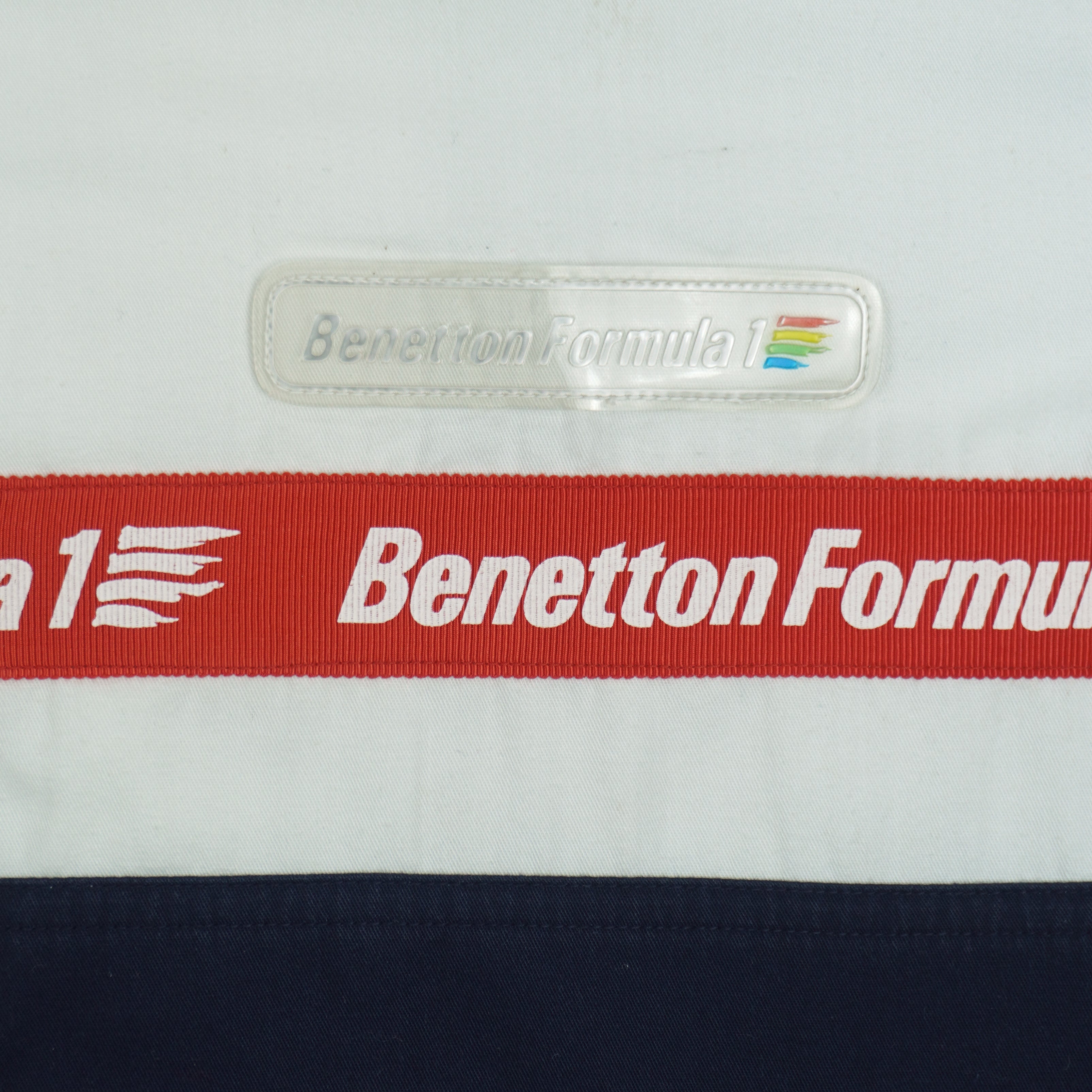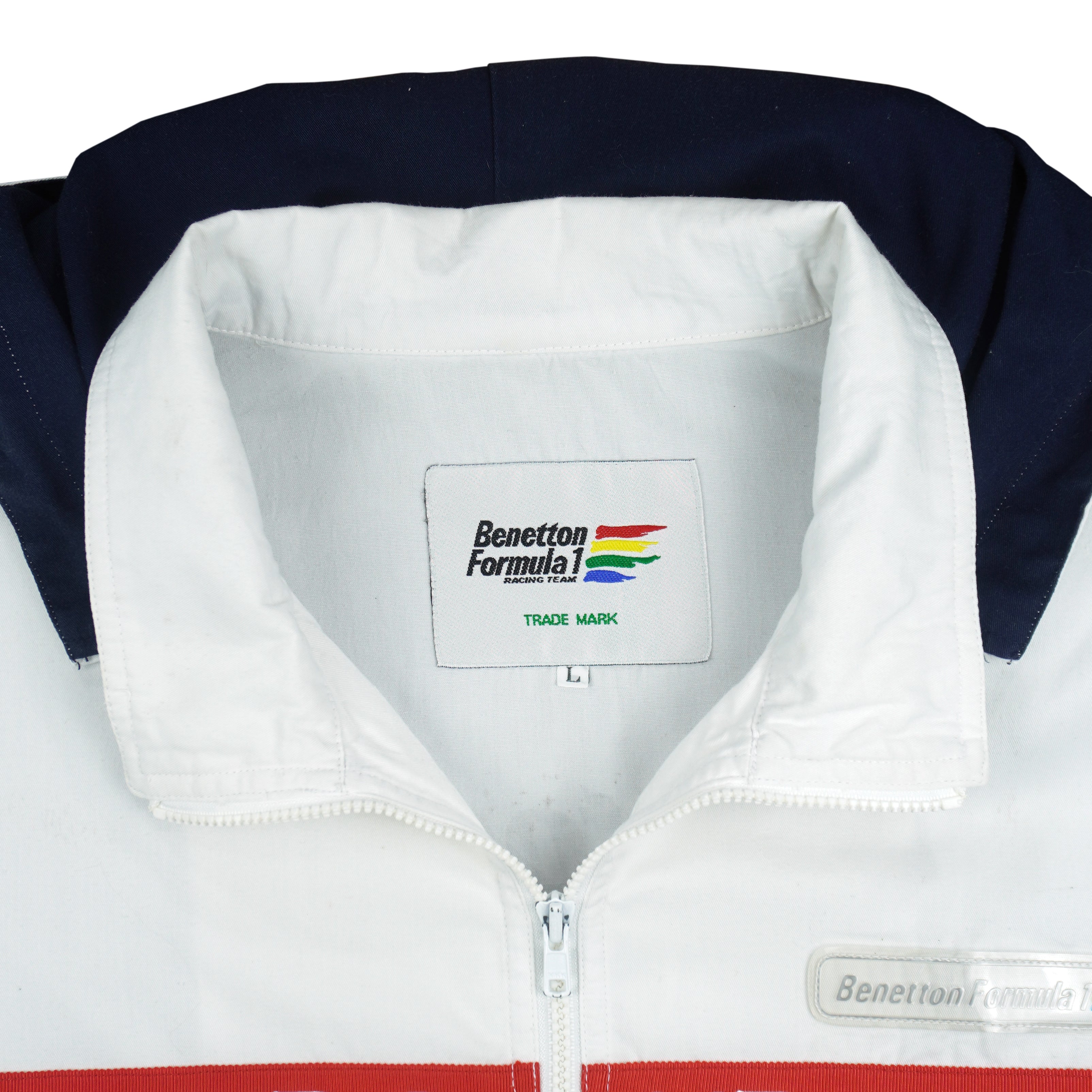 1990s Vintage NASCAR Benetton Formula 1 Racing Team Hooded Jacket. White with blue in color, fits a large size with signs of wear, worn-out logo, minor marks and is otherwise in good condition.