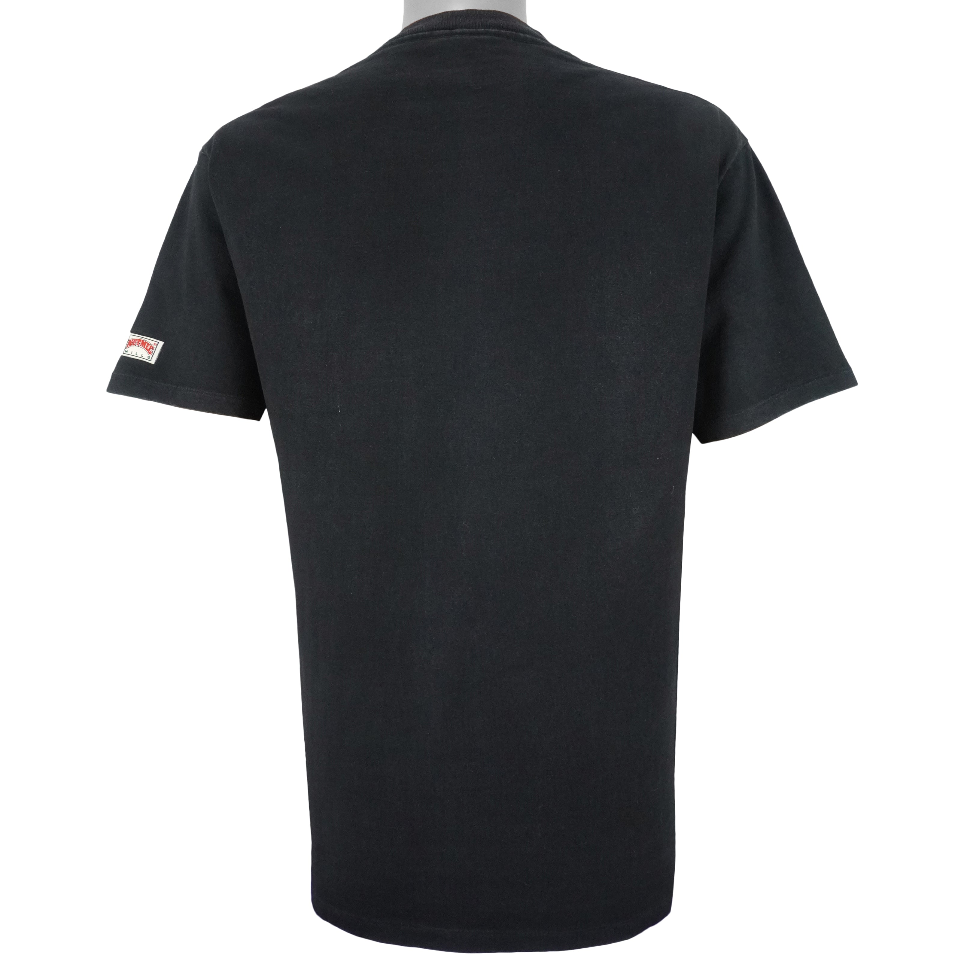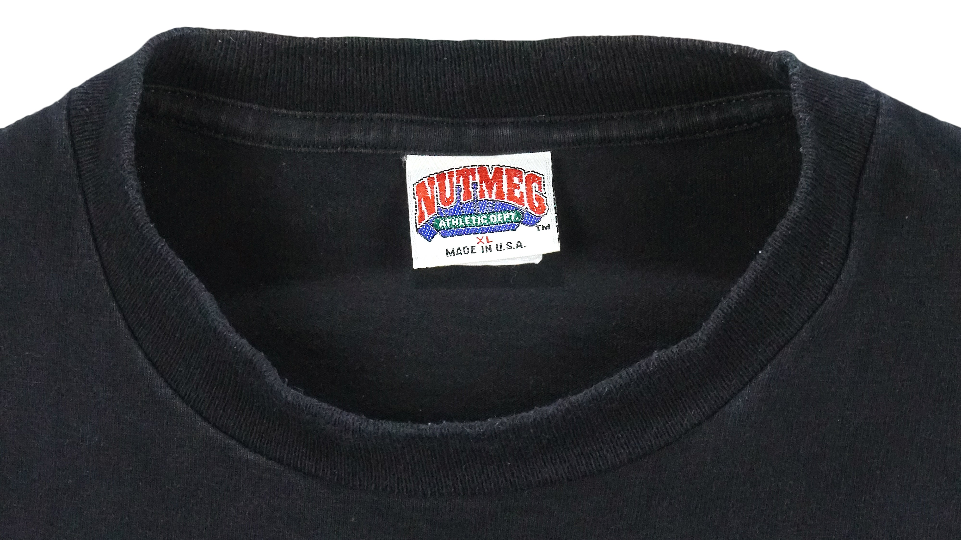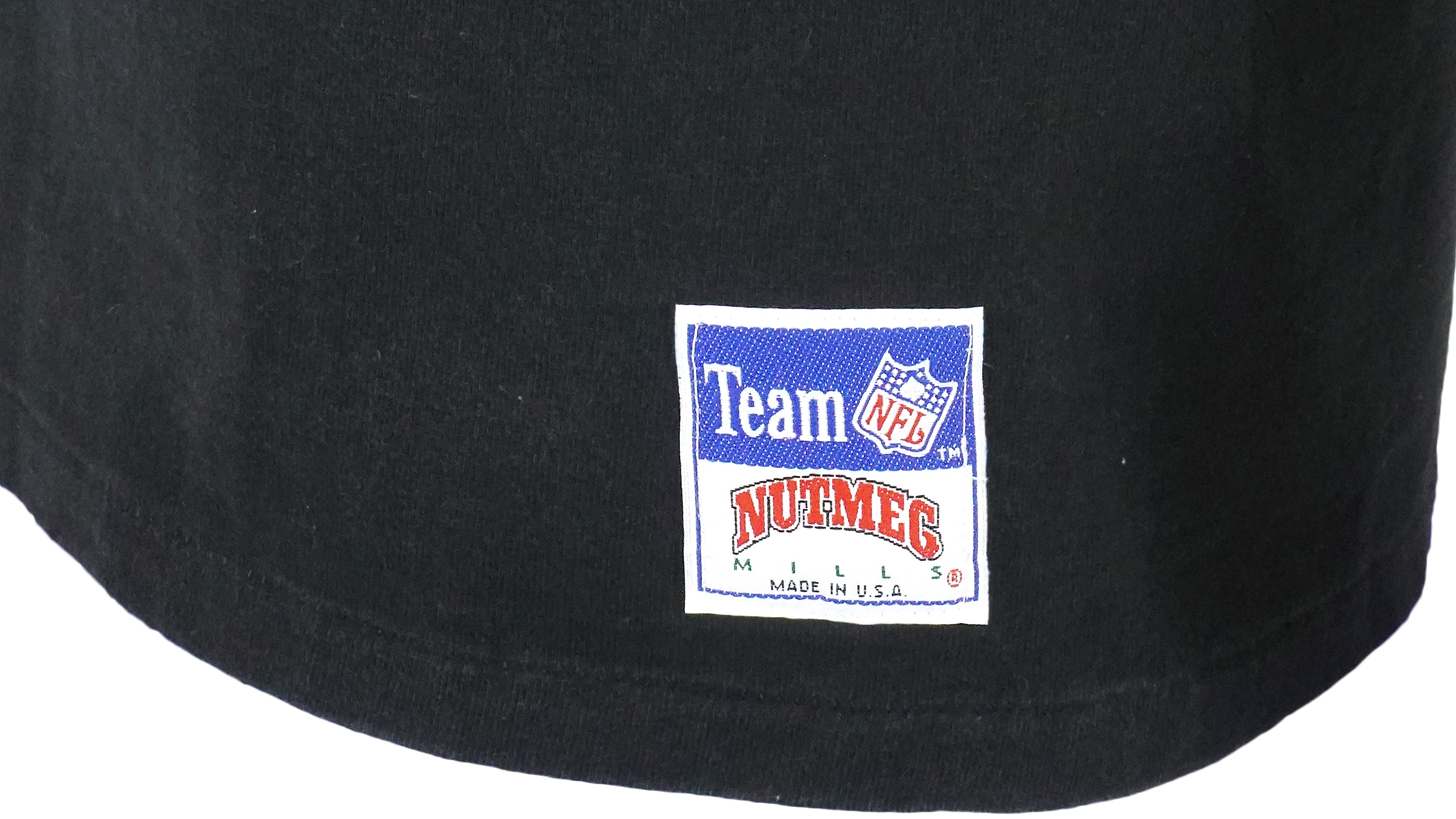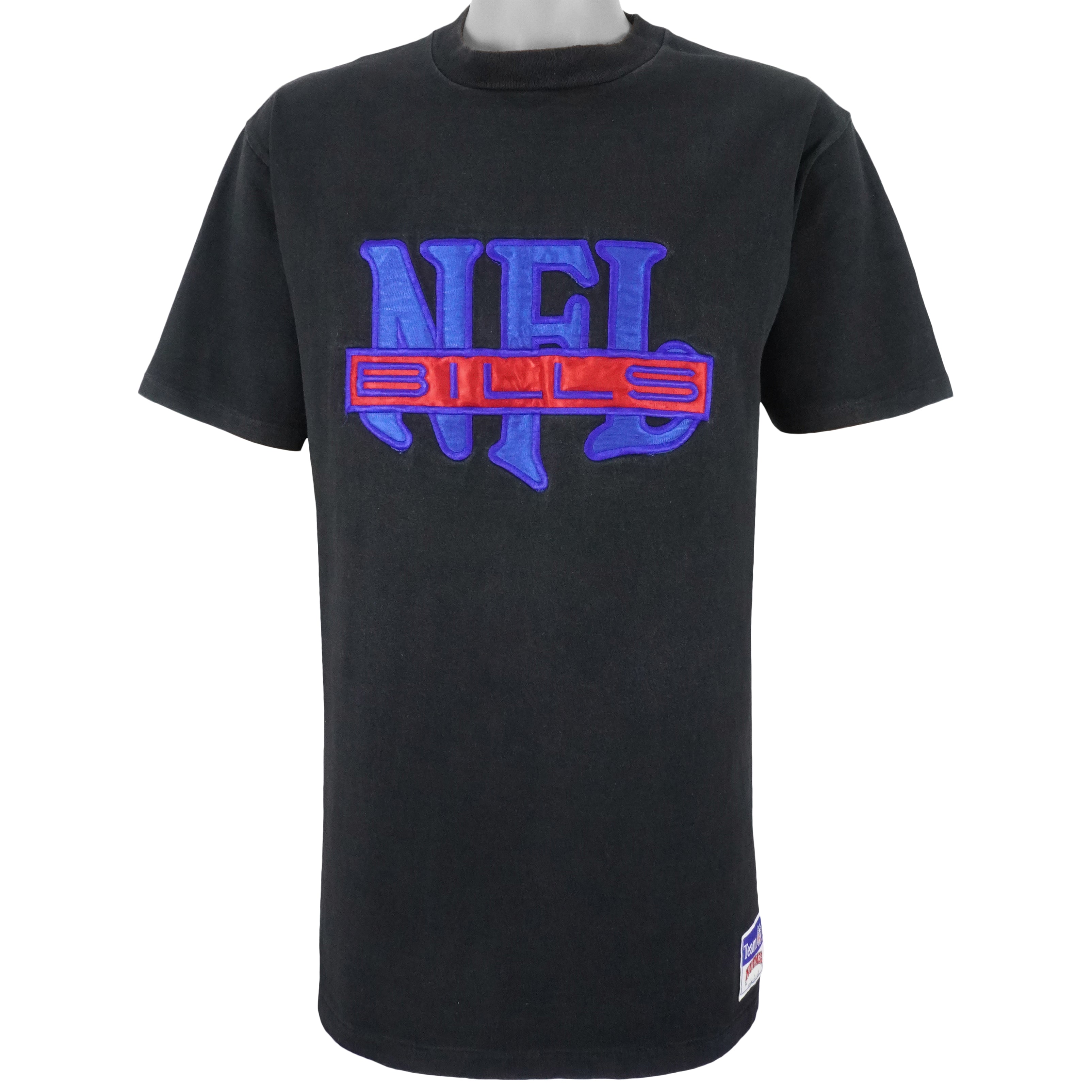 1990s Vintage NFL Buffalo Bills Spell-Out T-Shirt by Nutmeg Mill. Black in color, tag is X-large but fitting like large size and is in excellent condition.