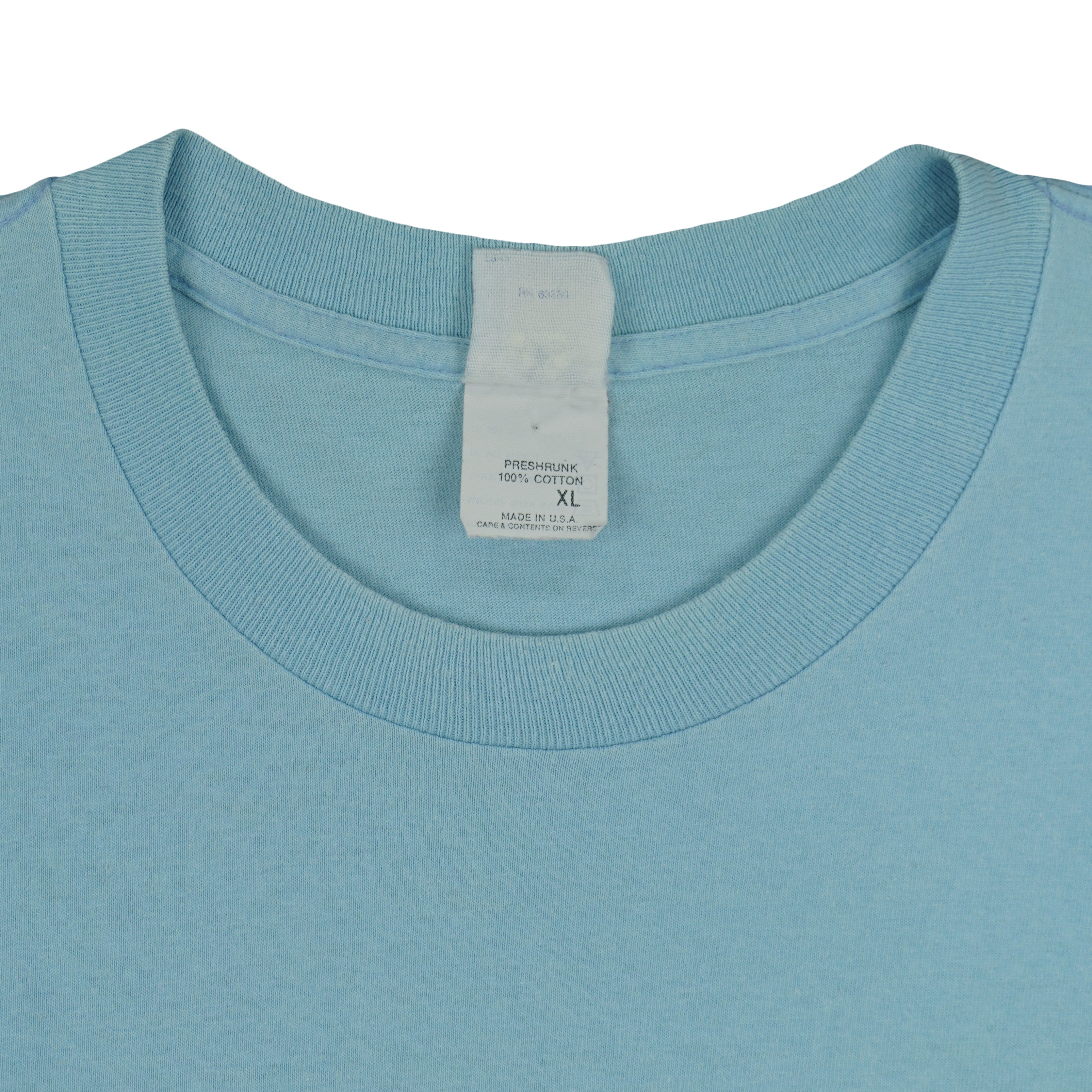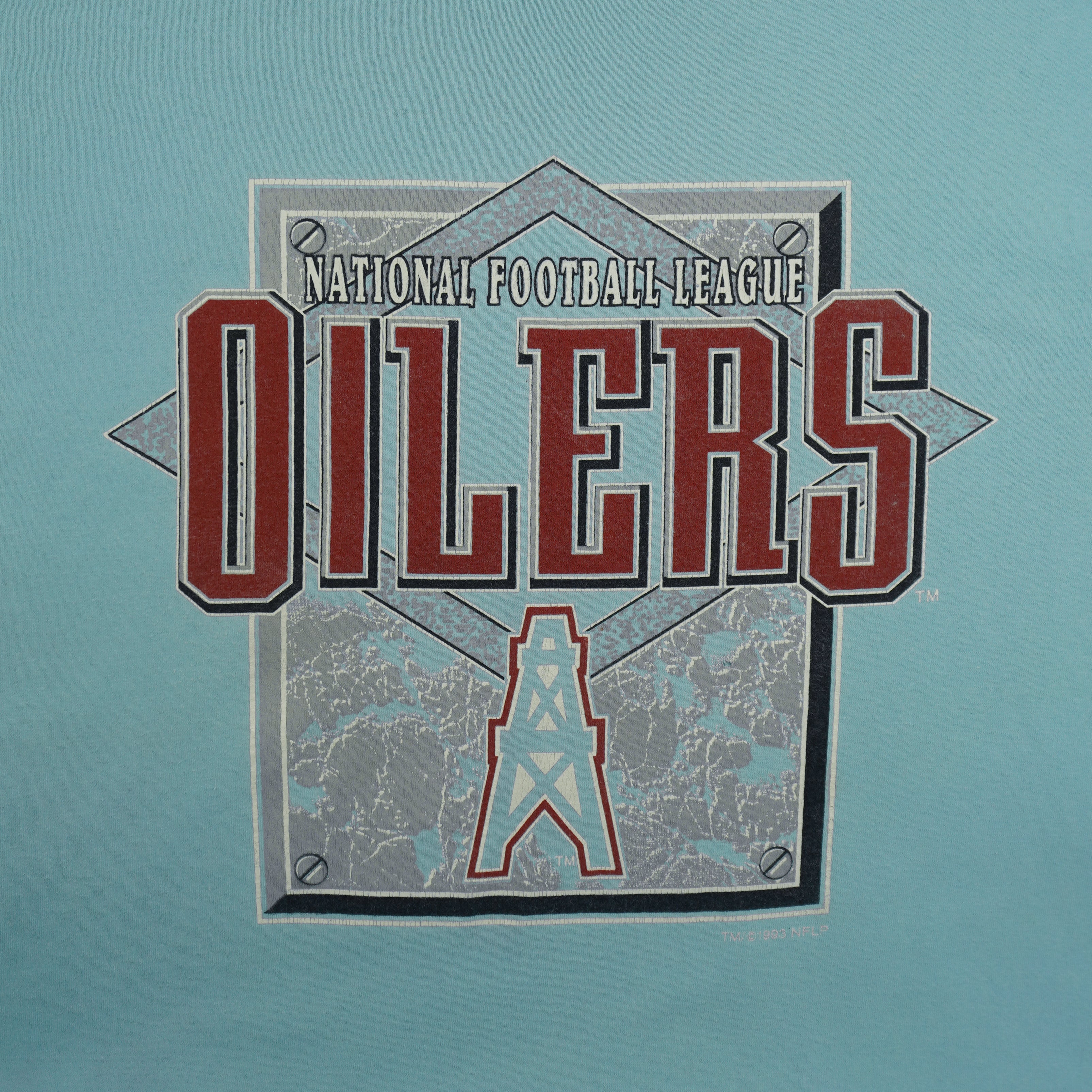 1993 Vintage NFL Houston Oilers T-Shirt by Competitor. Light blue in color, big spell-out & logo, tag shows X-large but fits like a large size with signs of wear, marks on front, sleeve with fading areas and is otherwise in very good condition.