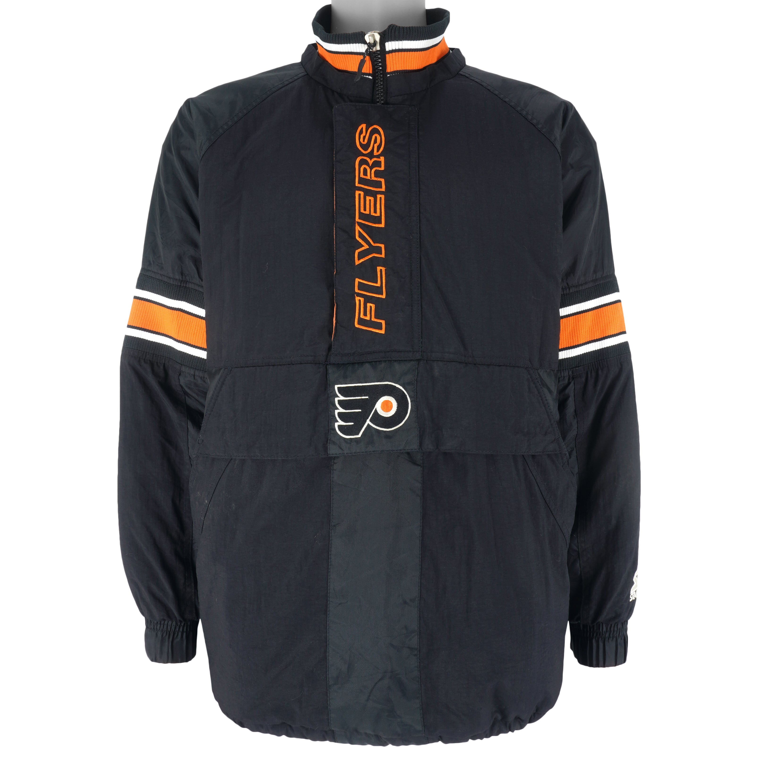 1990s Vintage Starter NHL Philadelphia Flyers Embroidered 1/2 Zip Pullover Jacket. Black with orange in color, tag is medium but fits like large size and is in excellent condition.