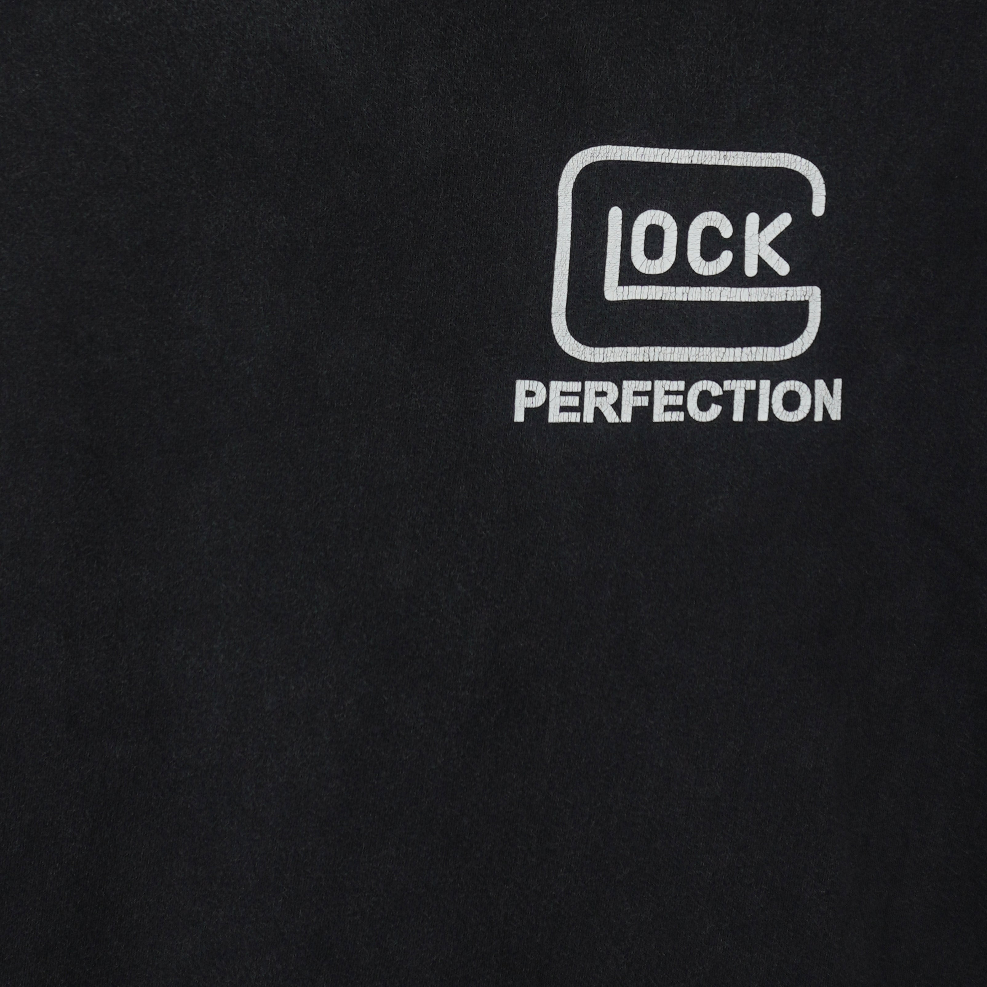 1990s Vintage Glock Perfection Safe Action Pistol T-Shirt by Survivors. Black in color, features bold spell-out logos on both front and back. Tag shows X-large but fitting like a large size and is in excellent condition.