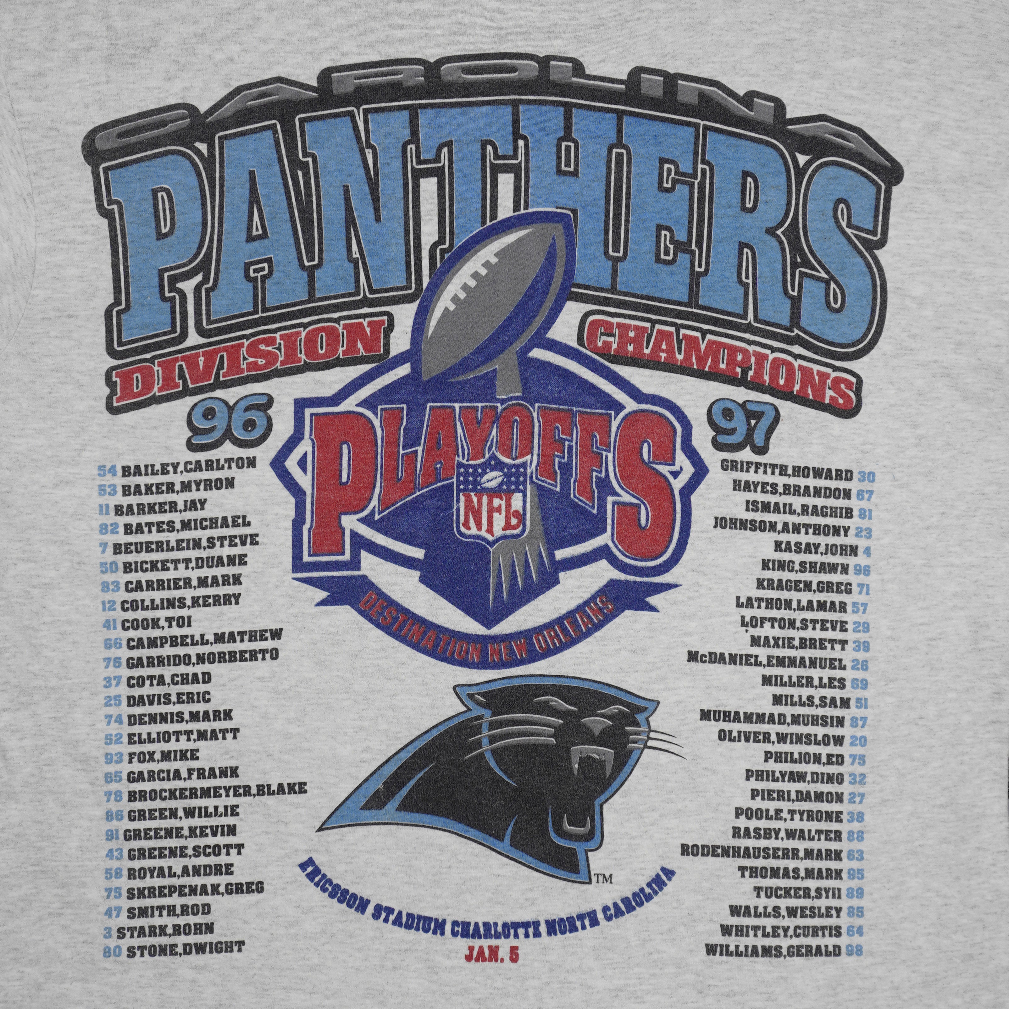 1996-97 Vintage NFL Carolina Panthers - Divisional Playoffs Long Sleeved Shirt. Grey in color, fits an X-large size with signs of wear - minor marks, fainted screen due to aging and is otherwise in very good condition.