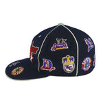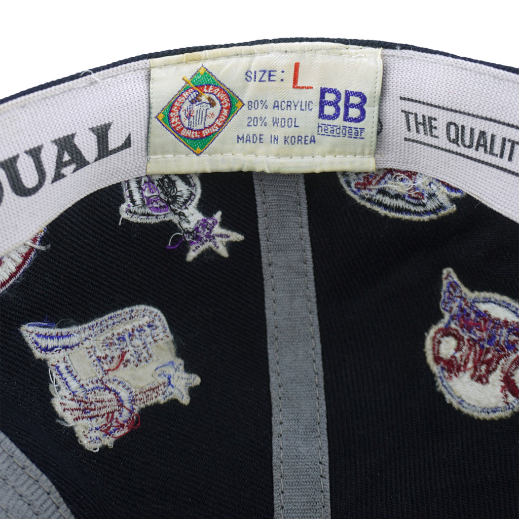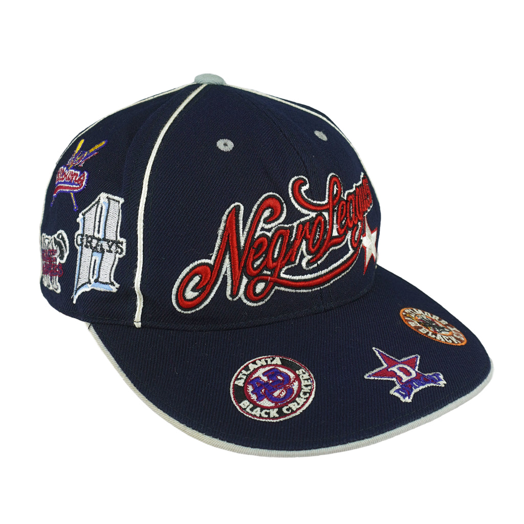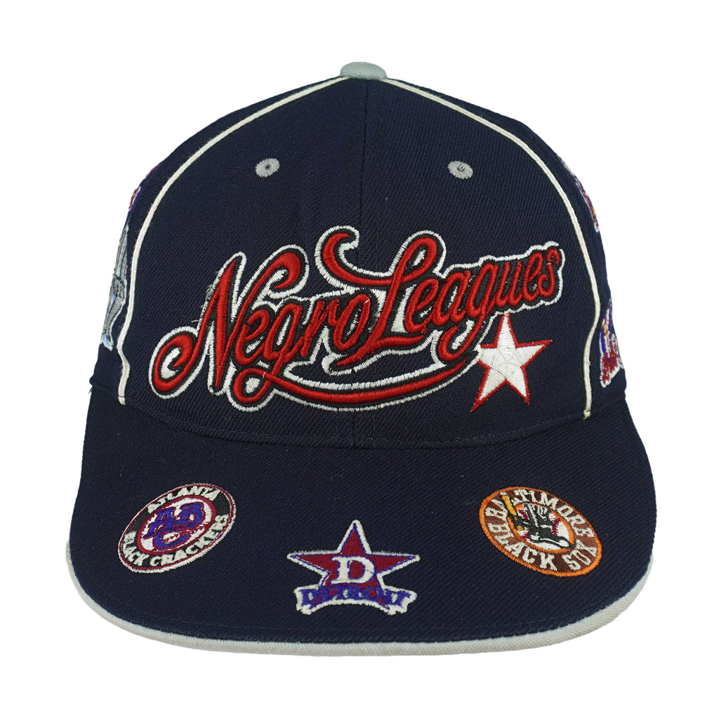 2000s Vintage MLB Negro Leagues Baseball Team Logos Fitted Hat. Dark blue in color, featuring logos of legendary teams, including iconic teams such as the Baltimore Black Sox, Atlanta Black Crackers, Newark Eagles, Memphis Red Sox, and many more. Tag shows a large but fits like fitted size with signs of wear and is otherwise in very good condition.