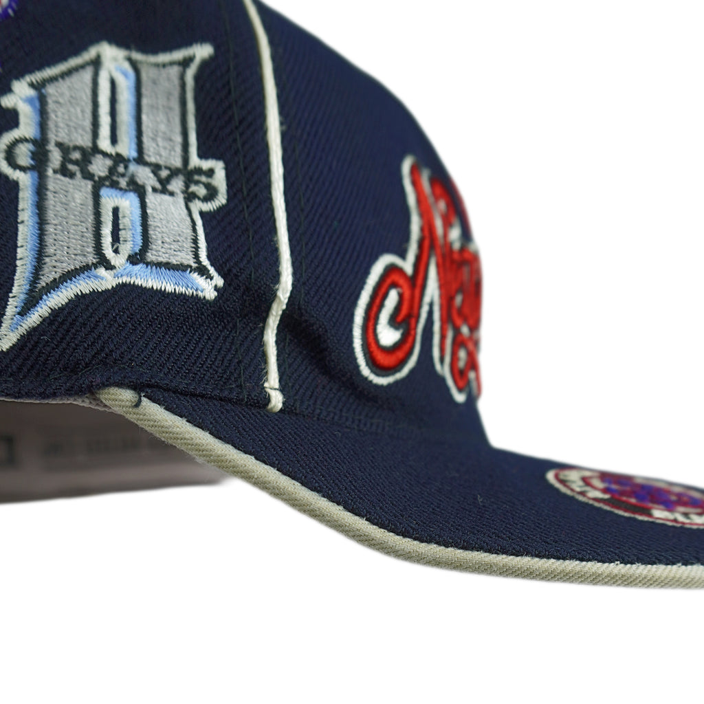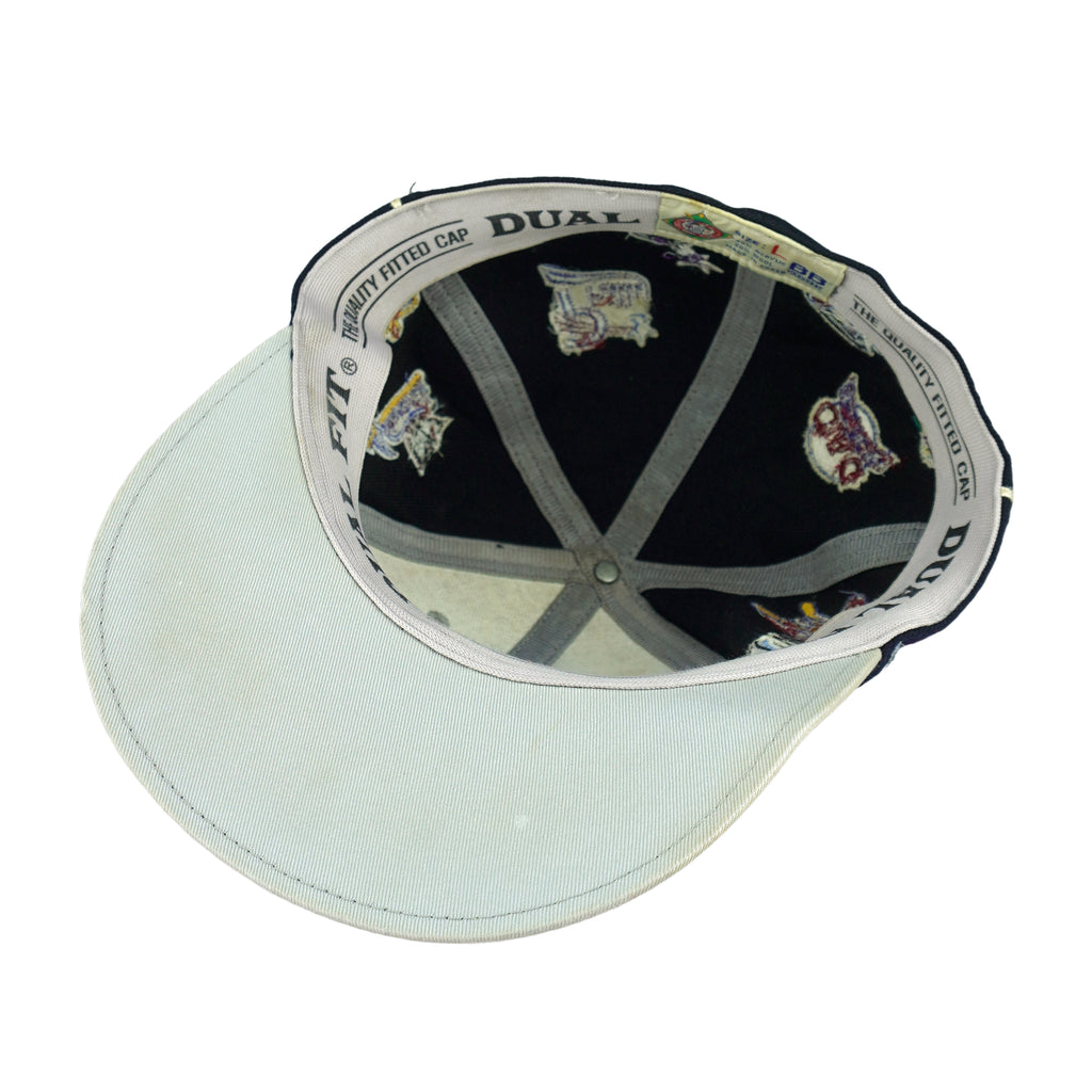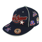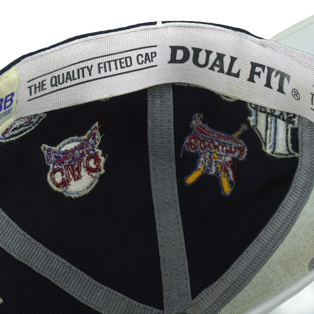 2000s Vintage MLB Negro Leagues Baseball Team Logos Fitted Hat. Dark blue in color, featuring logos of legendary teams, including iconic teams such as the Baltimore Black Sox, Atlanta Black Crackers, Newark Eagles, Memphis Red Sox, and many more. Tag shows a large but fits like fitted size with signs of wear and is otherwise in very good condition.