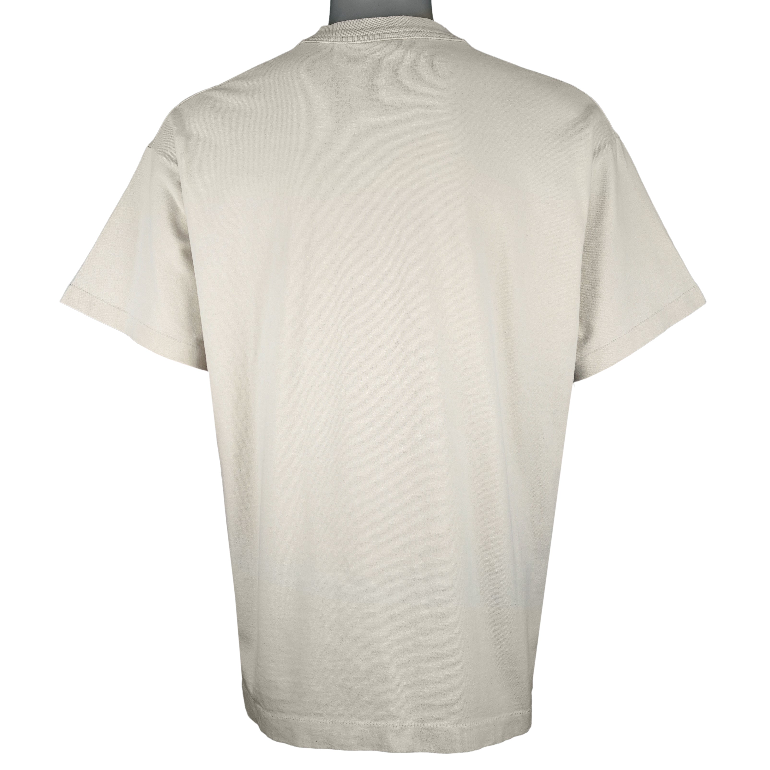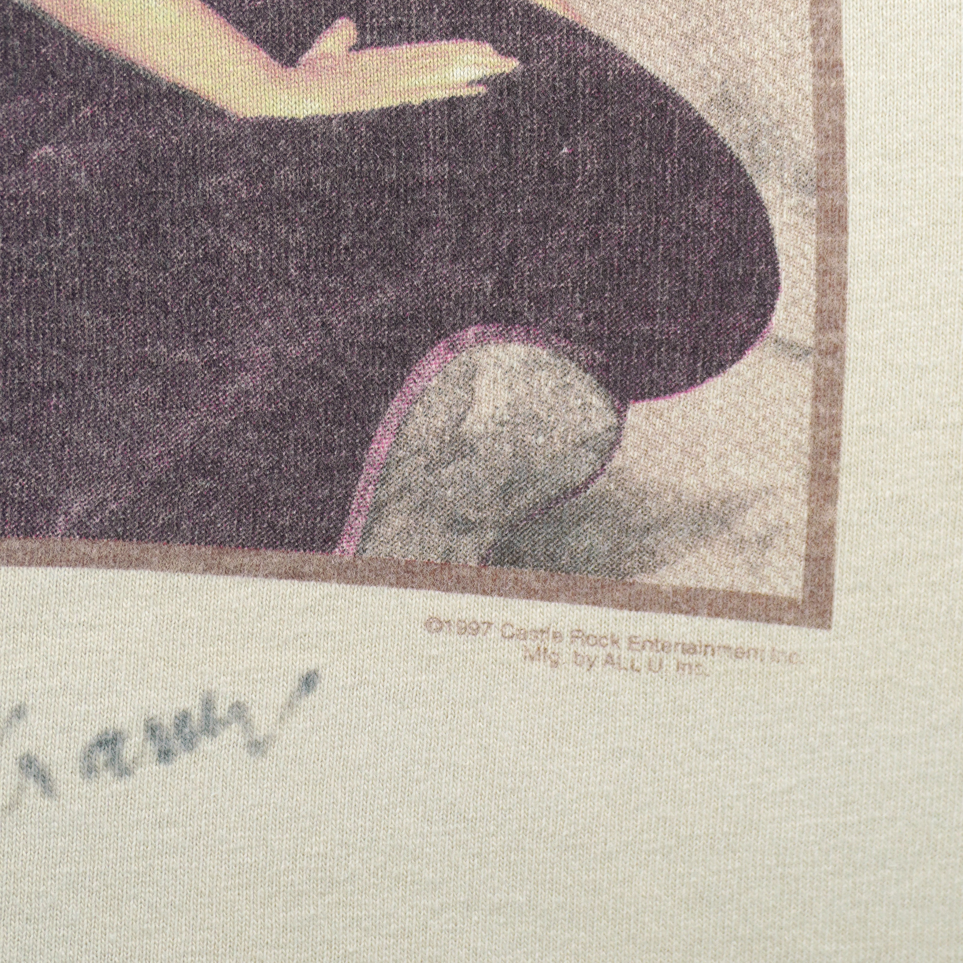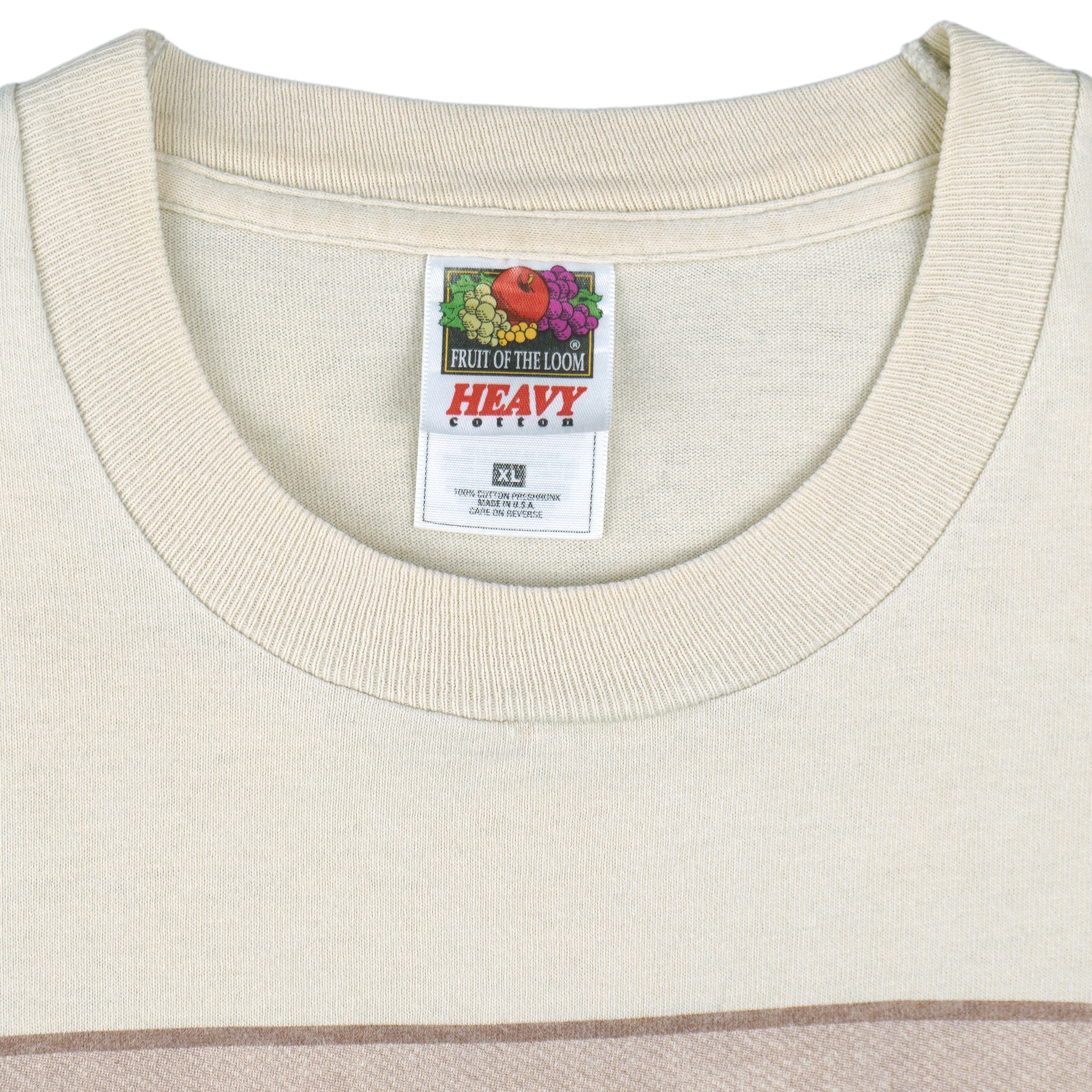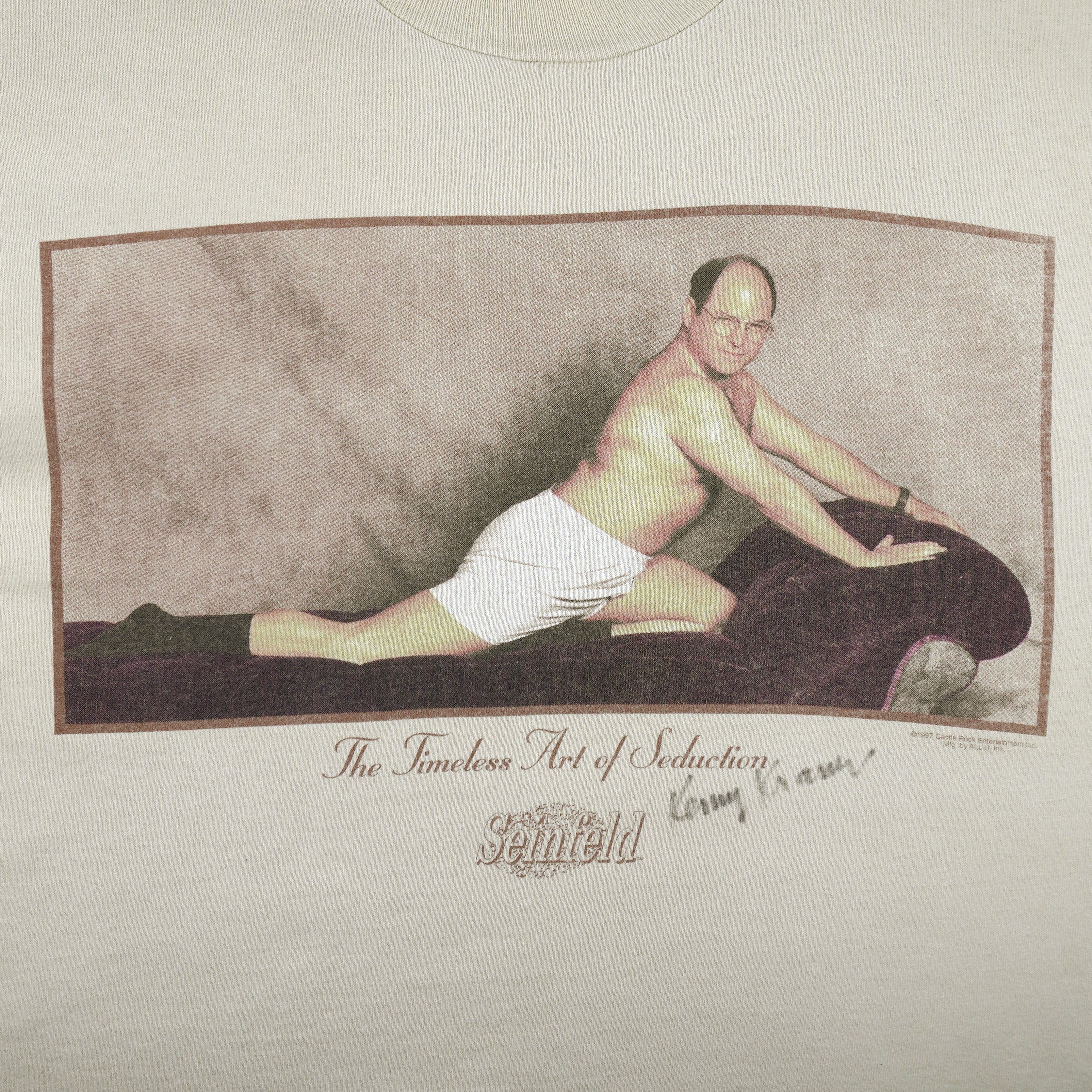 1997 Vintage Seinfeld George Costanza "The Timeless Art of Seduction" T-Shirt by Fruit Of The Loom. Beige in color, featuring the iconic image of George Costanza posing seductively on a velvet couch from the legendary “The Timeless Art of Seduction” scene. Tag shows X-large but fits like a large size with signs of wear, minor marks and is otherwise in very good condition.