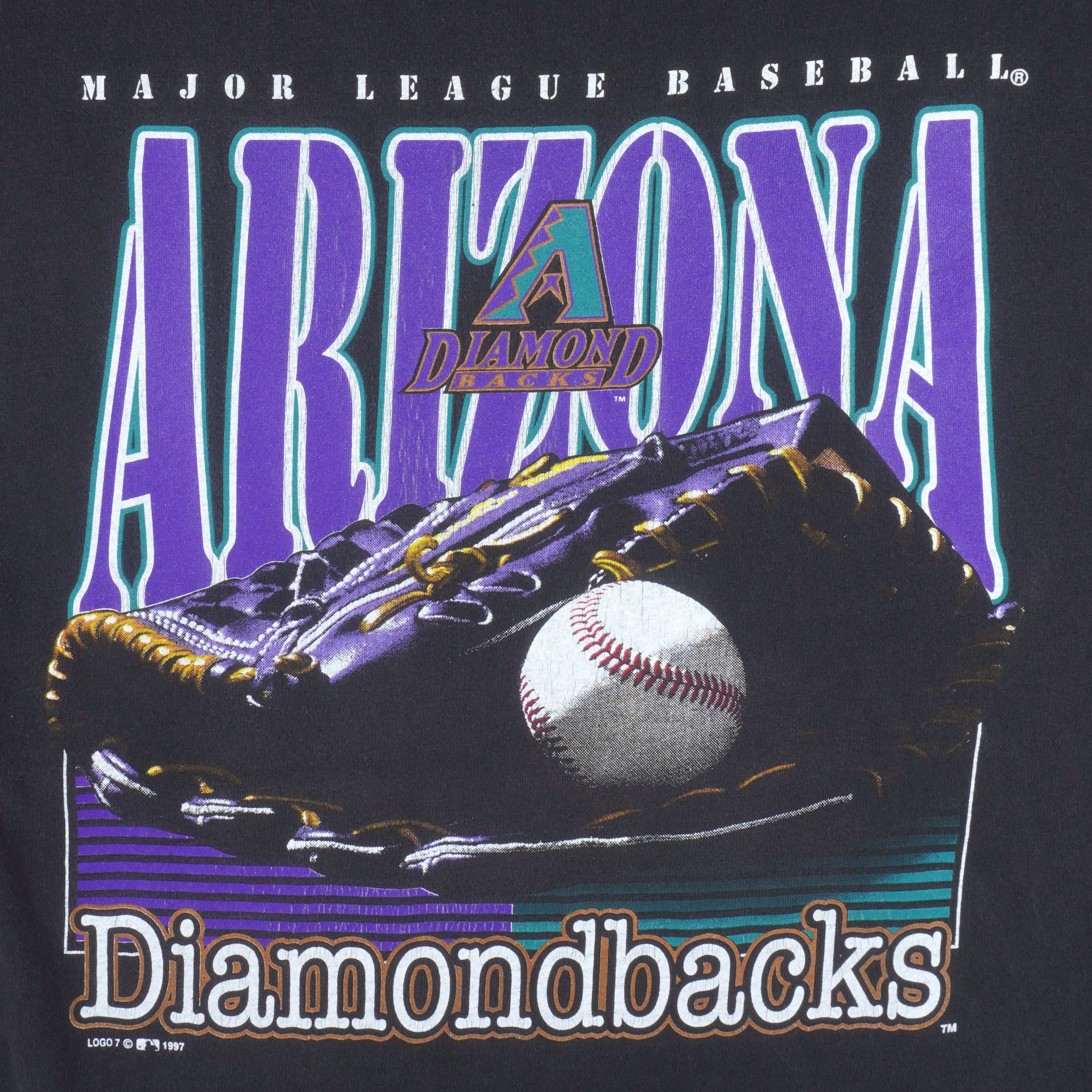 1997 Vintage MLB Arizona Diamondbacks Glove And Baseball Big Spell-Out & Logo T-Shirt by Logo 7. Black in color, fits X-large size and is in excellent condition.