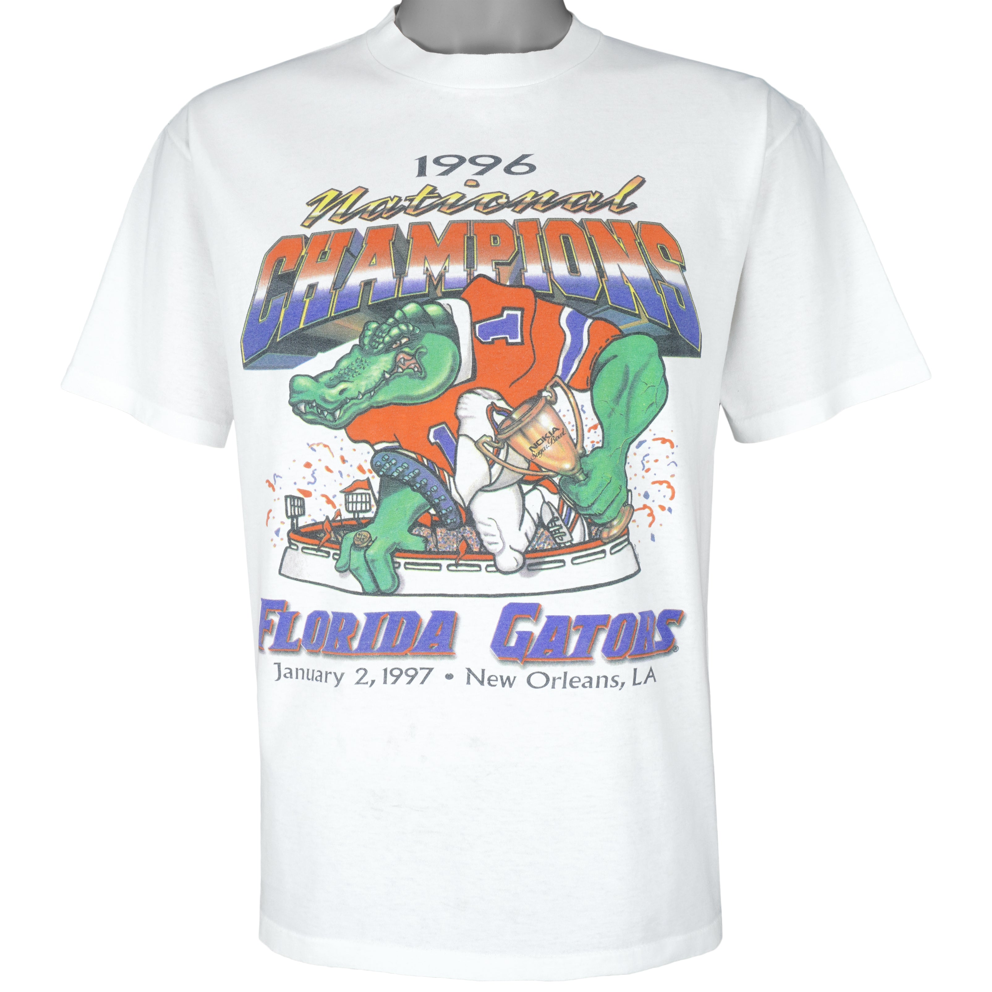 1996 Vintage NCAA Florida Gators National Champions T-Shirt by Power Pro. White in color, spell-out and logo on the front, fits large size and is in excellent condition.