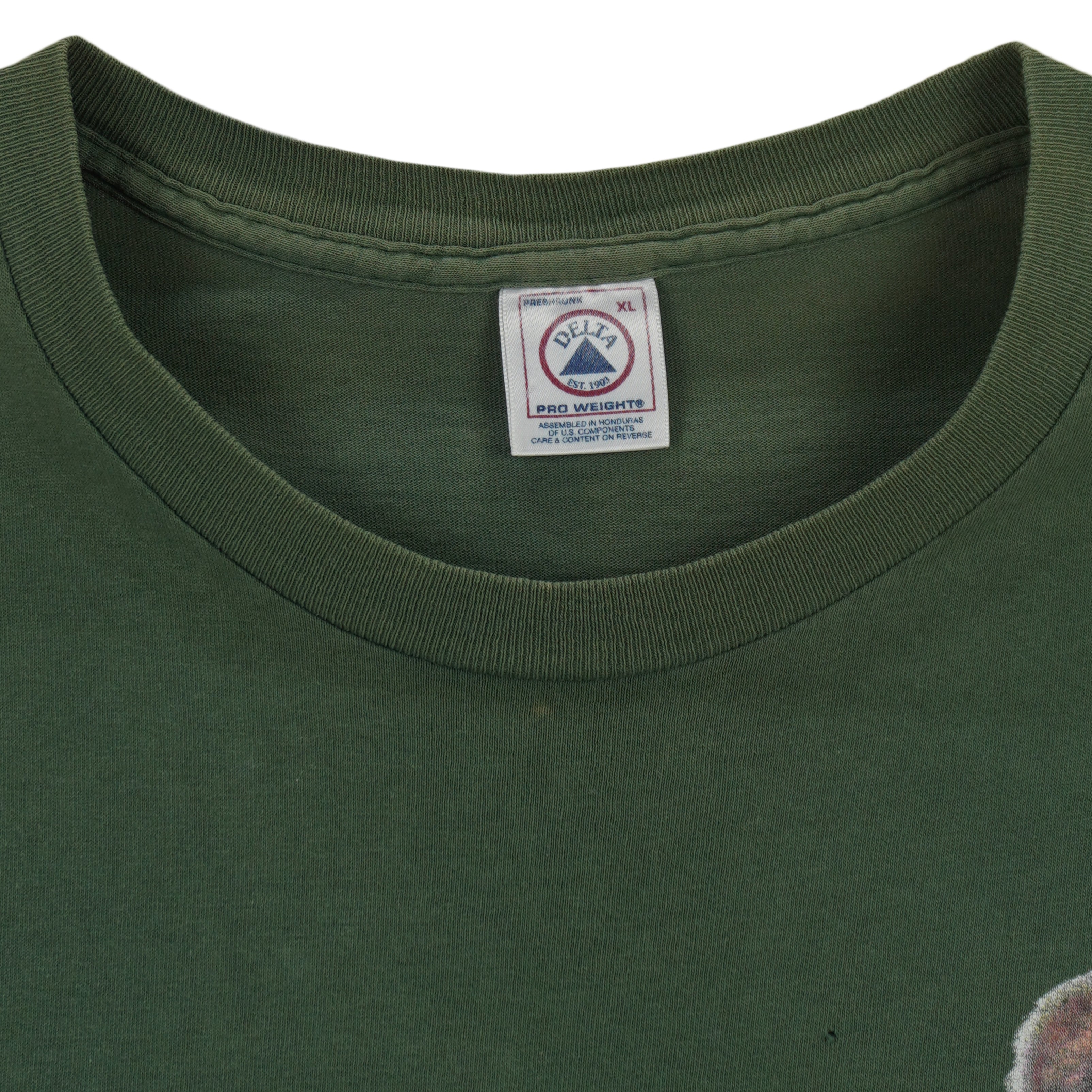 1990s Vintage Budweiser Lizards, You My Friend... Are One Incompetent Ferret Spell-Out T-Shirt by Delta. Green in color, fits an X-large size with sign of wear, small hole and marks on front and is otherwise in very good condition.