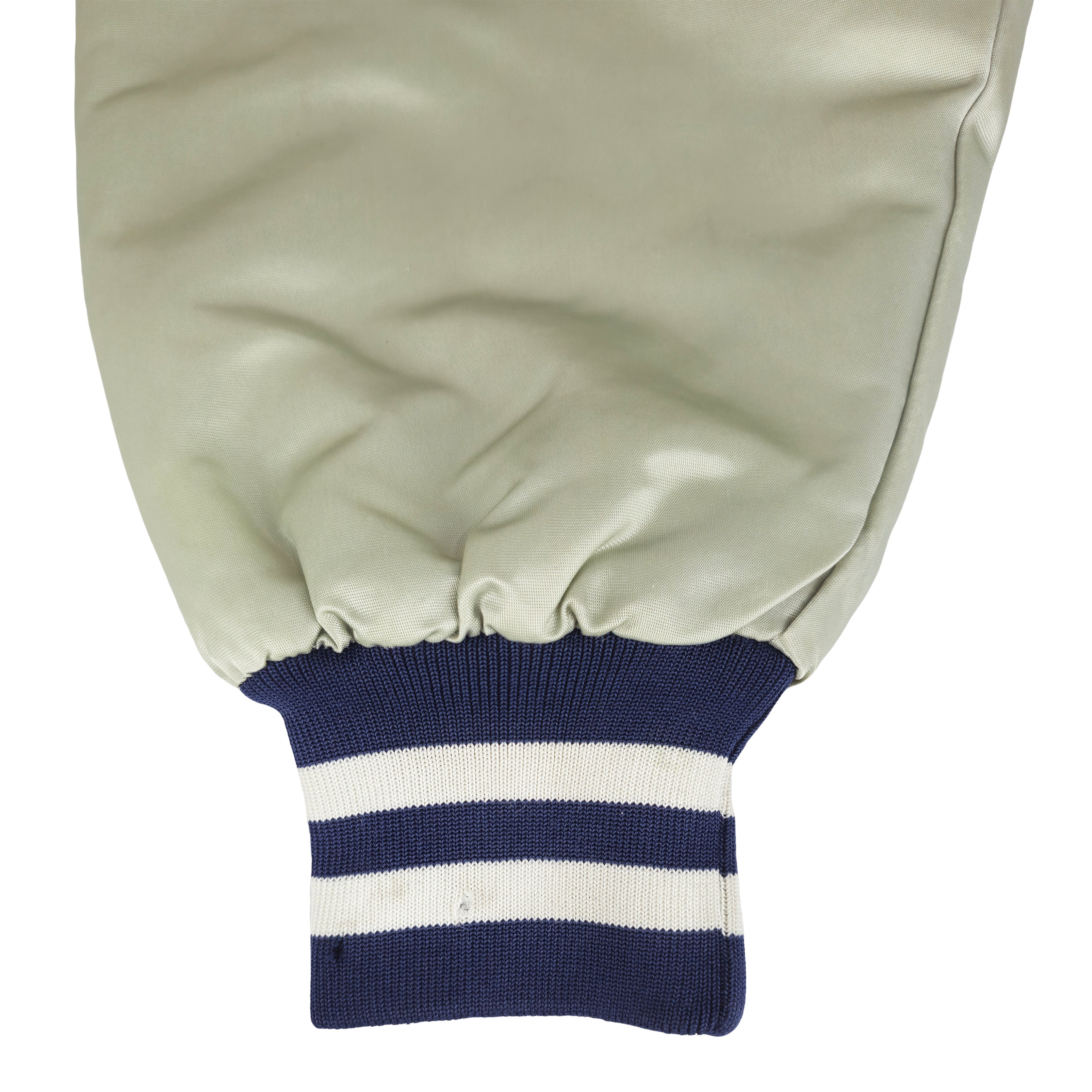 1980s Vintage MLB New York Yankees Big Logo Satin Jacket by Felco. Silver grey in color, tag is medium size but fits like a large with some minor wear on the cuff and is otherwise in excellent vintage condition.