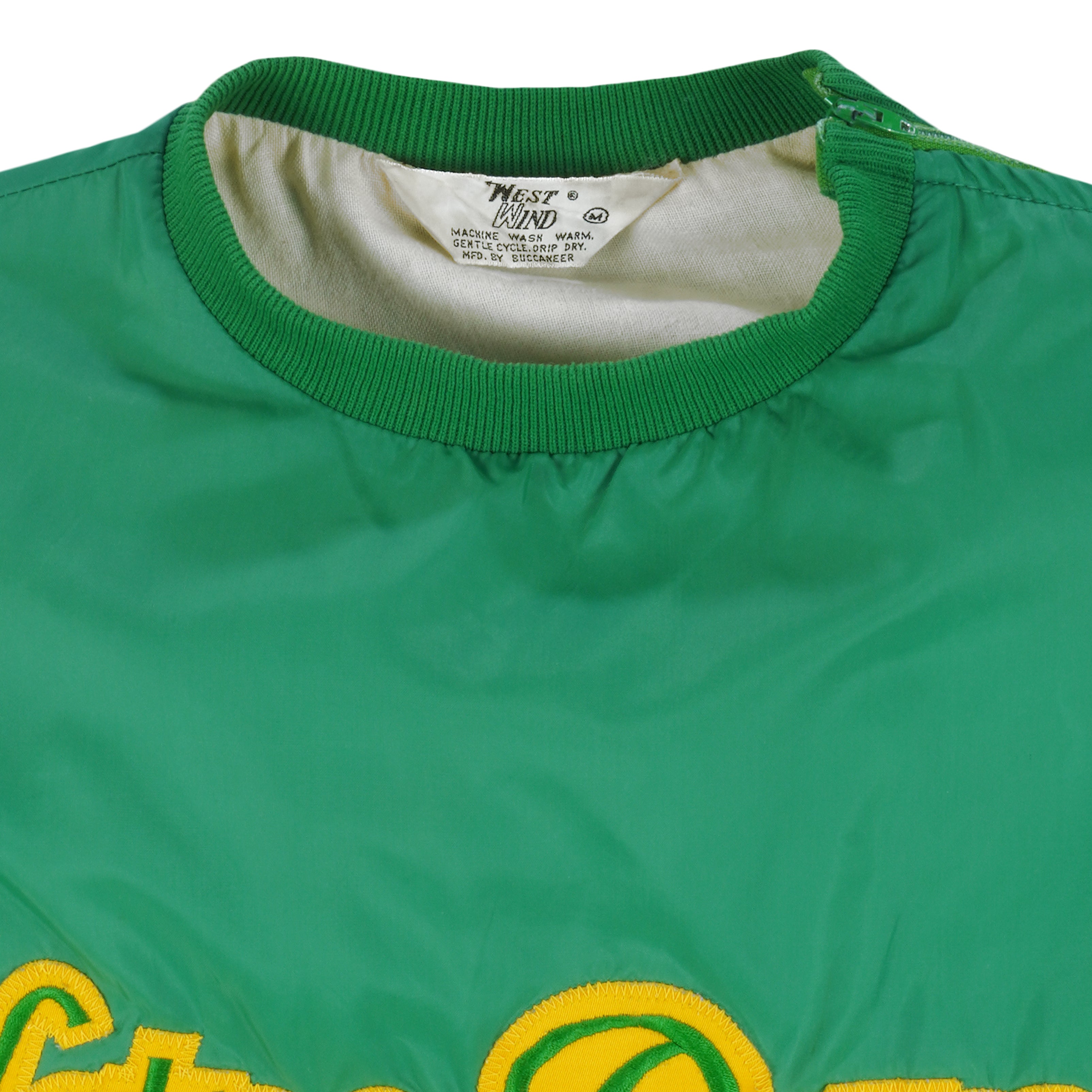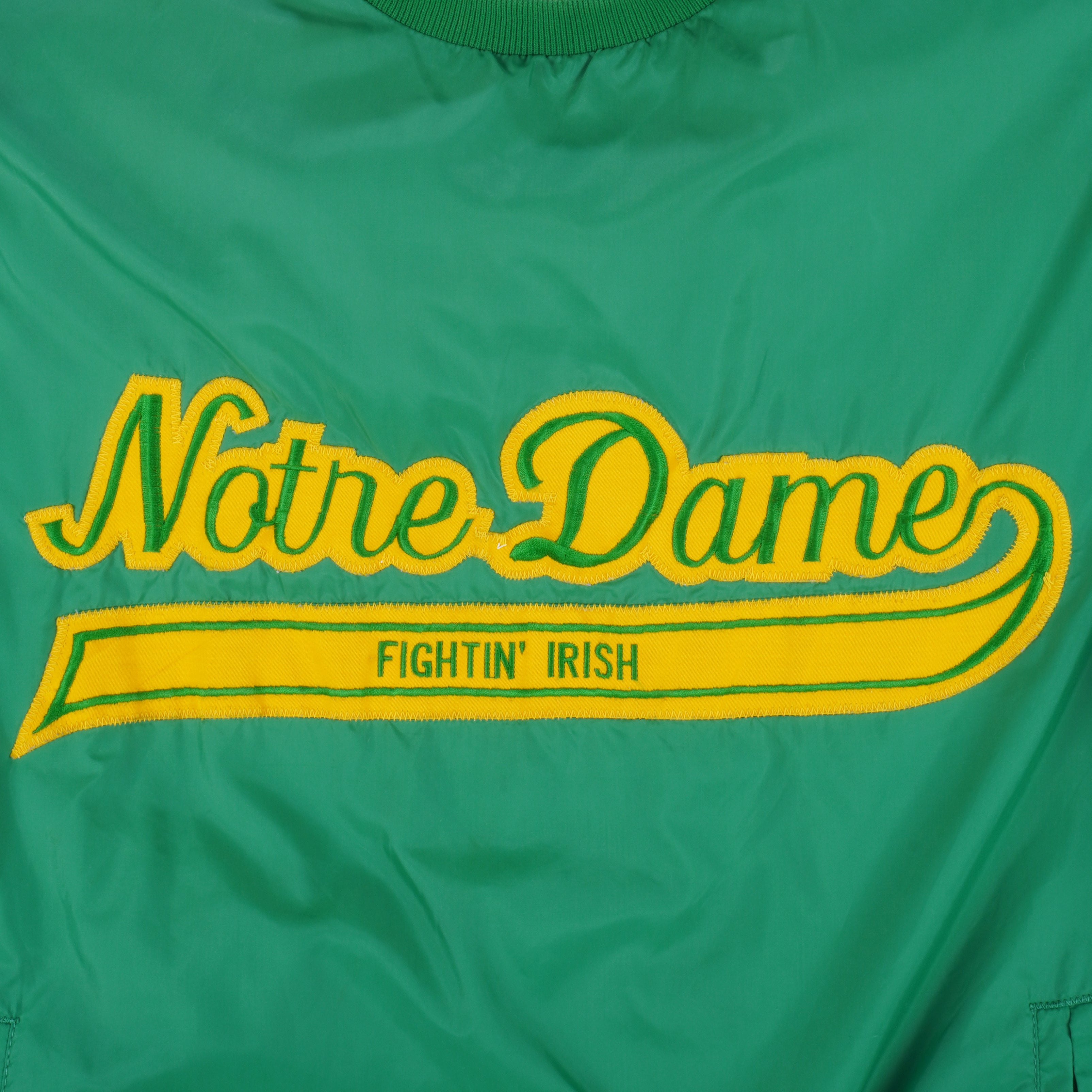 1990s Vintage NCAA Notre Dame Fighting Irish Embroidered Pullover Windbreaker by West Wind. Green in color, big spell-out, fits medium to large size, zip on shoulder and is in excellent condition.