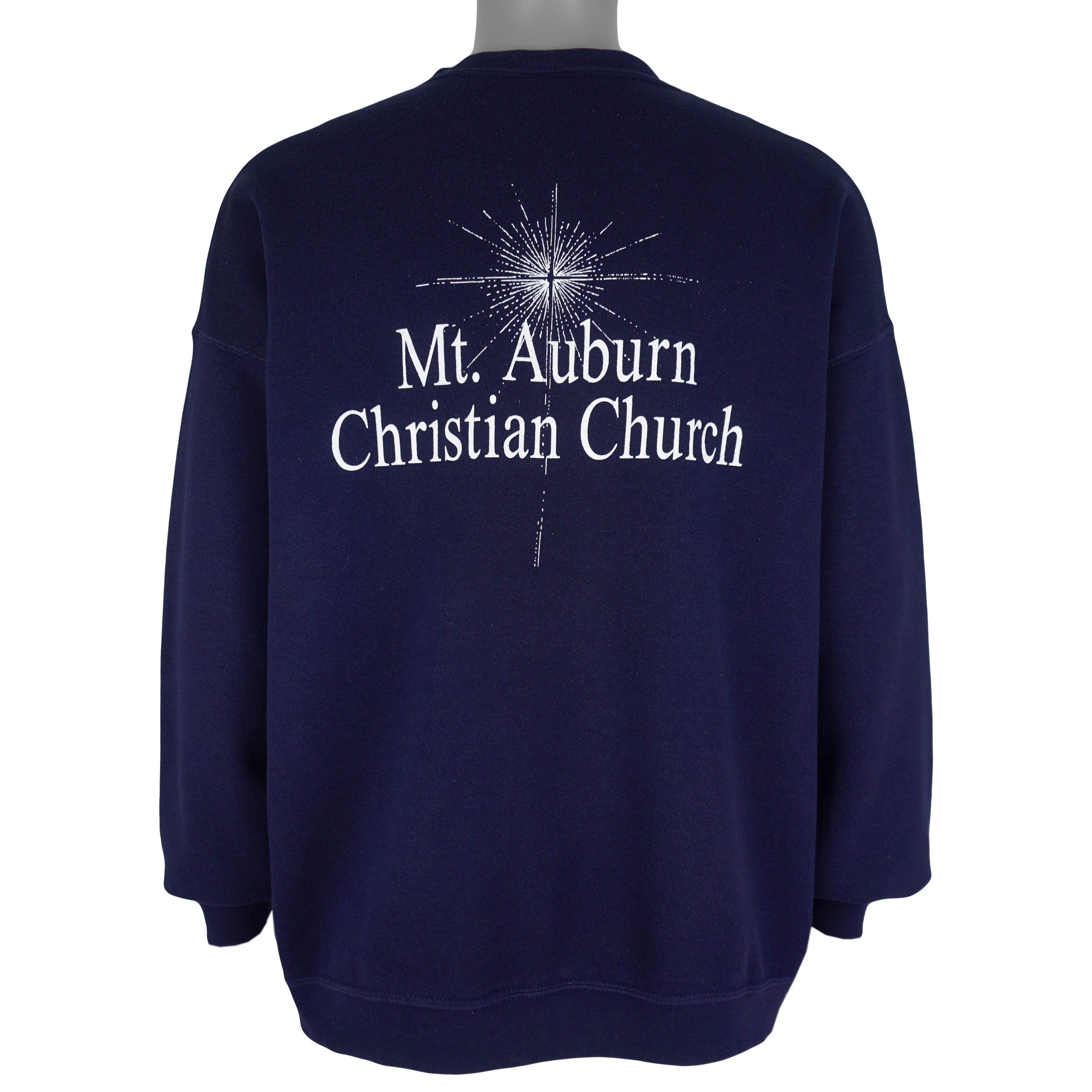 2001 Vintage Mt. Auburn Christian Church Crew Neck Sweatshirt by Lee. Blue in color, spell-out on front and back, fits an X-large size with signs of wear and is otherwise in good condition.